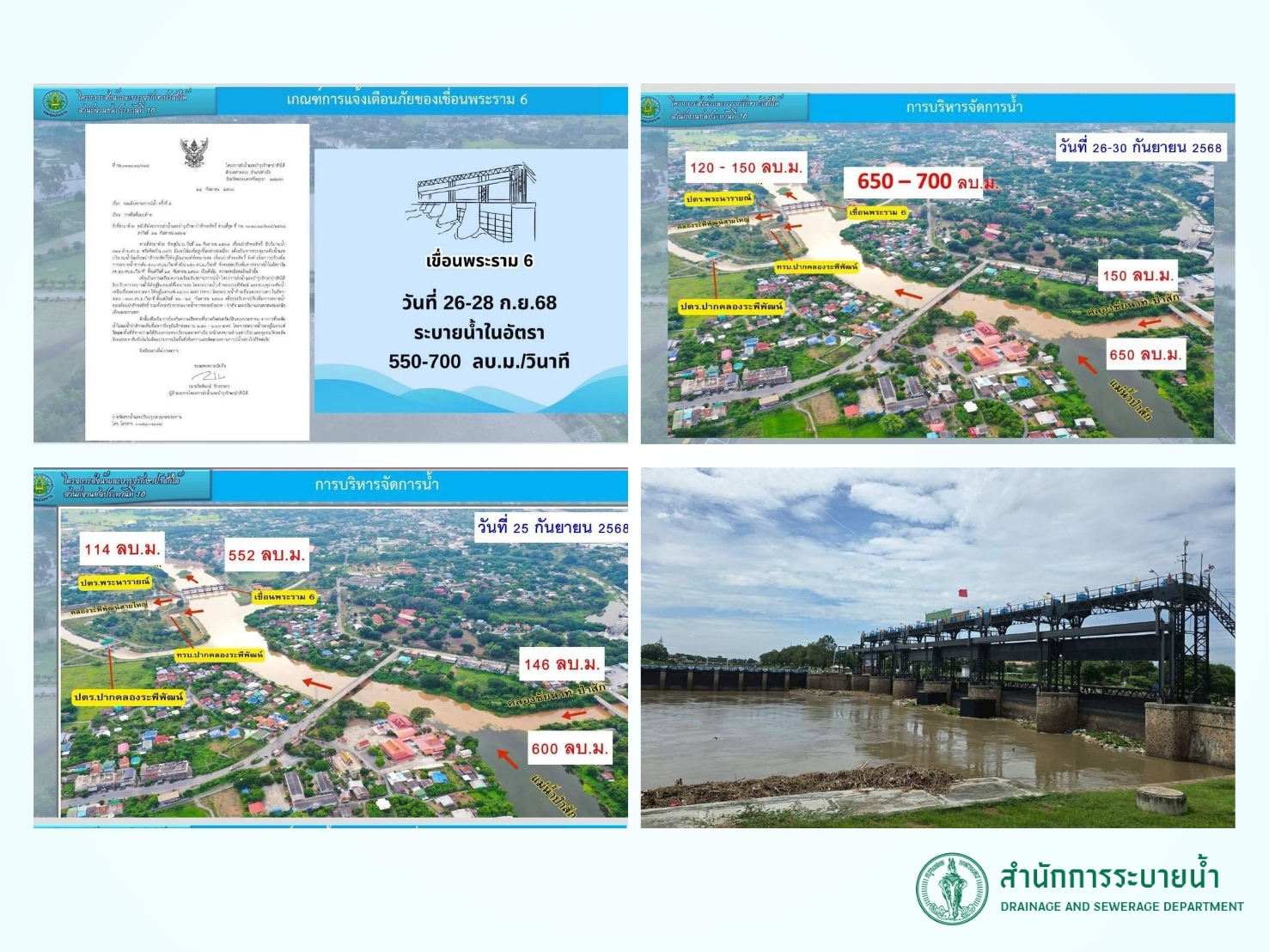 อย่างไรก็ตาม เพื่อควบคุมระดับน้ำเหนือเขื่อนพระราม 6 ให้อยู่ในเกณฑ์ที่เหมาะสม และเป็นการพร่องน้ำออกพื้นที่ล่วงหน้าเพื่อรองรับปริมาณน้ำที่กำลังจะไหลมาสมทบจากพื้นที่ตอนบน โครงการส่งน้ำและบำรุงรักษาป่าสักใต้ จึงได้มีการกำหนดแผนปรับเพิ่มอัตราการระบายน้ำโดยในช่วง วันที่ 26 – 28 กันยายน 2568 จะมีการปรับอัตราการระบายน้ำเพิ่มขึ้นเป็น 650-700 ลูกบาศก์เมตรต่อวินาที ซึ่งเป็นการบริหารจัดการน้ำอย่างรอบคอบ เพื่อป้องกันผลกระทบต่อพื้นที่ท้ายน้ำ