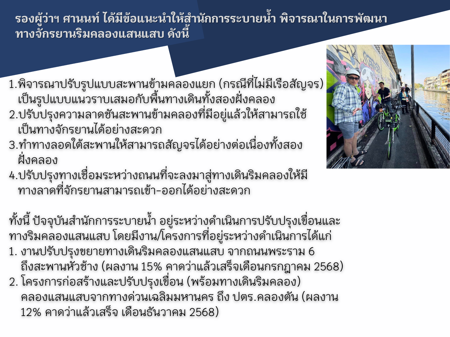 วันนี้ (12 ม.ค.68) นายศานนท์ หวังสร้างบุญ รองผู้ว่าราชการกรุงเทพมหานคร พร้อมด้วยผู้แทนสำนักการระบายน้ำ สำนักการจราจรและขนส่ง และกลุ่มผู้ใช้จักรยาน ได้ร่วมปั่นจักรยาน สำรวจเส้นทางเดิน ทางจักรยานริมคลองแสนแสบ จากท่าเรือผ่านฟ้าฯ ถึงประตูน้ำ