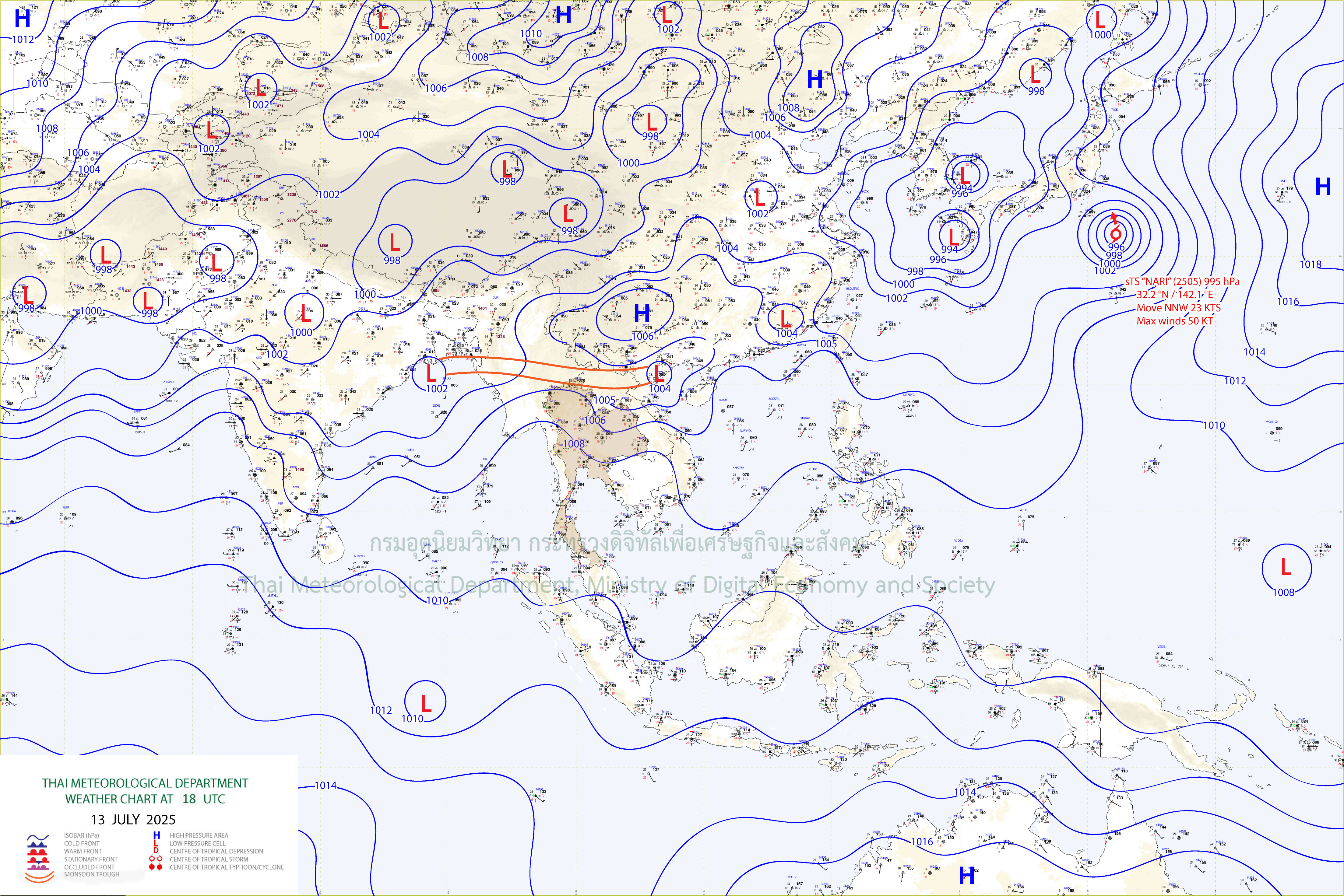 ลักษณะอากาศทั่วไป : พยากรณ์อากาศ 24 ชั่วโมงข้างหน้า ประเทศไทยยังคงมีฝนฟ้าคะนองและมีฝนตกหนักบางแห่ง ขอให้ประชาชนในบริเวณดังกล่าว โดยเฉพาะบริเวณจังหวัดแม่ฮ่องสอน เชียงใหม่ เชียงราย พะเยา น่าน หนองคาย และบึงกาฬ ระวังอันตรายจากฝนตกหนักและฝนที่ตกสะสม ซึ่งอาจทำให้เกิดน้ำท่วมฉับพลัน น้ำป่าไหลหลาก โดยเฉพาะพื้นที่ลาดเชิงเขาใกล้ทางน้ำไหลผ่านและพื้นที่ลุ่ม ทั้งนี้เนื่องจากมีร่องมรสุมพาดผ่านตอนบนของภาคเหนือ ประเทศลาวตอนบน เข้าสู่หย่อมความกดอากาศต่ำบริเวณประเทศเวียดนามตอนบน ประกอบกับมรสุมตะวันตกเฉียงใต้กำลังค่อนข้างแรงพัดปกคลุมทะเลอันดามัน ประเทศไทย และอ่าวไทย