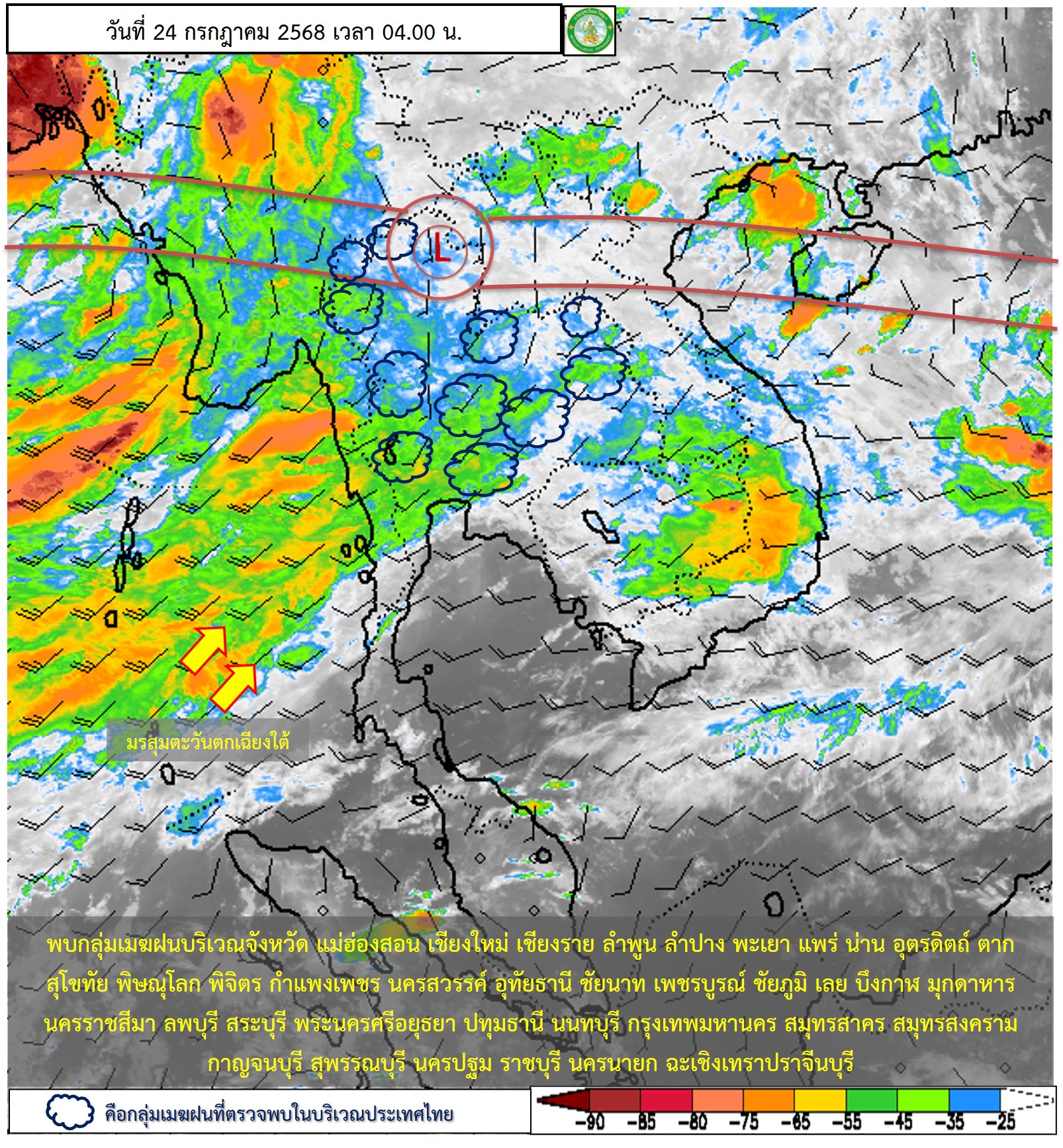 ลักษณะอากาศทั่วไป : พยากรณ์อากาศ 24 ชั่วโมงข้างหน้า ภาคเหนือ และด้านตะวันตกของประเทศไทยตอนบนมีฝนตกหนักมากบางแห่ง โดยเฉพาะบริเวณจังหวัดแม่ฮ่องสอน เชียงใหม่ ตาก และกาญจนบุรี ในขณะที่ประเทศไทยมีฝนตกหนักบางพื้นที่ กับมีลมแรง ขอให้ประชาชนในบริเวณดังกล่าวระวังอันตรายจากฝนตกหนักถึงหนักมากและฝนที่ตกสะสม ซึ่งอาจทำให้เกิดน้ำท่วมฉับพลัน น้ำป่าไหลหลาก และน้ำล้นตลิ่ง โดยเฉพาะพื้นที่ลาดเชิงเขาใกล้ทางน้ำไหลผ่านและพื้นที่ลุ่ม ทั้งนี้เนื่องจากมีหย่อมความกดอากาศต่ำบริเวณประเทศเมียนมา และแนวร่องมรสุมที่พาดผ่านตอนบนของภาคเหนือ ประเทศลาวตอนบน เข้าสู่หย่อมความกดอากาศต่ำบริเวณประเทศเวียดนามตอนบน ในขณะที่มรสุมตะวันตกเฉียงใต้กำลังแรงพัดปกคลุมทะเลอันดามัน ประเทศไทย และอ่าวไทย สำหรับคลื่นลมบริเวณทะเลอันดามันตอนบน และอ่าวไทยตอนบนมีกำลังค่อนข้างแรง โดยมีคลื่นสูง 2-3 เมตร บริเวณที่มีฝนฟ้าคะนองคลื่นสูงมากกว่า 3 เมตร ส่วนทะเลอันดามันตอนล่างมีคลื่นสูงประมาณ 2 เมตร บริเวณที่มีฝนฟ้าคะนองคลื่นสูงมากกว่า 2 เมตร ขอให้ชาวเรือบริเวณทะเลอันดามันและอ่าวไทยเดินเรือด้วยความระมัดระวังและหลีกเลี่ยงการเดินเรือในบริเวณที่มีฝนฟ้าคะนอง ส่วนเรือเล็กบริเวณทะเลอันดามันตอนบนและอ่าวไทยตอนบนควรงดออกจากฝั่ง