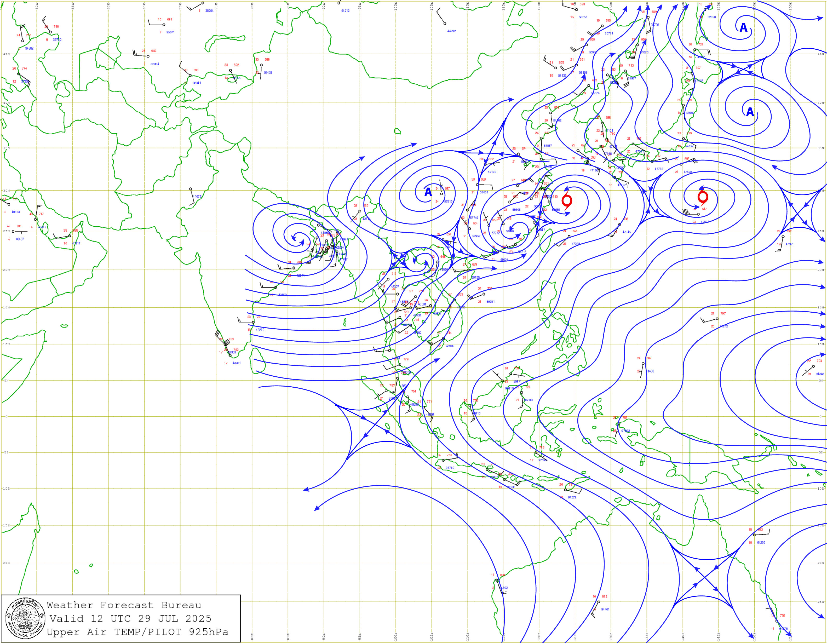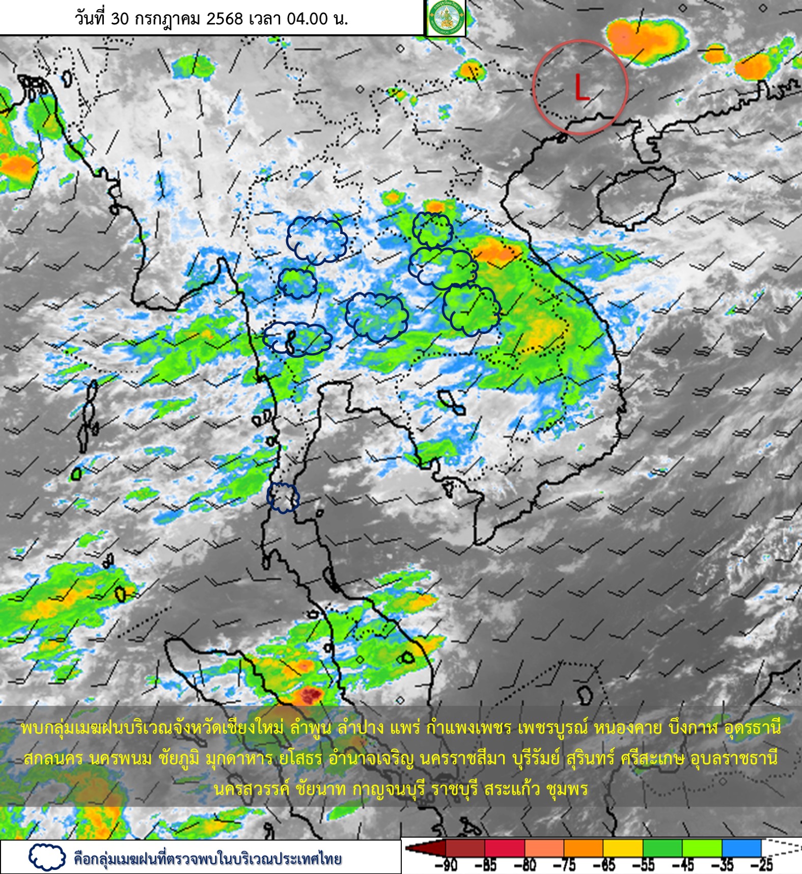 ลักษณะอากาศทั่วไป : พยากรณ์อากาศ 24 ชั่วโมงข้างหน้า ภาคเหนือตอนบน ภาคตะวันออกเฉียงเหนือตอนบน ภาคกลาง และภาคตะวันออก มีฝนตกหนักบางแห่ง โดยเฉพาะบริเวณจังหวัดเชียงราย พะเยา น่าน ตาก บึงกาฬ สกลนคร และนครพนม ขอให้ประชาชนในบริเวณดังกล่าวระวังอันตรายจากฝนตกหนักและฝนที่ตกสะสม ซึ่งอาจทำให้เกิดน้ำท่วมฉับพลัน น้ำป่าไหลหลาก และน้ำล้นตลิ่ง โดยเฉพาะพื้นที่ลาดเชิงเขาใกล้ทางน้ำไหลผ่านและพื้นที่ลุ่ม ทั้งนี้เนื่องจากมีหย่อมความกดอากาศต่ำปกคลุมบริเวณประเทศเวียดนามตอนบน ประกอบกับมรสุมตะวันตกเฉียงใต้กำลังปานกลางพัดปกคลุมทะเลอันดามันประเทศไทย และอ่าวไทย
