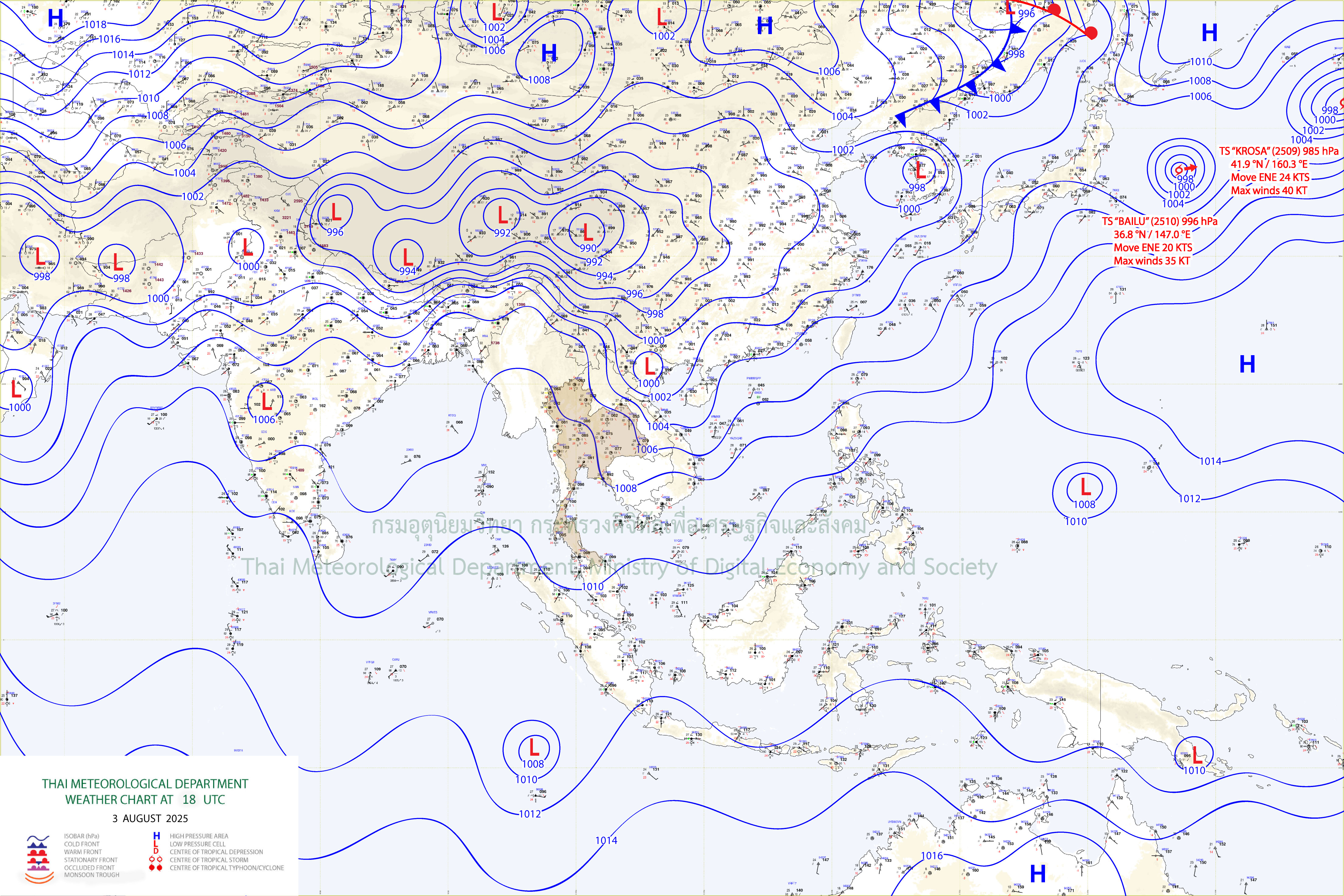 ลักษณะอากาศทั่วไป : พยากรณ์อากาศ 24 ชั่วโมงข้างหน้า ประเทศไทยตอนบนมีฝนน้อย เนื่องจากมรสุมตะวันตกเฉียงใต้กำลังอ่อนยังคงพัดปกคลุมทะเลอันดามัน ประเทศไทย และอ่าวไทย ในขณะที่มีหย่อมความกดอากาศต่ำปกคลุมบริเวณประเทศเวียดนามตอนบนสำหรับคลื่นลมบริเวณทะเลอันดามันและอ่าวไทยมีกำลังอ่อน โดยบริเวณทะเลอันดามันตอนบนมีคลื่นสูง 1-2 เมตร บริเวณที่มีฝนฟ้าคะนองคลื่นสูงมากกว่า 2 เมตร ขอให้ชาวเรือบริเวณทะเลอันดามันและอ่าวไทยเดินเรือด้วยความระมัดระวัง และหลีกเลี่ยงการเดินเรือในบริเวณที่มีฝนฟ้าคะนอง