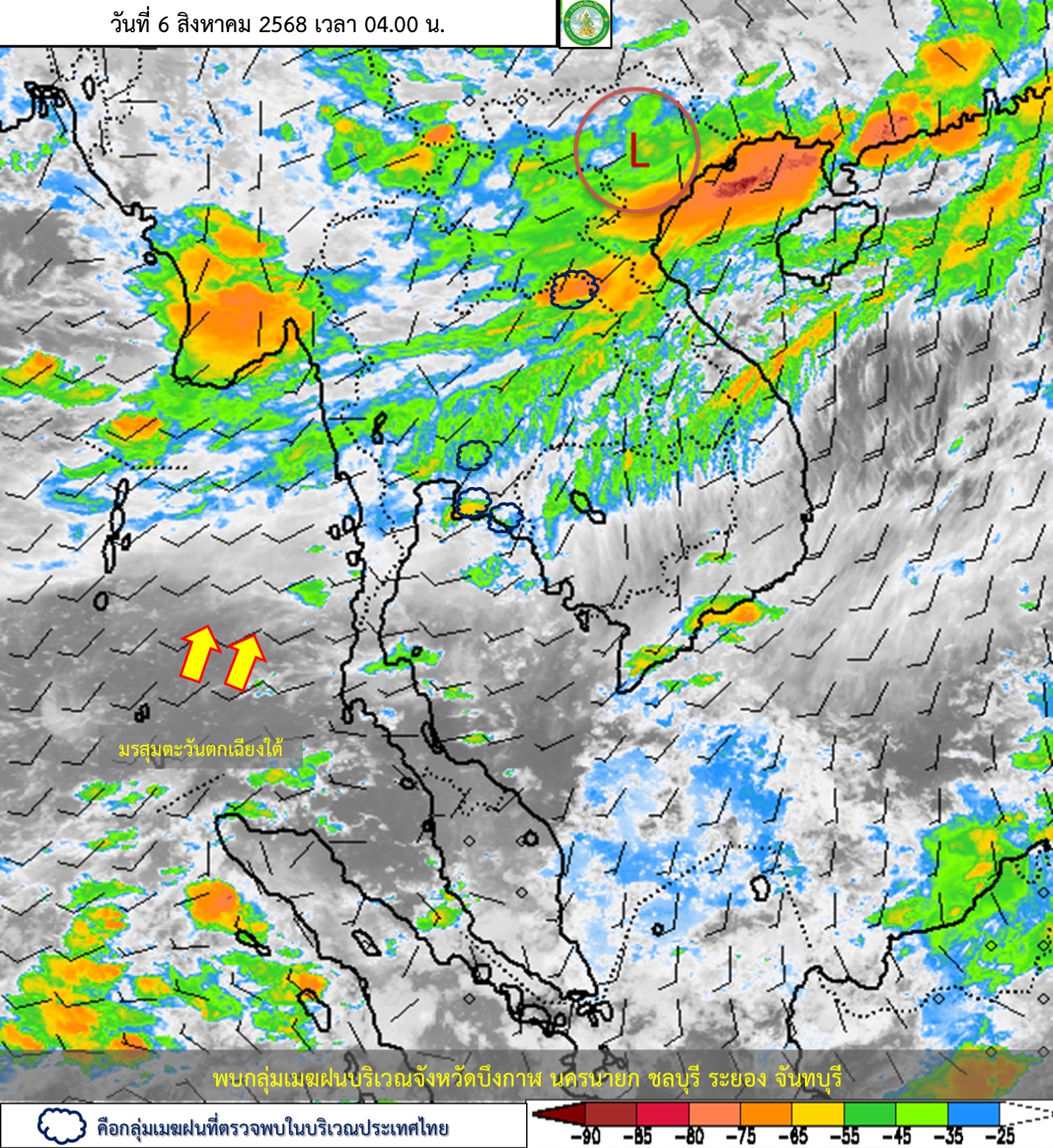 ลักษณะอากาศทั่วไป : พยากรณ์อากาศ 24 ชั่วโมงข้างหน้า ประเทศไทยตอนบนมีฝนฟ้าคะนองกับมีลมกระโชกแรงบางแห่ง โดยมีฝนตกหนักบางพื้นที่ในบริเวณจังหวัดแม่ฮ่องสอน เชียงใหม่ เชียงราย ลำปาง พะเยา น่าน หนองคาย บึงกาฬ นครพนม สุราษฎร์ธานี นครศรีธรรมราช สงขลา ปัตตานี ยะลา นราธิวาส ระนอง พังงา ตรัง และสตูล ขอให้ประชาชนในบริเวณดังกล่าวระวังอันตรายจากฝนฟ้าคะนอง ลมกระโชกแรง และฝนตกหนักที่อาจจะเกิดขึ้นไว้ด้วย เนื่องจากมีหย่อมความกดอากาศต่ำปกคลุมบริเวณประเทศเวียดนามตอนบน ประกอบกับมรสุมตะวันตกเฉียงใต้ยังคงพัดปกคลุมทะเลอันดามัน ประเทศไทย และอ่าวไทย สำหรับคลื่นลมบริเวณทะเลอันดามันตอนบนมีกำลังปานกลาง โดยมีคลื่นสูง 1-2 เมตร บริเวณที่มีฝนฟ้าคะนองคลื่นสูงมากกว่า 2 เมตร ขอให้ชาวเรือบริเวณทะเลอันดามันและอ่าวไทยเดินเรือด้วยความระมัดระวัง และหลีกเลี่ยงการเดินเรือในบริเวณที่มีฝนฟ้าคะนอง
