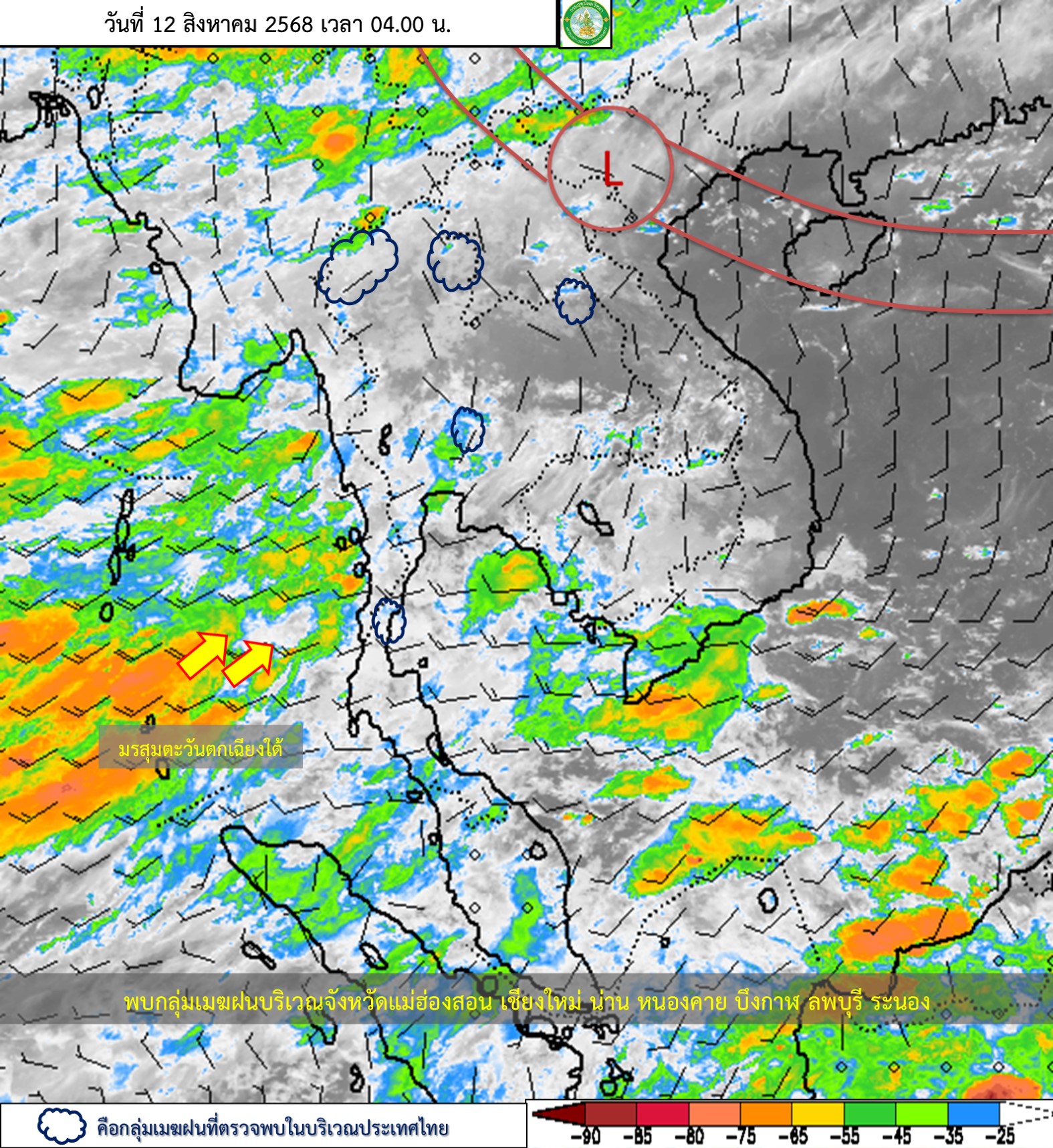 ลักษณะอากาศทั่วไป : พยากรณ์อากาศ 24 ชั่วโมงข้างหน้า ประเทศไทยมีฝนตกหนักบางแห่ง โดยมีฝนตกหนักมากบางพื้นที่บริเวณภาคตะวันออก ขอให้ประชาชนบริเวณประเทศไทยระวังอันตรายจากฝนตกหนักถึงหนักมากและฝนที่ตกสะสม ซึ่งอาจทำให้เกิดน้ำท่วมฉับพลันและน้ำป่าไหลหลาก โดยเฉพาะพื้นที่ลาดเชิงเขาใกล้ทางน้ำไหลผ่านและพื้นที่ลุ่มไว้ด้วย เนื่องจากมีร่องมรสุมพาดผ่านตอนบนของภาคเหนือ ประเทศลาวตอนบน เข้าสู่หย่อมความกดอากาศต่ำบริเวณประเทศเวียดนามตอนบน ประกอบกับมรสุมตะวันตกเฉียงใต้กำลังปานกลางพัดปกคลุมทะเลอันดามัน ประเทศไทย และอ่าวไทย สำหรับคลื่นลมบริเวณทะเลอันดามันและอ่าวไทยตอนบนมีกำลังปานกลาง โดยทะเลอันดามันตอนบนและอ่าวไทยตอนบน มีคลื่นสูงประมาณ 2 เมตร บริเวณที่มีฝนฟ้าคะนองคลื่นสูงมากกว่า 2 เมตร ส่วนทะเลอันดามันตอนล่างมีคลื่นสูง 1 - 2 เมตร บริเวณที่มีฝนฟ้าคะนองคลื่นสูงมากกว่า 2 เมตร ขอให้ชาวเรือบริเวณทะเลอันดามันและอ่าวไทยเดินเรือด้วยความระมัดระวัง และหลีกเลี่ยงการเดินเรือในบริเวณที่มีฝนฟ้าคะนองไว้ด้วย อนึ่ง พายุไต้ฝุ่น “โพดุล” (PODUL) บริเวณมหาสมุทรแปซิฟิก คาดว่าจะเคลื่อนผ่านเกาะไต้หวัน และเคลื่อนขึ้นฝั่งบริเวณด้านตะวันออกของประเทศจีนในช่วงวันที่ 13 – 14 ส.ค. โดยพายุนี้ไม่เคลื่อนเข้าสู่ประเทศไทย