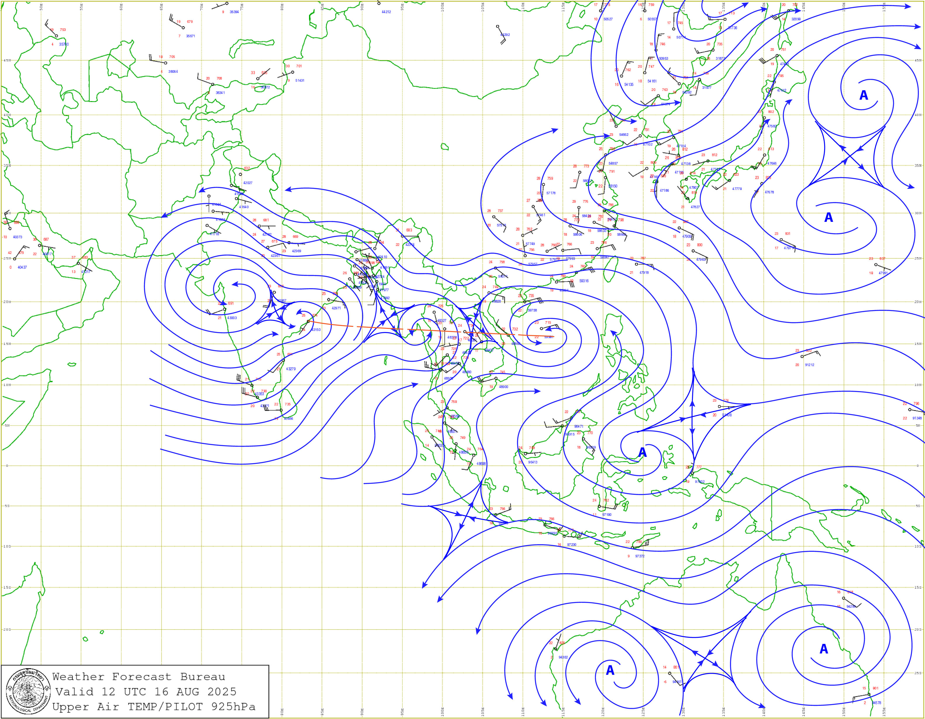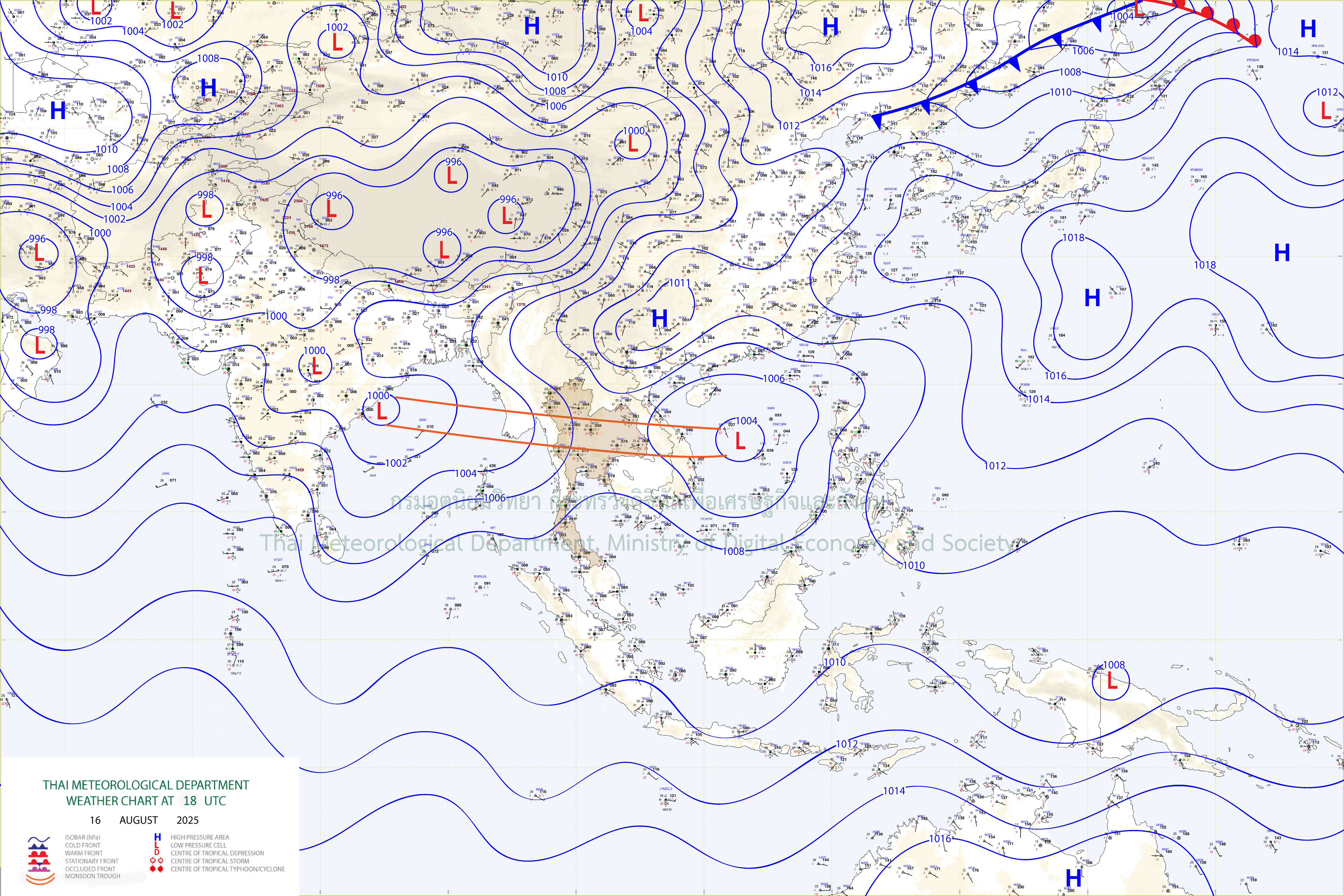 ลักษณะอากาศทั่วไป : พยากรณ์อากาศ 24 ชั่วโมงข้างหน้า ประเทศไทยมีฝนอยู่ในเกณฑ์กระจายถึงเกือบทั่วไปและมีฝนตกหนักบางแห่ง โดยมีฝนตกหนักมากบางพื้นที่ในภาคตะวันออก ขอให้ประชาชนโดยเฉพาะบริเวณจังหวัดแม่ฮ่องสอน ตาก พิษณุโลก เพชรบูรณ์ จันทบุรี และตราด ระวังอันตรายจากฝนตกหนักถึงหนักมากและฝนที่ตกสะสม ซึ่งอาจทำให้เกิดน้ำท่วมฉับพลันและน้ำป่าไหลหลาก โดยเฉพาะพื้นที่ลาดเชิงเขาใกล้ทางน้ำไหลผ่านและพื้นที่ลุ่ม เนื่องจากร่องมรสุมพาดผ่านภาคเหนือตอนล่าง และภาคตะวันออกเฉียงเหนือเข้าสู่หย่อมความกดอากาศต่ำกำลังแรงบริเวณทะเลจีนใต้ตอนบน ประกอบกับมรสุมตะวันตกเฉียงใต้กำลังค่อนข้างแรงพัดปกคลุมทะเลอันดามัน ประเทศไทย และอ่าวไทย สำหรับคลื่นลมบริเวณทะเลอันดามันตอนบนมีกำลังค่อนข้างแรง โดยมีคลื่นสูง 2-3 เมตร บริเวณที่มีฝนฟ้าคะนองคลื่นสูงมากกว่า 3 เมตร ส่วนทะเลอันดามันตอนล่างและอ่าวไทยตอนบนมีคลื่นสูงประมาณ 2 เมตร บริเวณที่มีฝนฟ้าคะนองคลื่นสูงมากกว่า 2 เมตร ขอให้ชาวเรือเดินเรือด้วยความระมัดระวังและหลีกเลี่ยงการเดินเรือในบริเวณที่มีฝนฟ้าคะนอง สำหรับเรือเล็กบริเวณทะเลอันดามันตอนบนควรงดออกจากฝั่งจนถึงวันที่ 17 ส.ค. นี้ไว้ด้วย