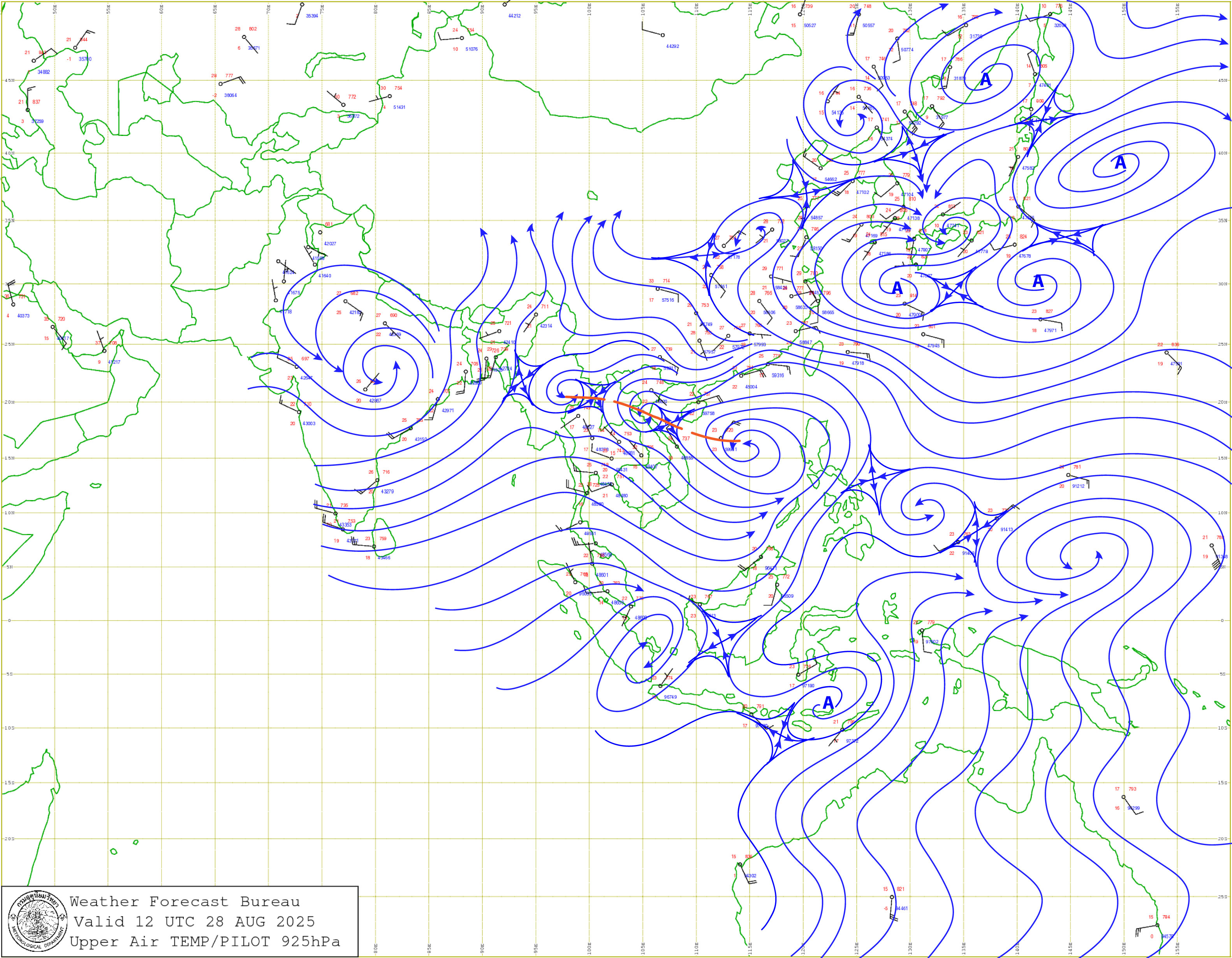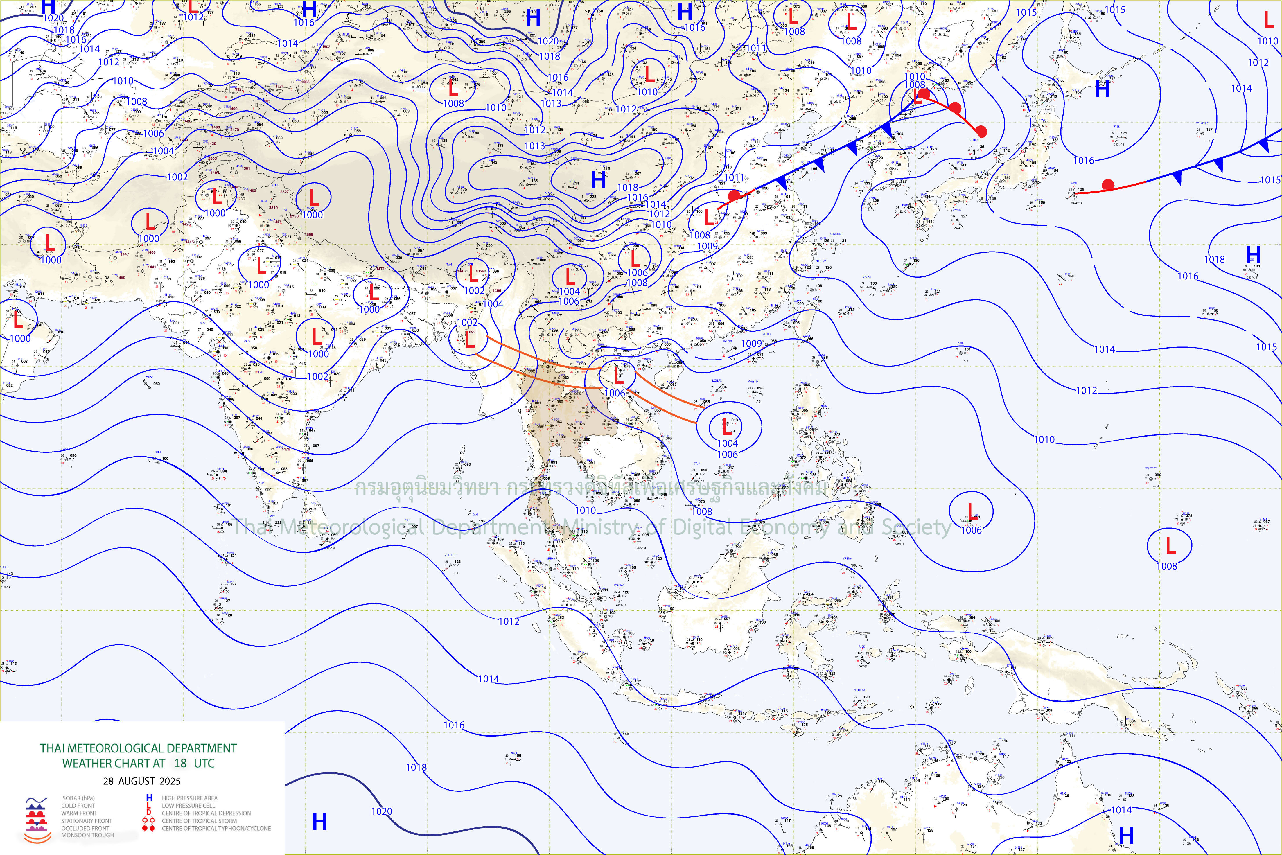 ลักษณะอากาศทั่วไป : พยากรณ์อากาศ 24 ชั่วโมงข้างหน้า ประเทศไทยยังคงมีฝนฟ้าคะนอง และมีฝนตกหนักบางแห่งบริเวณภาคเหนือ ภาคตะวันออกเฉียงเหนือ และภาคใต้ฝั่งตะวันตก ขอให้ประชาชนโดยเฉพาะบริเวณจังหวัดแม่ฮ่องสอน เชียงใหม่ เชียงราย และน่าน ระวังอันตรายจากฝนตกหนัก และฝนที่ตกสะสม ซึ่งอาจทำให้เกิดน้ำท่วมฉับพลัน และน้ำป่าไหลหลาก โดยเฉพาะพื้นที่ลาดเชิงเขาใกล้ทางน้ำไหลผ่านและพื้นที่ลุ่ม เนื่องจากร่องมรสุมพาดผ่านภาคเหนือตอนบนเข้าสู่หย่อมความกดอากาศต่ำบริเวณประเทศลาวและเวียดนามตอนบน ประกอบกับมรสุมตะวันตกเฉียงใต้กำลังปานกลางพัดปกคลุมทะเลอันดามัน ประเทศไทย และอ่าวไทย