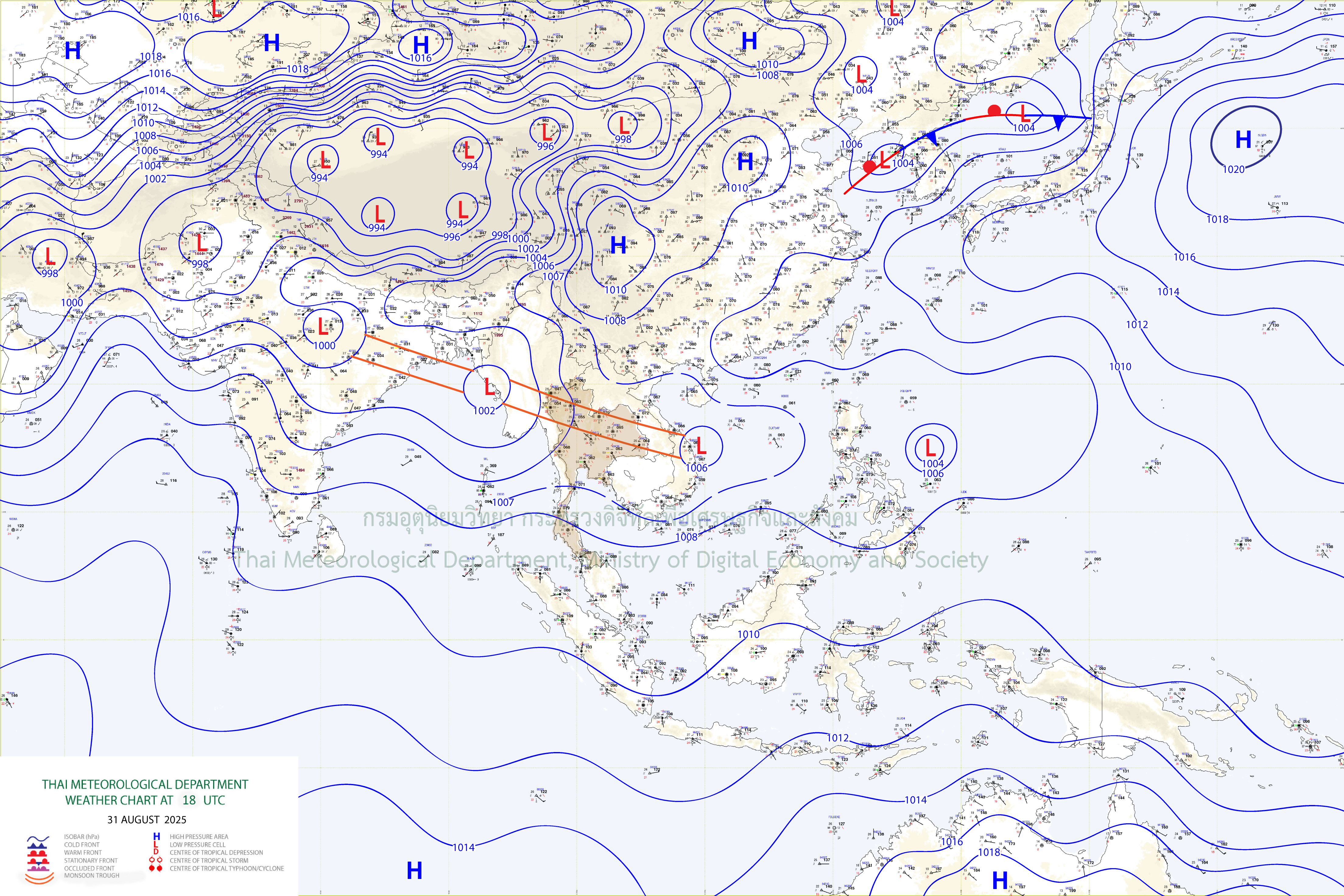 ลักษณะอากาศทั่วไป : พยากรณ์อากาศ 24 ชั่วโมงข้างหน้า ภาคเหนือ ภาคตะวันออกเฉียงเหนือ ภาคกลางรวมทั้งกรุงเทพมหานครและปริมณฑล ยังคงมีฝนตกหนักบางพื้นที่ โดยภาคตะวันออกและภาคใต้ฝั่งตะวันตกมีฝนตกหนักมากบางแห่ง ขอให้ประชาชนโดยเฉพาะบริเวณจังหวัดลำปาง สุโขทัย กำแพงเพชร ลำพูน เชียงใหม่ ตาก แม่ฮ่องสอน อุดรธานี หนองบัวลำภู เลย ตราด ระนอง และพังงา ระวังอันตรายจากฝนตกหนักถึงหนักมากและฝนที่ตกสะสม ซึ่งอาจทำให้เกิดน้ำท่วมฉับพลันและน้ำป่าไหลหลาก โดยเฉพาะพื้นที่ลาดเชิงเขาใกล้ทางน้ำไหลผ่าน และพื้นที่ลุ่ม เนื่องจากร่องมรสุมพาดผ่านภาคเหนือ และภาคตะวันออกเฉียงเหนือ ประกอบกับมรสุมตะวันตกเฉียงใต้กำลังค่อนข้างแรงพัดปกคลุมทะเลอันดามัน ประเทศไทย และอ่าวไทย สำหรับคลื่นลมบริเวณทะเลอันดามันตอนบนและอ่าวไทยตอนบนมีกำลังค่อนข้างแรง โดยมีคลื่นสูง 2-3 เมตร บริเวณที่มีฝนฟ้าคะนองคลื่นสูงมากกว่า 3 เมตร ทะเลอันดามันตอนล่างมีคลื่นสูงประมาณ 2 เมตร บริเวณที่มีฝนฟ้าคะนองคลื่นสูงมากกว่า 2 เมตร ขอให้ชาวเรือเดินเรือด้วยความระมัดระวังและหลีกเลี่ยงการเดินเรือในบริเวณที่มีฝนฟ้าคะนอง ส่วนเรือเล็กบริเวณทะเลอันดามันตอนบนและอ่าวไทยตอนบนควรงดออกจากฝั่งจนถึงวันที่ 2 ก.ย. 68