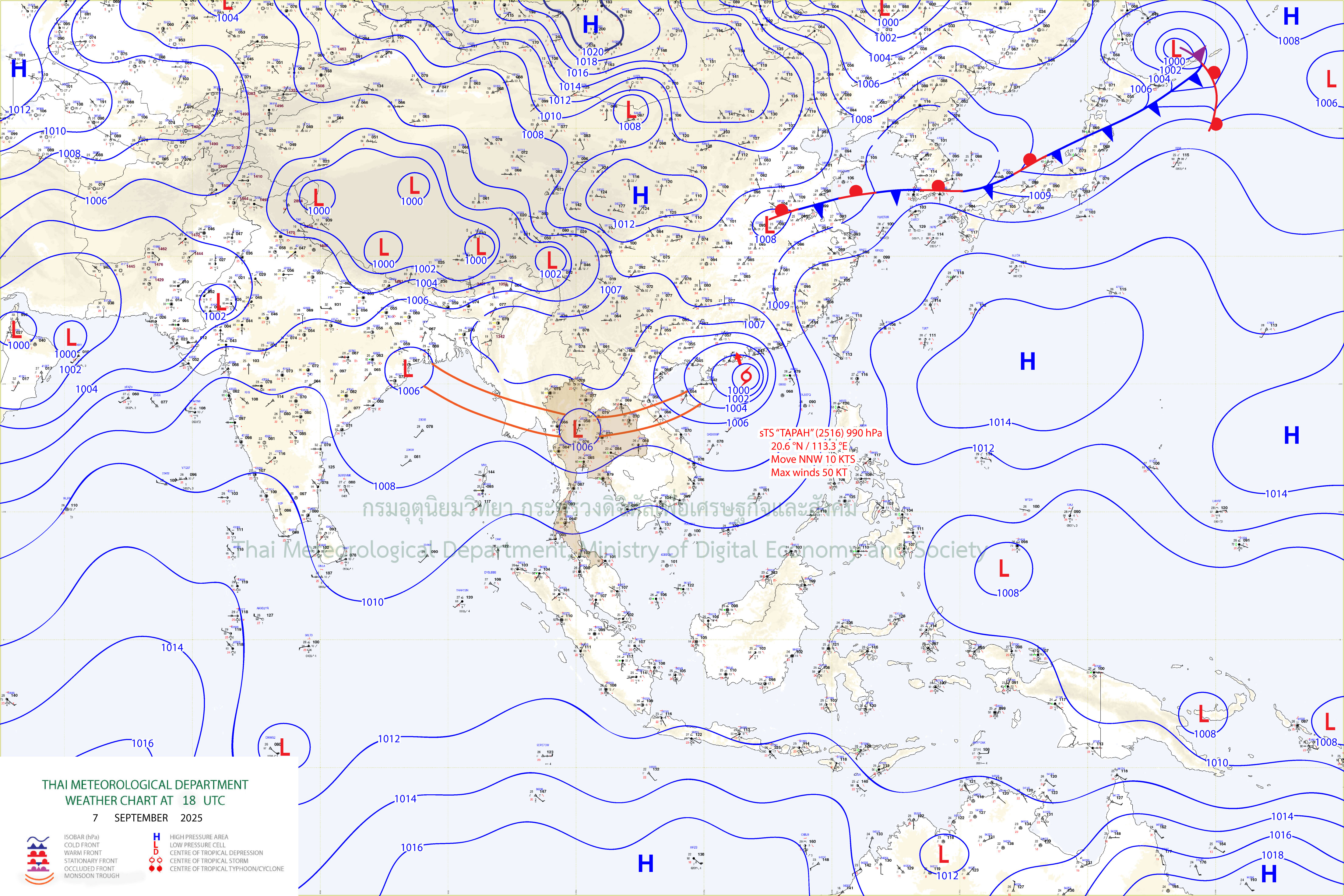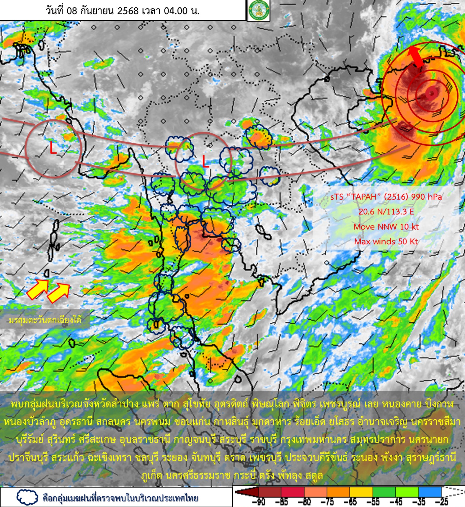 อนึ่ง พายุโซนร้อนกำลังแรง “ตาปะฮ์” (TAPAH) บริเวณทะเลจีนใต้ตอนบน มีแนวโน้มจะเคลื่อนขึ้นฝั่งบริเวณประเทศจีนตอนใต้ในวันนี้ (8 ก.ย. 68) โดยพายุนี้
