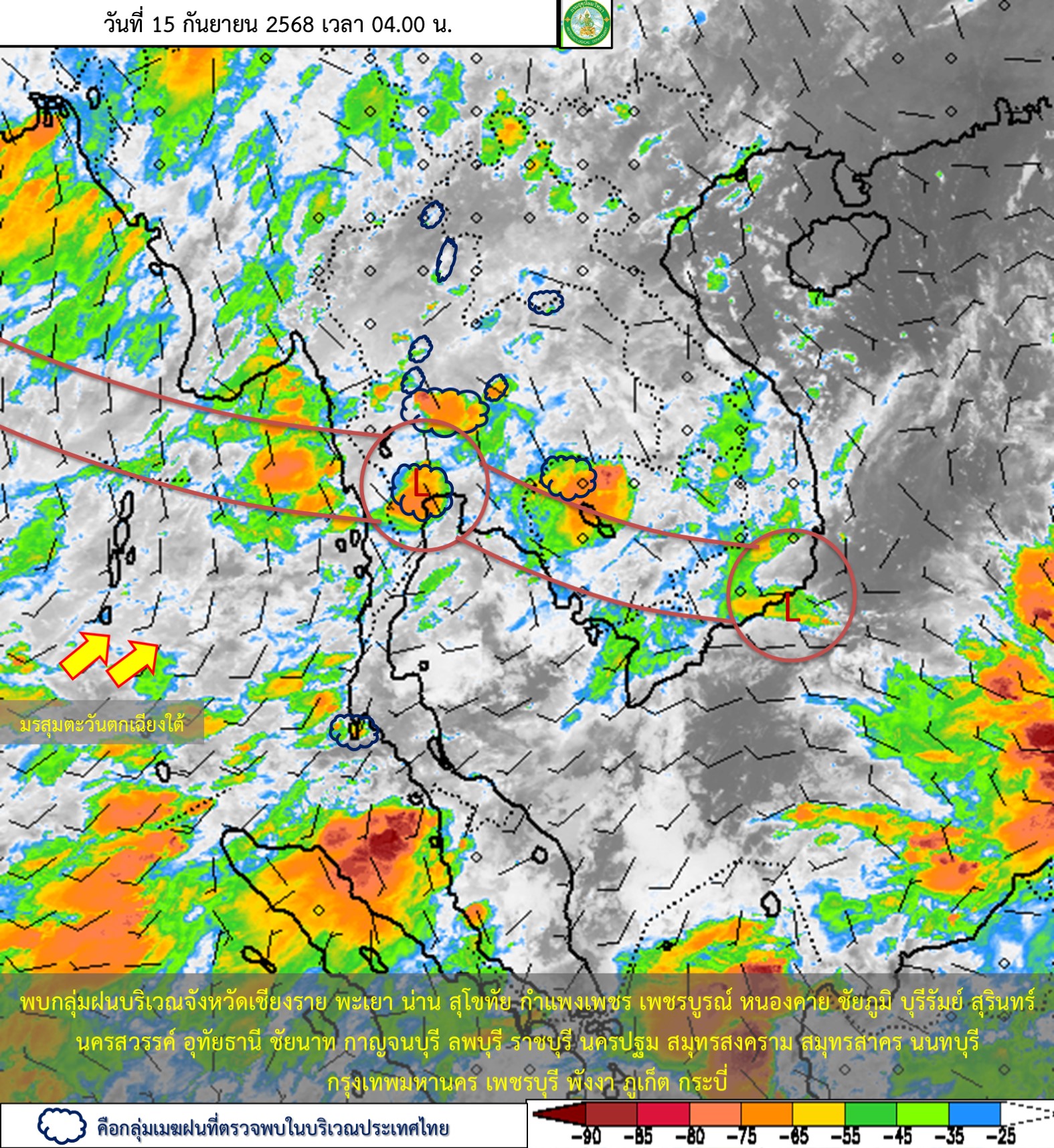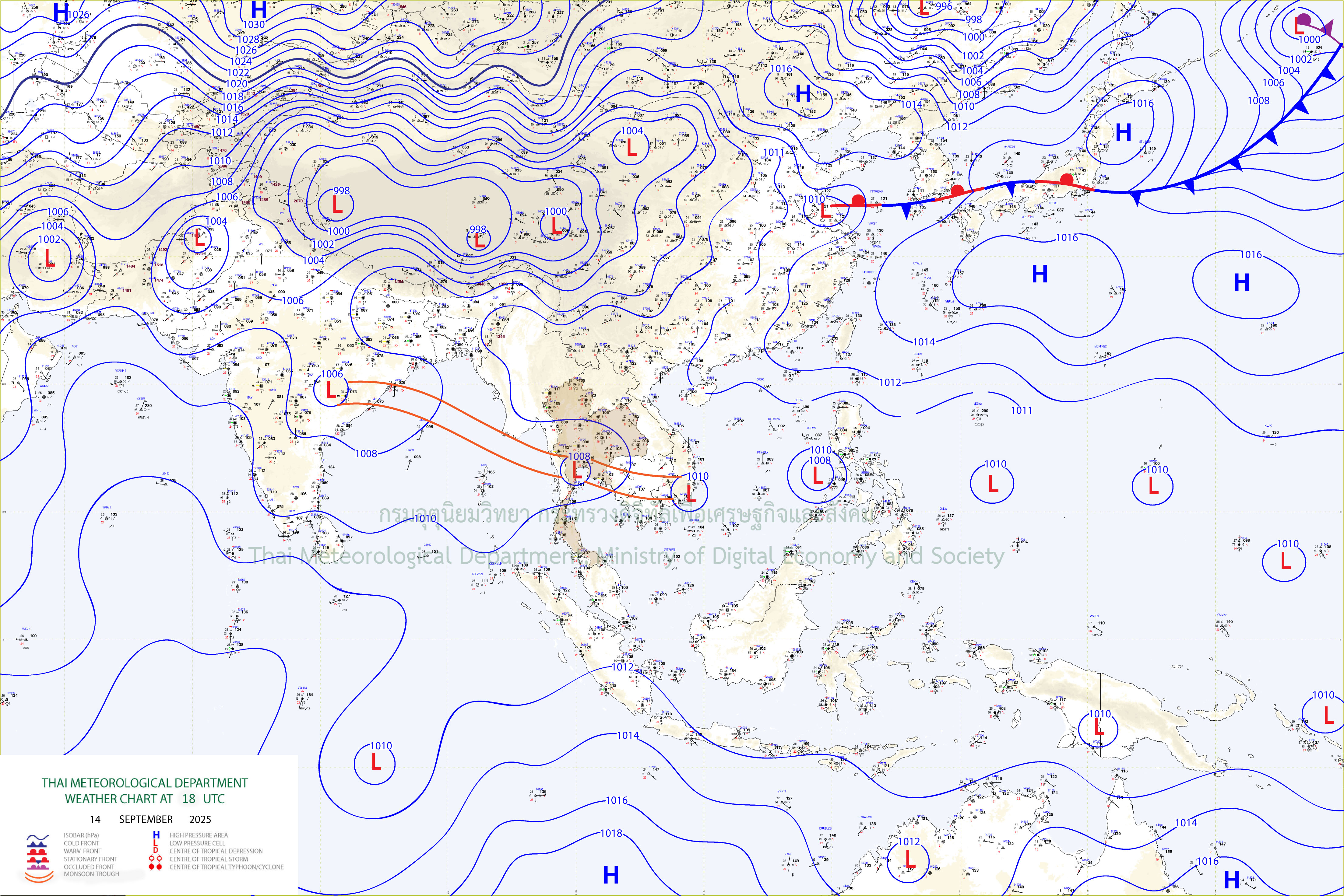 ลักษณะอากาศทั่วไป : พยากรณ์อากาศ 24 ชั่วโมงข้างหน้า ภาคตะวันออกเฉียงเหนือ ภาคกลาง รวมทั้งกรุงเทพมหานครและปริมณฑล ภาคตะวันออก และภาคใต้ ยังคงมีฝนตกหนักบางแห่ง ทั้งนี้เนื่องจากมีร่องมรสุมพาดผ่านภาคกลาง ภาคใต้ตอนบน และภาคตะวันออก เข้าสู่หย่อมความกดอากาศต่ำบริเวณชายฝั่งประเทศเวียดนามตอนล่าง ประกอบกับมีลมตะวันออกเฉียงใต้พัดปกคลุมภาคตะวันออกเฉียงเหนือตอนล่าง ภาคตะวันออก และอ่าวไทยตอนบน ในขณะที่มรสุมตะวันตกเฉียงใต้กำลังปานกลางยังคงพัดปกคลุมทะเลอันดามัน ภาคใต้ และอ่าวไทย ขอให้ประชาชนในบริเวณภาคตะวันออกเฉียงเหนือ ภาคกลาง รวมทั้งกรุงเทพมหานครและปริมณฑล ภาคตะวันออก และภาคใต้ ระวังอันตรายจากฝนตกหนักถึงหนักมากและฝนที่ตกสะสมซึ่งอาจทำให้เกิดน้ำท่วมฉับพลันและน้ำป่าไหลหลาก โดยเฉพาะพื้นที่ลาดเชิงเขาใกล้ทางน้ำไหลผ่านและพื้นที่ลุ่ม สำหรับ บริเวณทะเลอันดามันตอนบนมีคลื่นสูง 1-2 เมตร ส่วนทะเลอันดามันตอนล่าง และอ่าวไทยมีคลื่นสูงประมาณ 1 เมตร บริเวณที่มีฝนฟ้าคะนองคลื่นสูงมากกว่า 2 เมตร ขอให้ชาวเรือเดินเรือด้วยความระมัดระวังและหลีกเลี่ยงการเดินเรือในบริเวณที่มีฝนฟ้าคะนอง