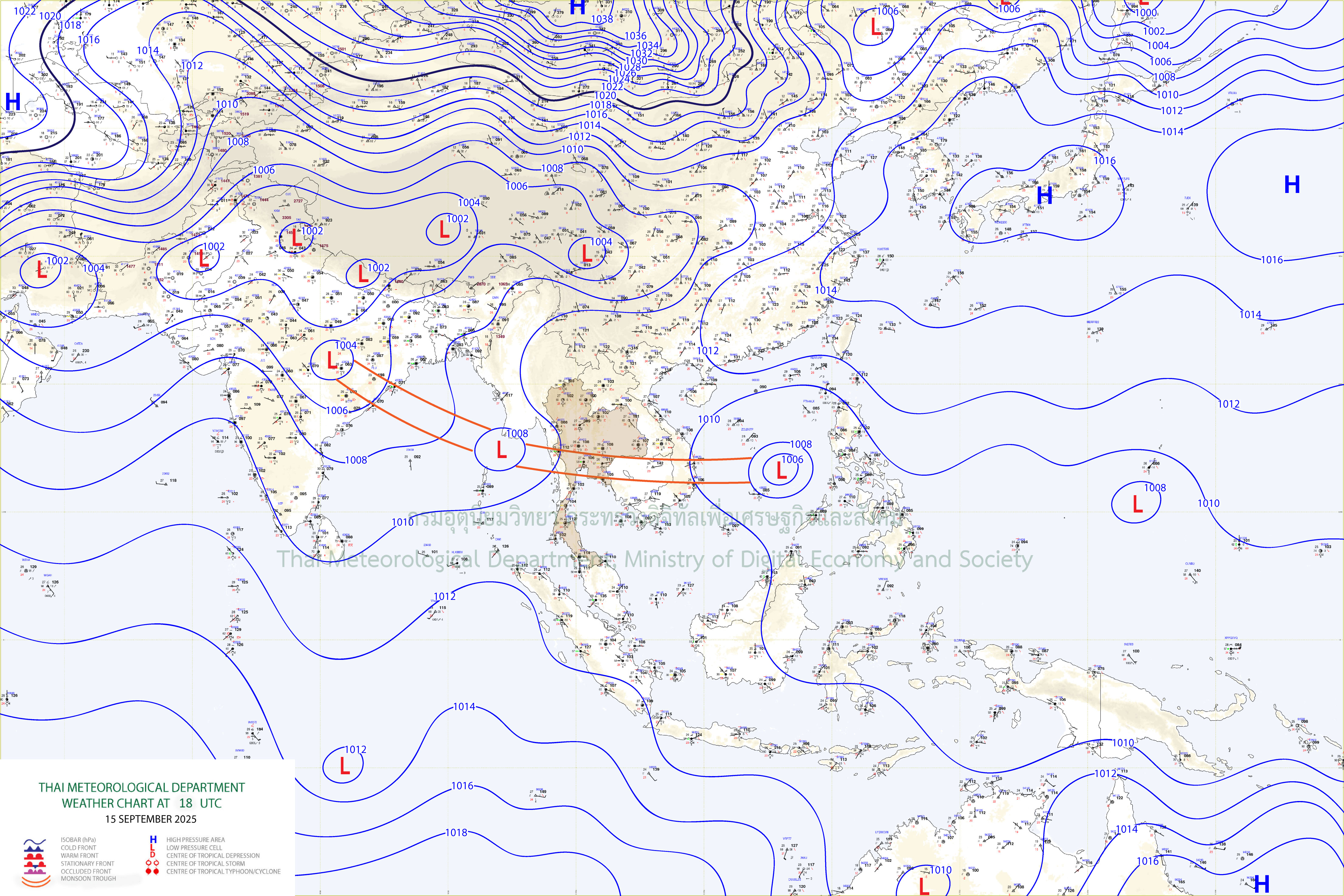 ลักษณะอากาศทั่วไป : พยากรณ์อากาศ 24 ชั่วโมงข้างหน้า ภาคตะวันออกเฉียงเหนือ ภาคกลาง รวมทั้งกรุงเทพมหานครและปริมณฑล ภาคตะวันออก และภาคใต้ ยังคงมีฝนตกหนักบางแห่ง ทั้งนี้เนื่องจากมีร่องมรสุมพาดผ่านภาคกลาง ภาคใต้ตอนบน และภาคตะวันออก เข้าสู่หย่อมความกดอากาศต่ำกำลังแรงบริเวณทะเลจีนใต้ ประกอบกับมีลมตะวันออกเฉียงใต้พัดปกคลุมภาคตะวันออกเฉียงเหนือตอนล่าง ภาคตะวันออก และอ่าวไทยตอนบน ในขณะที่มรสุมตะวันตกเฉียงใต้กำลังปานกลางยังคงพัดปกคลุมทะเลอันดามัน ภาคใต้ และอ่าวไทย ขอให้ประชาชนในบริเวณภาคตะวันออกเฉียงเหนือ ภาคกลาง รวมทั้งกรุงเทพมหานครและปริมณฑล ภาคตะวันออก และภาคใต้ ระวังอันตรายจากฝนตกหนักและฝนที่ตกสะสมซึ่งอาจทำให้เกิดน้ำท่วมฉับพลันและน้ำป่าไหลหลาก โดยเฉพาะพื้นที่ลาดเชิงเขาใกล้ทางน้ำไหลผ่านและพื้นที่ลุ่ม