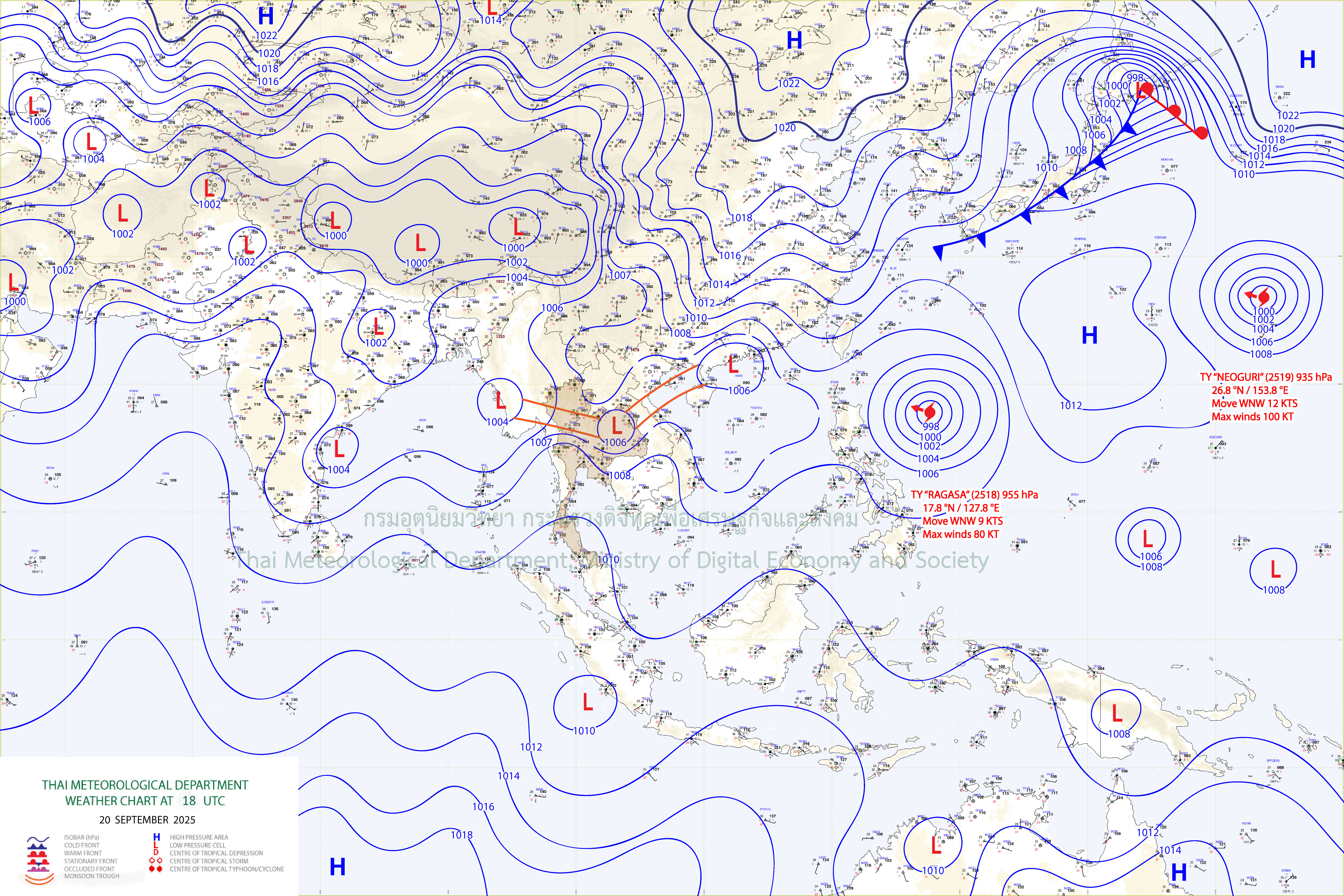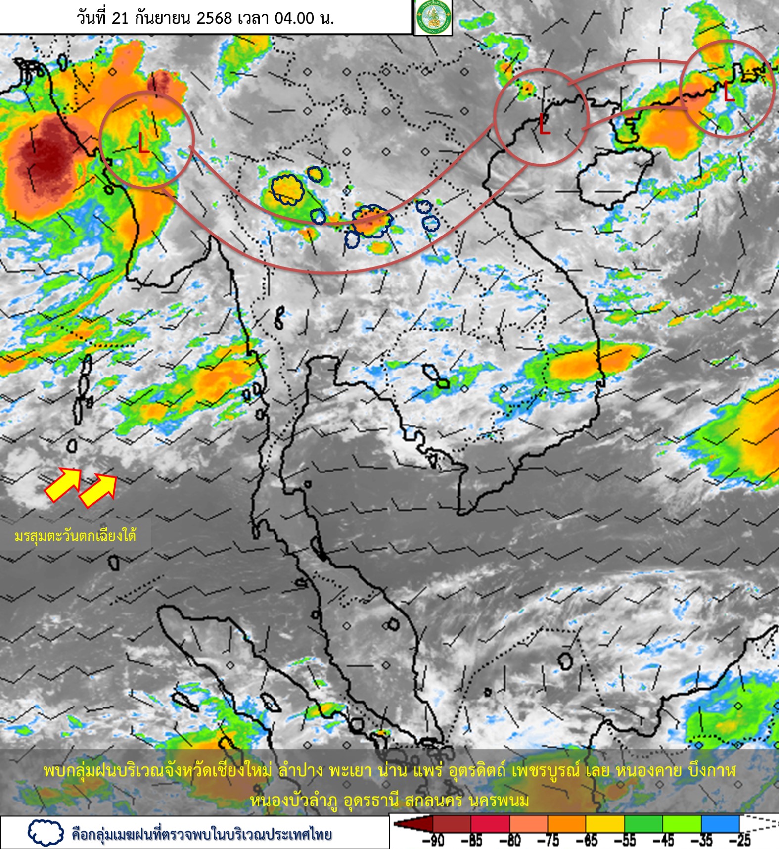 ลักษณะอากาศทั่วไป : พยากรณ์อากาศ 24 ชั่วโมงข้างหน้า ประเทศไทยตอนบนมีฝนตกหนักบางแห่ง โดยเฉพาะบริเวณจังหวัดแม่ฮ่องสอน ตาก จันทบุรี และตราด ขอให้ประชาชนในบริเวณดังกล่าวระวังอันตรายจากฝนตกหนักและฝนที่ตกสะสม เนื่องจากร่องมรสุมพาดผ่านภาคเหนือ และภาคตะวันออกเฉียงเหนือตอนบน ประกอบกับมรสุมตะวันตกเฉียงใต้ที่พัดปกคลุมทะเลอันดามัน ประเทศไทย และอ่าวไทยมีกำลังปานกลาง
