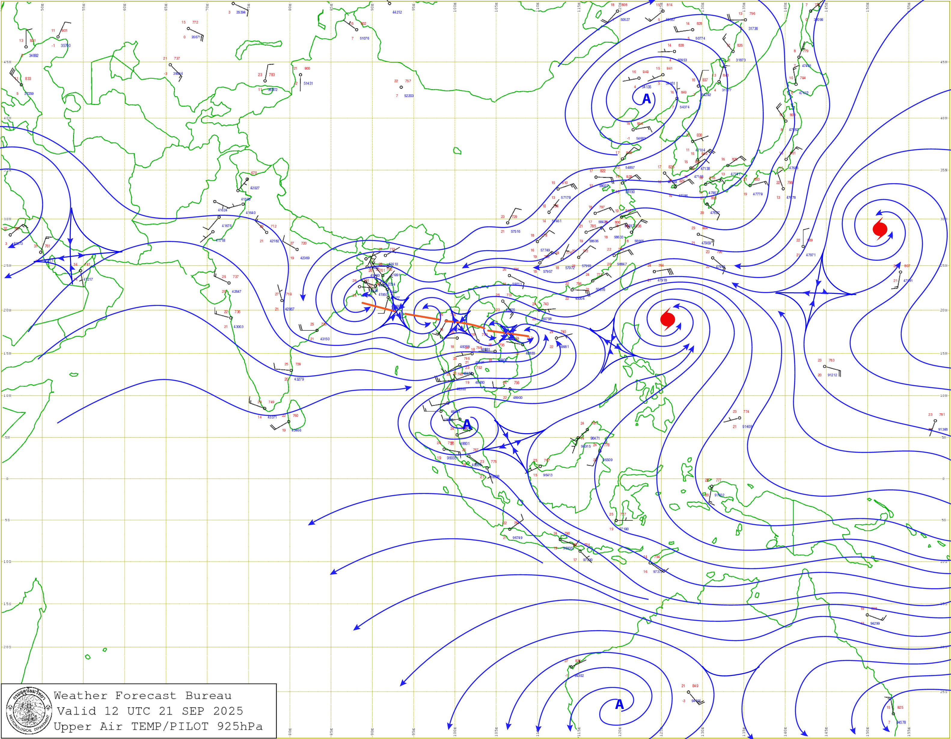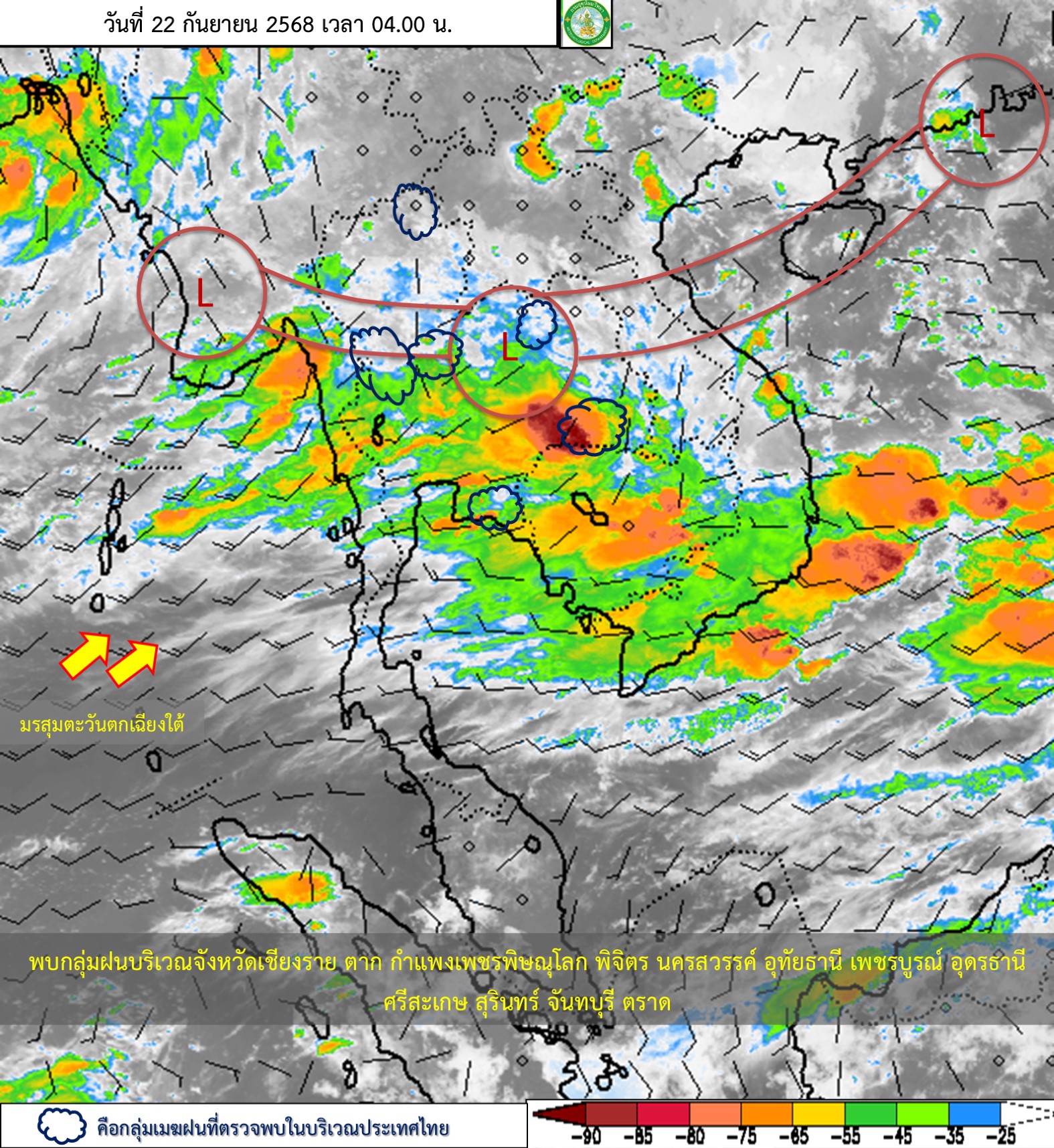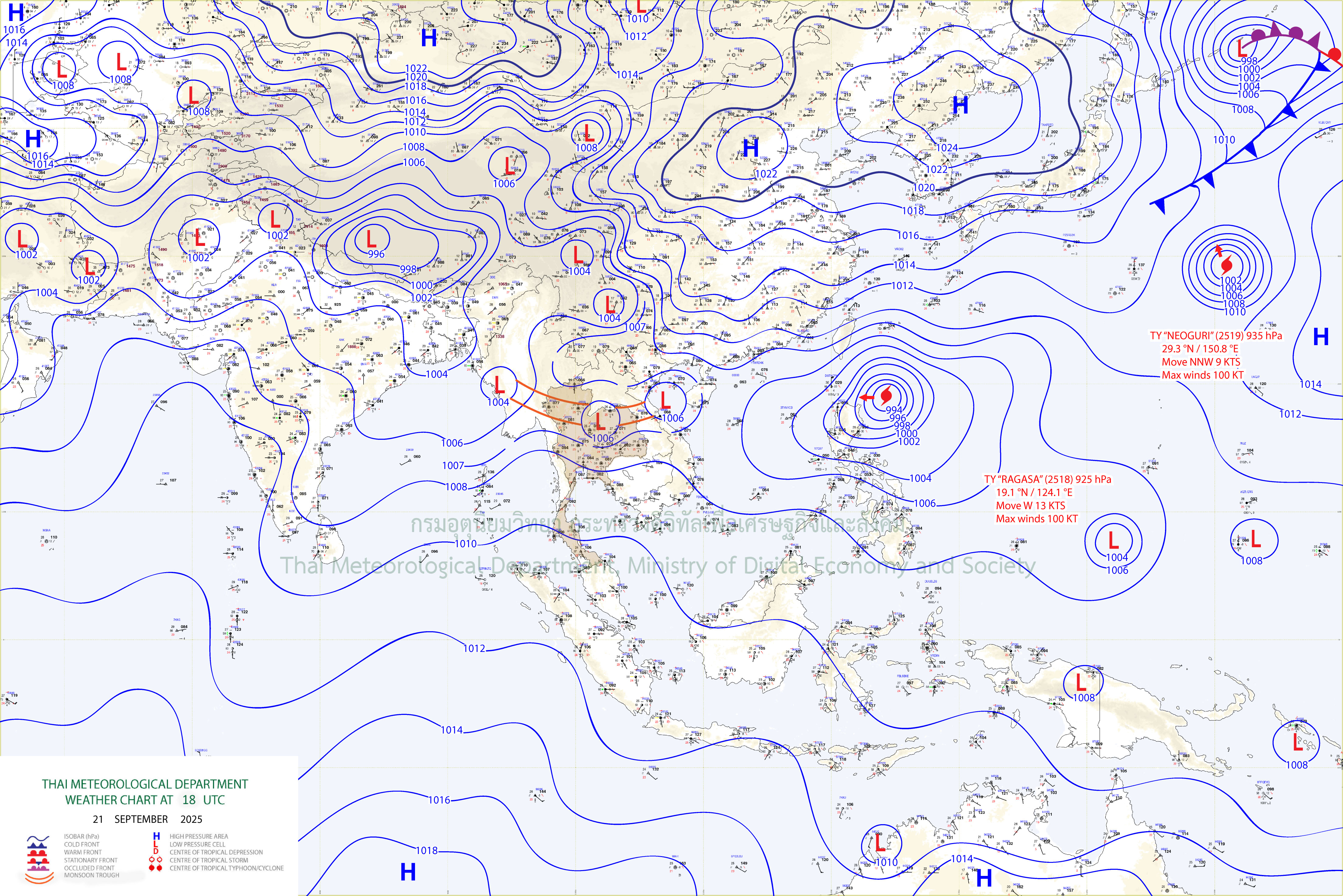 ลักษณะอากาศทั่วไป : พยากรณ์อากาศ 24 ชั่วโมงข้างหน้า ประเทศไทยตอนบนมีฝนตกหนักบางแห่ง โดยเฉพาะบริเวณจังหวัดแม่ฮ่องสอน ตาก บึงกาฬ อำนาจเจริญ และอุบลราชธานี ขอให้ประชาชนในบริเวณดังกล่าวระวังอันตรายจากฝนตกหนักและฝนที่ตกสะสม เนื่องจากร่องมรสุมพาดผ่านภาคเหนือ และภาคตะวันออกเฉียงเหนือตอนบน ประกอบกับมรสุมตะวันตกเฉียงใต้ที่พัดปกคลุมทะเลอันดามัน ประเทศไทย และอ่าวไทยมีกำลังปานกลาง สำหรับบริเวณทะเลอันดามันตอนบนมีคลื่นสูงประมาณ 2 เมตร ส่วนทะเลอันดามันตอนล่างและอ่าวไทยตอนบนมีคลื่นสูง 1-2 เมตร บริเวณที่มีฝนฟ้าคะนองคลื่นสูงมากกว่า 2 เมตร ขอให้ชาวเรือเดินเรือด้วยความระมัดระวังและหลีกเลี่ยงการเดินเรือในบริเวณที่มีฝนฟ้าคะนอง อนึ่ง พายุไต้ฝุ่น “รากาซา” (RAGASA) บริเวณด้านตะวันออกของประเทศฟิลิปปินส์ มีแนวโน้มจะเคลื่อนลงสู่ทะเลจีนใต้ในวันนี้ (22 ก.ย. 68) คาดว่า ในช่วงวันที่ 25 – 26 ก.ย. 68 จะเคลื่อนตัวลงสู่อ่าวตังเกี๋ยและขึ้นฝั่งบริเวณประเทศเวียดนามตอนบน หลังจากนั้นจะอ่อนกำลังตามลำดับ อิทธิพลชองพายุนี้จะทำให้ร่องมรสุมและมรสุมที่พัดปกคลุมประเทศไทยมีกำลังแรงขึ้นในช่วงดังกล่าว