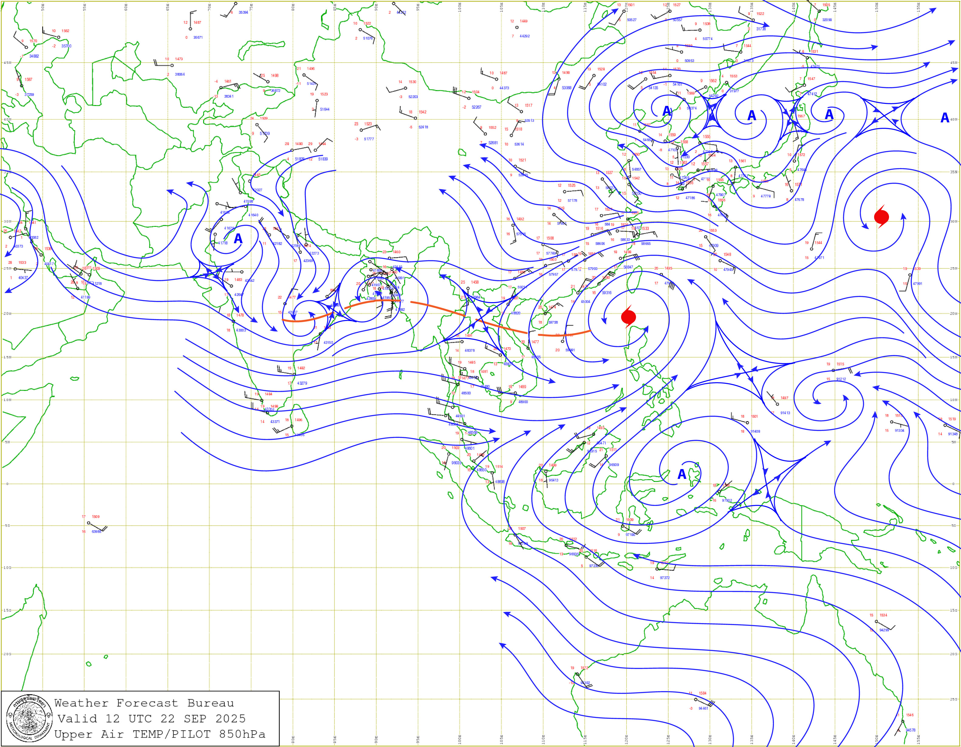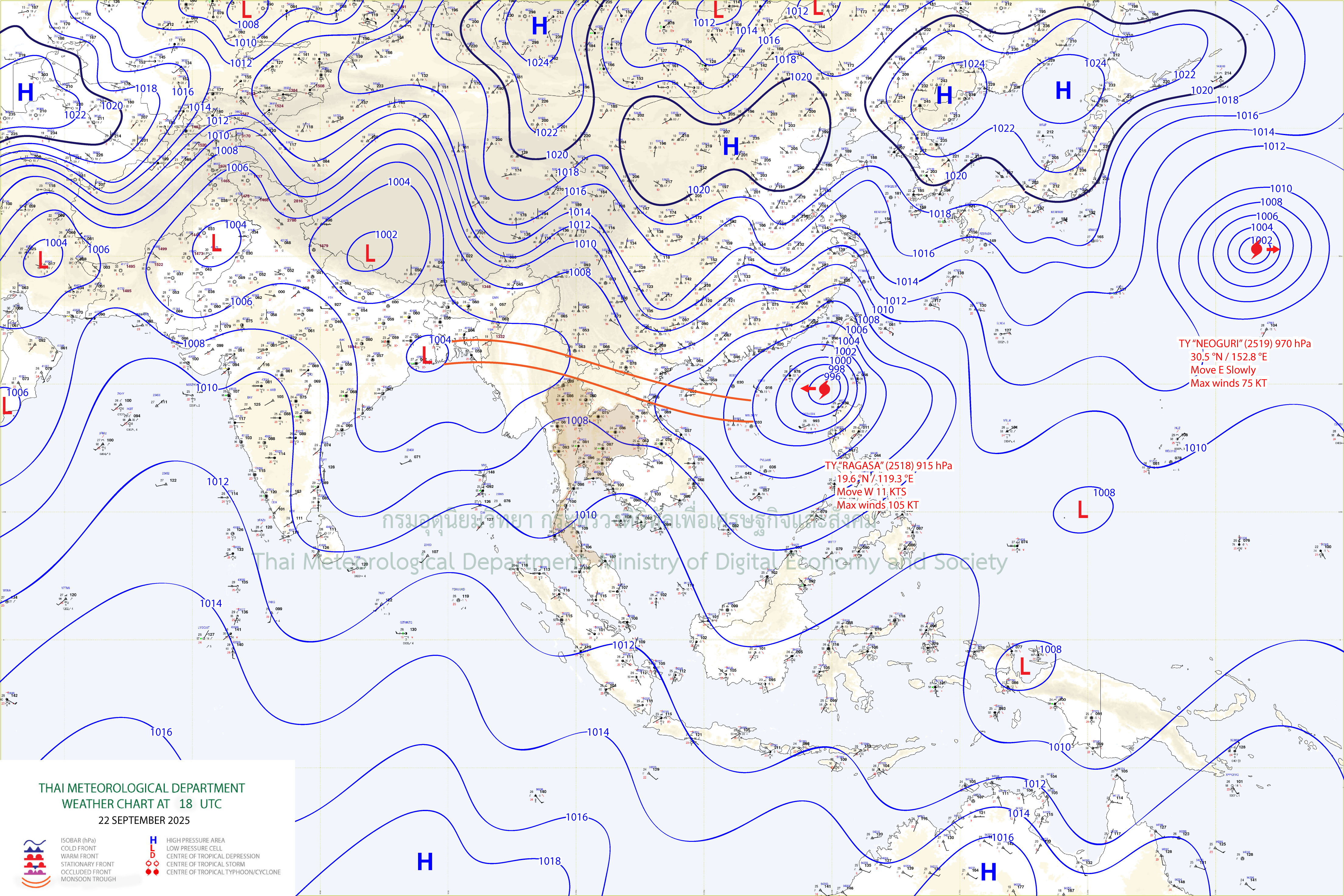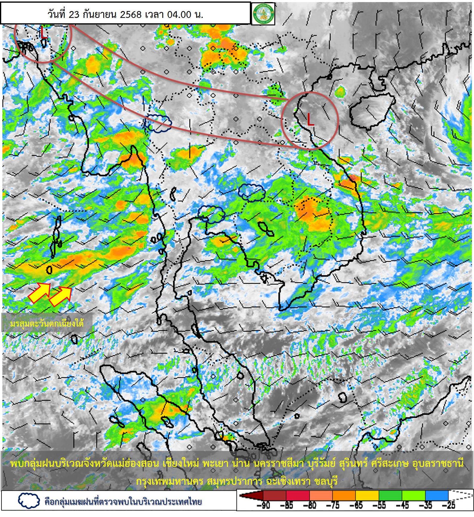 ลักษณะอากาศทั่วไป : พยากรณ์อากาศ 24 ชั่วโมงข้างหน้า ประเทศไทยตอนบนมีฝนตกหนักบางแห่ง โดยเฉพาะบริเวณจังหวัดแม่ฮ่องสอน ตาก มุกดาหาร ยโสธร อำนาจเจริญ ศรีสะเกษ อุบลราชธานี จันทบุรี และตราด ขอให้ประชาชนในบริเวณดังกล่าวระวังอันตรายจากฝนตกหนักและฝนที่ตกสะสม เนื่องจากร่องมรสุมพาดผ่านตอนบนของภาคเหนือ ประกอบกับมรสุมตะวันตกเฉียงใต้ที่พัดปกคลุมทะเลอันดามัน ประเทศไทย และอ่าวไทยมีกำลังปานกลาง สำหรับบริเวณทะเลอันดามันตอนบนมีคลื่นสูงประมาณ 2 เมตร ส่วนทะเลอันดามันตอนล่างและอ่าวไทยตอนบนมีคลื่นสูง 1-2 เมตร บริเวณที่มีฝนฟ้าคะนองคลื่นสูงมากกว่า 2 เมตร ขอให้ชาวเรือเดินเรือด้วยความระมัดระวังและหลีกเลี่ยงการเดินเรือในบริเวณที่มีฝนฟ้าคะนอง อนึ่ง พายุไต้ฝุ่น “รากาซา” (RAGASA) ปกคลุมบริเวณทะเลจีนใต้ตอนบน คาดว่าจะเคลื่อนตัวลงสู่อ่าวตังเกี๋ยและขึ้นฝั่งบริเวณประเทศเวียดนามตอนบนในช่วงวันที่ 24 – 25 ก.ย. 68 หลังจากนั้นจะอ่อนกำลังตามลำดับ อิทธิพลชองพายุนี้จะทำให้ร่องมรสุมและมรสุมที่พัดปกคลุมประเทศไทยมีกำลังแรงขึ้นในช่วงดังกล่าว