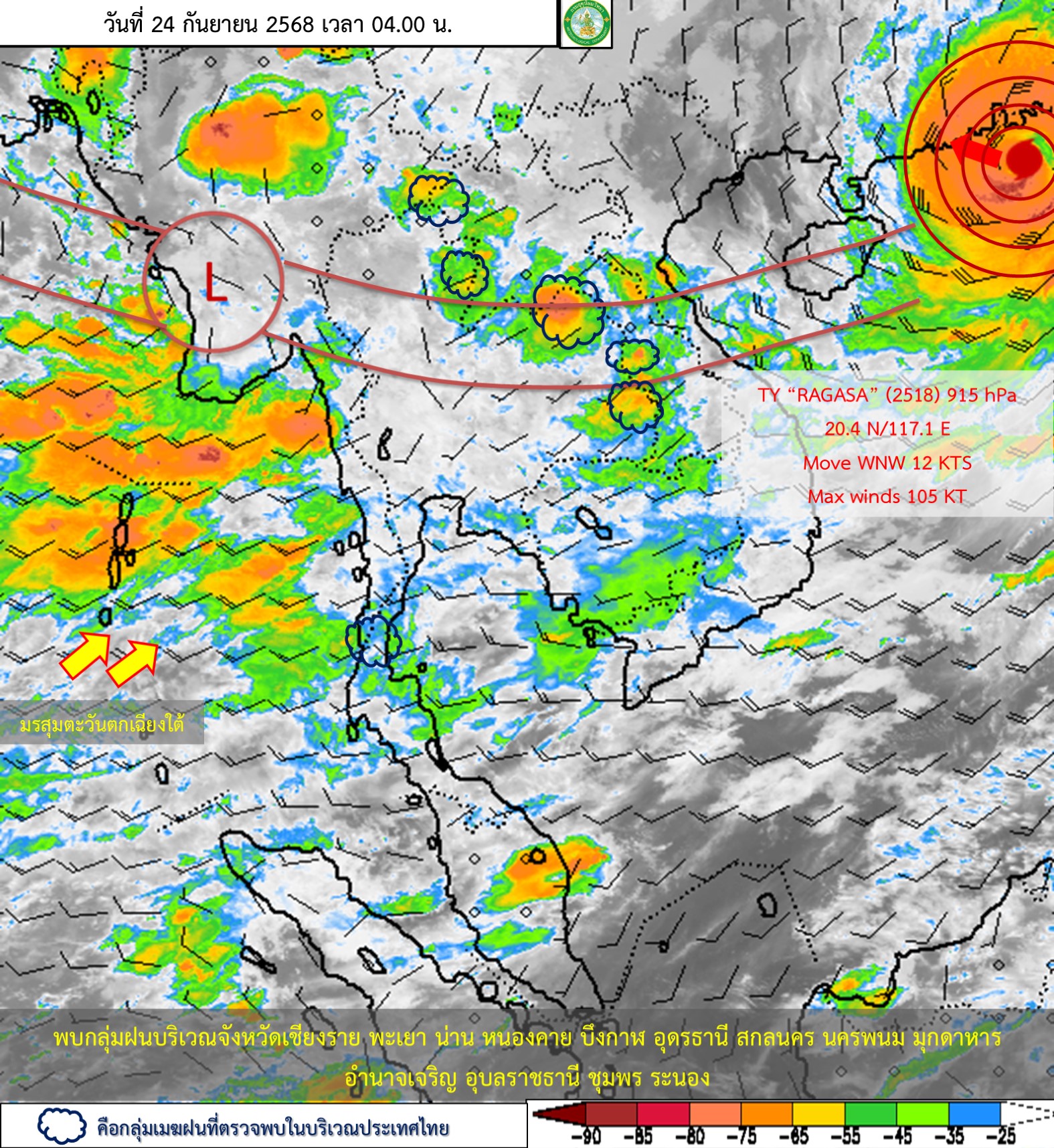 อนึ่ง พายุไต้ฝุ่น “รากาซา” (RAGASA) บริเวณทะเลจีนใต้ตอนบน คาดว่าจะเคลื่อนเข้าใกล้เกาะฮ่องกง และเคลื่อนผ่านแนวชายฝั่งทางตอนใต้ของประเทศจีน ลงสู่อ่าวตังเกี๋ยในวันที่ 25 ก.ย. 68 และจะอ่อนกำลังลงเป็นพายุโซนร้อนก่อนเคลื่อนขึ้นฝั่งประเทศเวียดนามตอนบน จากนั้นมีแนวโน้มจะอ่อนกำลังลงอย่างรวดเร็ว เนื่องจากมีมวลอากาศเย็นจากประเทศจีนแผ่เสริมลงมาปกคลุม ในช่วงวันที่ 25–26 ก.ย. 68 โดยพายุนี้ไม่เคลื่อนเข้าสู่ประเทศไทย จากอิทธิพลดังกล่าวจะทำให้ร่องมรสุมและมรสุมที่พัดปกคลุมประเทศไทยมีกำลังแรงขึ้นในช่วงวันที่ 24–26 ก.ย. 68