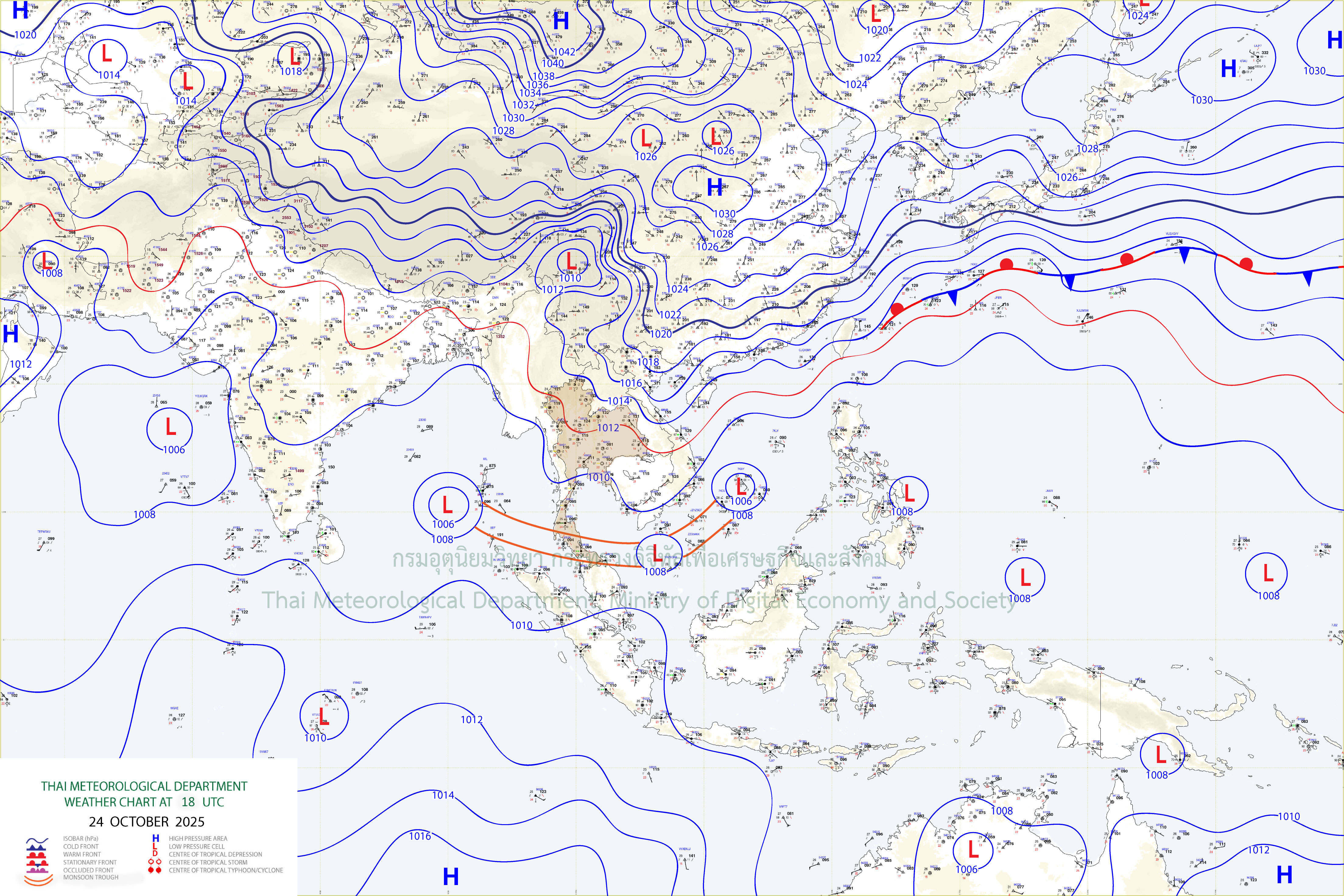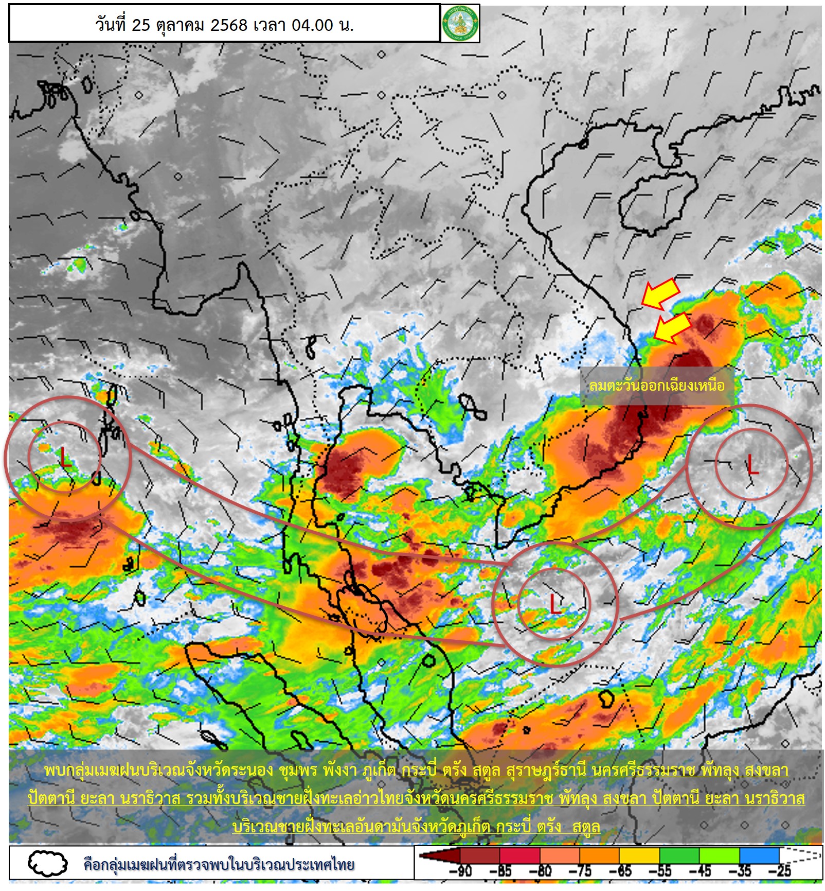ลักษณะอากาศทั่วไป : พยากรณ์อากาศ 24 ชั่วโมงข้างหน้า ภาคใต้ตอนกลางถึงตอนล่างมีฝนตกหนักถึงหนักมากบางแห่ง ขอให้ประชาชนในบริเวณดังกล่าว โดยเฉพาะบริเวณจังหวัดชุมพร สุราษฎร์ธานี นครศรีธรรมราช พัทลุง สงขลา พังงา ภูเก็ต และกระบี่ ระวังอันตรายจากฝนฟ้าคะนอง ฝนตกหนักถึงหนักมากและฝนที่ตกสะสม รวมทั้งเพิ่มความระมัดระวังในการสัญจรผ่านบริเวณที่มีน้ำท่วมขัง เนื่องจากร่องมรสุมกำลังค่อนข้างแรงพาดผ่านภาคใต้ตอนล่าง ประกอบกับมรสุมตะวันออกเฉียงเหนือกำลังปานกลางพัดปกคลุมอ่าวไทยตอนบน ภาคใต้ตอนบน และทะเลอันดามันตอนบน ส่วนคลื่นลมบริเวณอ่าวไทยตอนบนและห่างฝั่งของทะเลอันดามันมีกำลังปานกลาง โดยมีคลื่นสูง 1-2 เมตร บริเวณที่มีฝนฟ้าคะนองคลื่นสูงมากกว่า 2 เมตร อ่าวไทยตอนล่างและทะเลอันดามันมีคลื่นสูงประมาณ 1 เมตร บริเวณที่มีฝนฟ้าคะนองคลื่นสูงมากกว่า 2 เมตร ขอให้ชาวเรือบริเวณอ่าวไทยและทะเลอันดามันเดินเรือด้วยความระมัดระวัง และหลีกเลี่ยงการเดินเรือในบริเวณที่มีฝนฟ้าคะนอง สำหรับประเทศไทยตอนบนจะมีอุณหภูมิสูงขึ้น 1-2 องศาเซลเซียส แต่ยังคงมีอากาศเย็นในตอนเช้าภาคเหนือ ภาคตะวันออกเฉียงเหนือและภาคกลาง โดยมีฝนเล็กน้อยบางแห่ง เนื่องจากบริเวณความกดอากาศสูงหรือมวลอากาศเย็นกำลังปานกลางจากประเทศจีนที่ปกคลุมประเทศไทยตอนบนเริ่มมีกำลังอ่อนลง ขอให้ประชาชนบริเวณประเทศไทยตอนบน โดยเฉพาะภาคเหนือและภาคตะวันออกเฉียงเหนือ ดูแลรักษาสุขภาพเนื่องจากสภาพอากาศที่เปลี่ยนแปลงในระยะนี้ไว้ด้วย