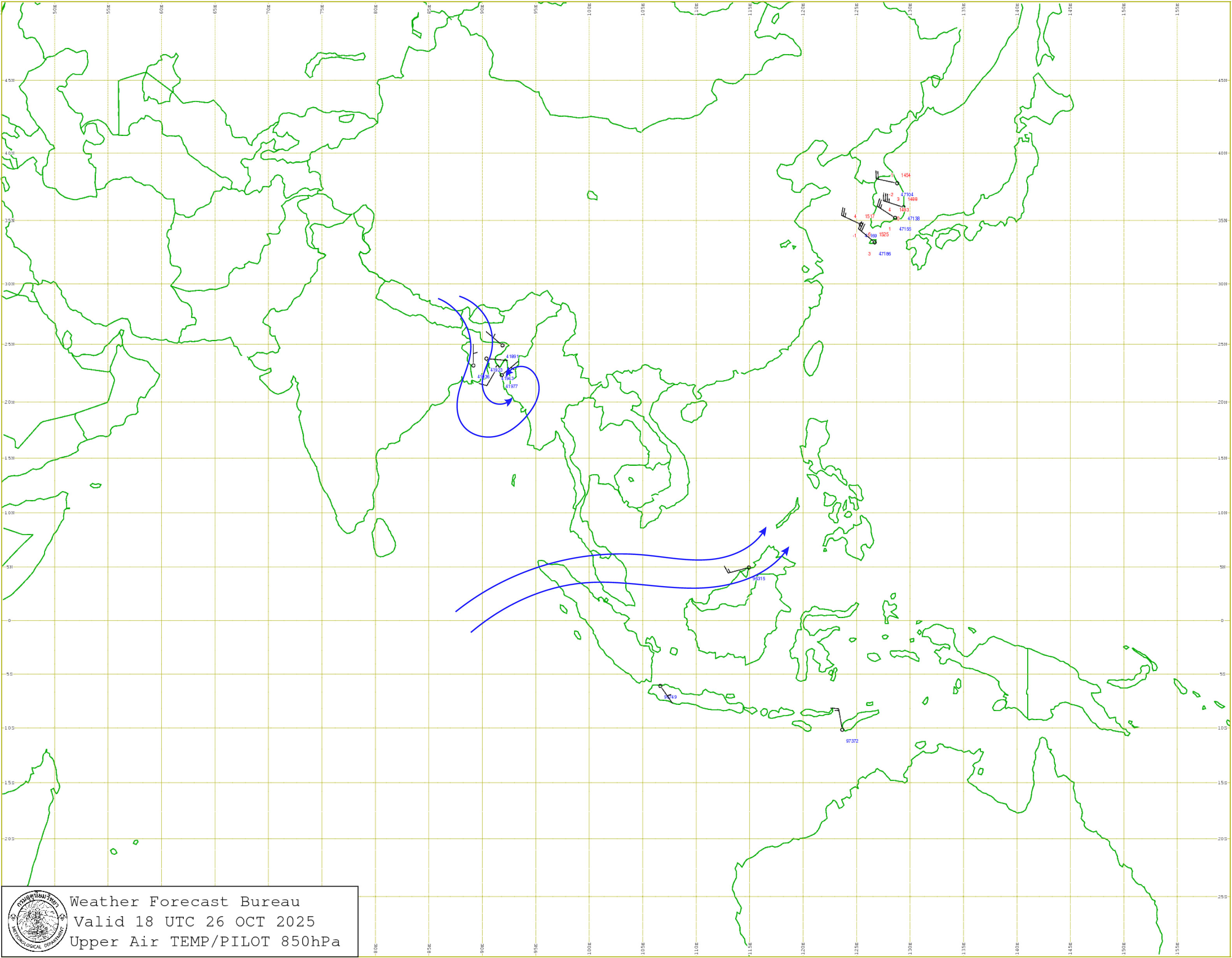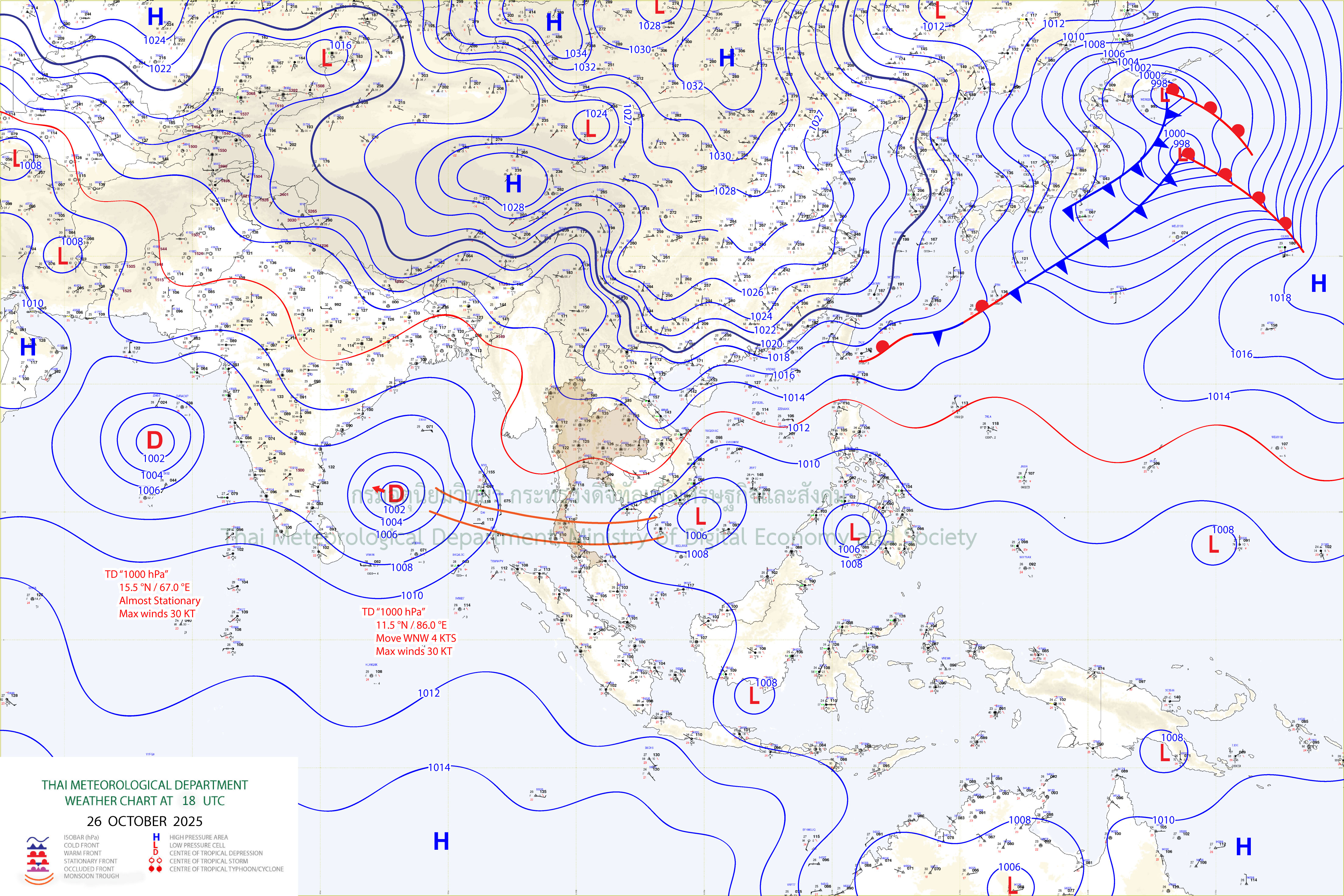 กรุงเทพมหานครและปริมณฑล : เมฆเป็นส่วนมาก และอุณหภูมิจะสูงขึ้นเล็กน้อย โดยมีฝนเล็กน้อยบางแห่ง อุณหภูมิต่ำสุด 24-26 องศาเซลเซียส อุณหภูมิสูงสุด 32-34 องศาเซลเซียส ลมตะวันออกเฉียงเหนือ ความเร็ว 10-20 กม./ชม.