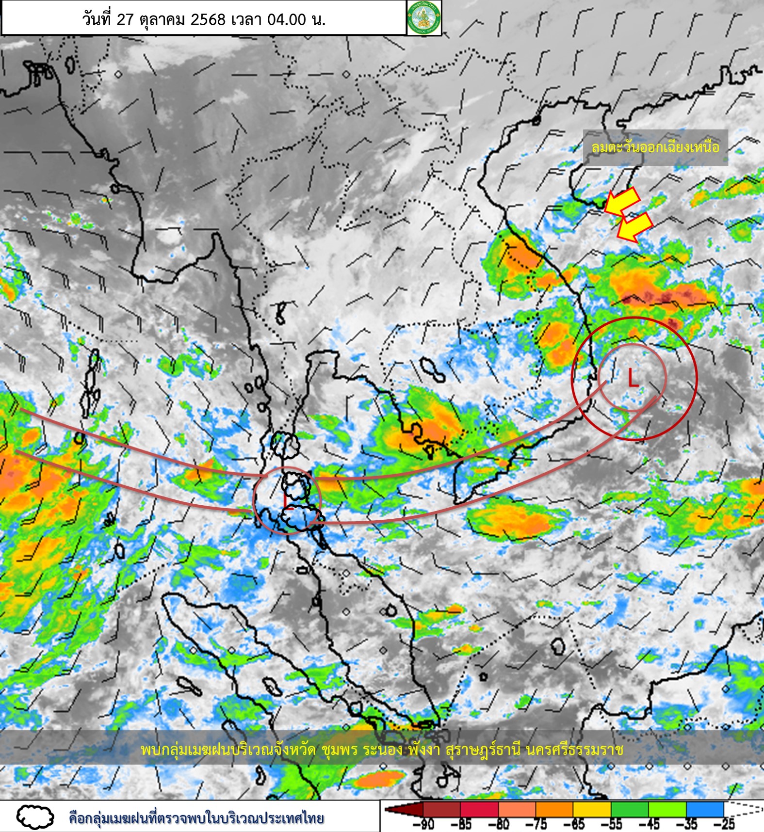 ลักษณะอากาศทั่วไป : พยากรณ์อากาศ 24 ชั่วโมงข้างหน้า ภาคใต้ตอนกลางถึงตอนล่างมีฝนตกหนักบางแห่ง ขอให้ประชาชนในบริเวณดังกล่าว โดยเฉพาะบริเวณจังหวัดประจวบคีรีขันธ์ ชุมพร สุราษฎร์ธานี ระนอง และพังงา ระวังอันตรายจากฝนฟ้าคะนอง ฝนตกหนักและฝนที่ตกสะสม รวมทั้งเพิ่มความระมัดระวังในการสัญจรผ่านบริเวณที่มีน้ำท่วมขัง เนื่องจากร่องมรสุมกำลังค่อนข้างแรงพาดผ่านภาคใต้ตอนกลาง ประกอบกับมรสุมตะวันออกเฉียงเหนือกำลังปานกลางพัดปกคลุมอ่าวไทยตอนบน ภาคใต้ตอนบน และทะเลอันดามันตอนบน ส่วนคลื่นลมบริเวณอ่าวไทยตอนบนและห่างฝั่งของทะเลอันดามันมีกำลังปานกลาง โดยมีคลื่นสูง 1-2 เมตร บริเวณที่มีฝนฟ้าคะนองคลื่นสูงมากกว่า 2 เมตร อ่าวไทยตอนล่างและทะเลอันดามันมีคลื่นสูงประมาณ 1 เมตร บริเวณที่มีฝนฟ้าคะนองคลื่นสูงมากกว่า 2 เมตร ขอให้ชาวเรือบริเวณอ่าวไทยและทะเลอันดามันเดินเรือด้วยความระมัดระวัง และหลีกเลี่ยงการเดินเรือในบริเวณที่มีฝนฟ้าคะนอง สำหรับประเทศไทยตอนบนจะมีอุณหภูมิสูงขึ้นเล็กน้อย แต่ยังคงมีอากาศเย็นในตอนเช้าบริเวณภาคเหนือ และภาคตะวันออกเฉียงเหนือ โดยมีฝนเล็กน้อยบางแห่งเกิดขึ้นได้ เนื่องจากบริเวณความกดอากาศสูงหรือมวลอากาศเย็นกำลังอ่อนที่ปกคลุมประเทศไทยตอนบน ขอให้ประชาชนบริเวณประเทศไทยตอนบน โดยเฉพาะภาคเหนือและภาคตะวันออกเฉียงเหนือ ดูแลรักษาสุขภาพเนื่องจากสภาพอากาศที่เปลี่ยนแปลงในระยะนี้ไว้ด้วย