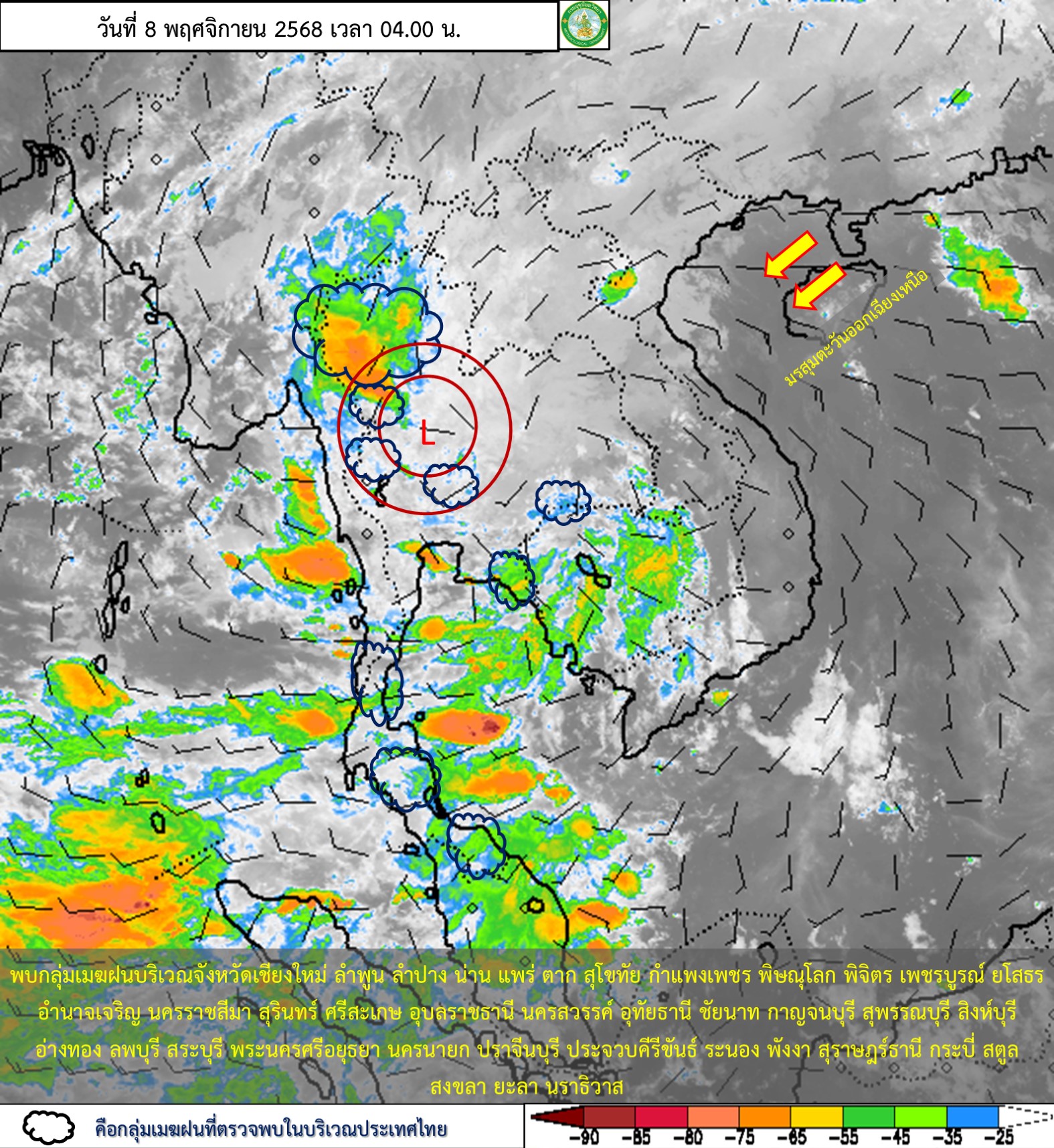 ลักษณะอากาศทั่วไป : พยากรณ์อากาศ 24 ชั่วโมงข้างหน้า ภาคตะวันออกเฉียงเหนือด้านตะวันตก ภาคกลาง และภาคตะวันออก มีฝนตกหนักบางแห่ง โดยเฉพาะบริเวณจังหวัดแม่ฮ่องสอน เชียงใหม่ เชียงราย ลำพูน ลำปาง สุโขทัย ตาก และกำแพงเพชร เนื่องจากหย่อมความกดอากาศต่ำที่อ่อนกำลังลงจากพายุ “คัลแมกี” (KALMAEGI) ปกคลุมบริเวณด้านตะวันตกของภาคตะวันออกเฉียงเหนือ และมีแนวโน้มจะเคลื่อนผ่านภาคกลางตอนบน และภาคเหนือ ตามลำดับ ขอให้ประชาชนในบริเวณดังกล่าวระวังอันตรายจากฝนตกหนักและฝนที่ตกสะสม ซึ่งอาจทำให้เกิดน้ำท่วมฉับพลัน น้ำป่าไหลหลาก และน้ำล้นตลิ่ง โดยเฉพาะพื้นที่ลาดเชิงเขาใกล้ทางน้ำไหลผ่าน พื้นที่ลุ่ม และพื้นที่น้ำท่วมขัง ส่วนเกษตรกรควรป้องกันและระวังความเสียหายที่จะเกิดต่อผลผลิตทางการเกษตร สำหรับภาคใต้ มีฝนตกหนักบางแห่ง เนื่องจากมีลมตะวันตกและลมตะวันตกเฉียงใต้พัดปกคลุมทะเลอันดามันและภาคใต้ ส่วนคลื่นลมบริเวณทะเลอันดามันมีกำลังค่อนข้างแรง โดยมีคลื่นสูง 2-3 เมตร บริเวณที่มีฝนฟ้าคะนองคลื่นสูงมากกว่า 3 เมตร อ่าวไทยตอนบนมีคลื่นสูง 1-2 เมตร บริเวณที่มีฝนฟ้าคะนองคลื่นสูงมากกว่า 2 เมตร ขอให้ชาวเรือเดินเรือด้วยความระมัดระวัง หลีกเลี่ยงการเดินเรือในบริเวณที่มีฝนฟ้าคะนอง และเรือเล็กบริเวณทะเลอันดามันควรงดออกจากฝั่งต่อไปอีก 1 วัน