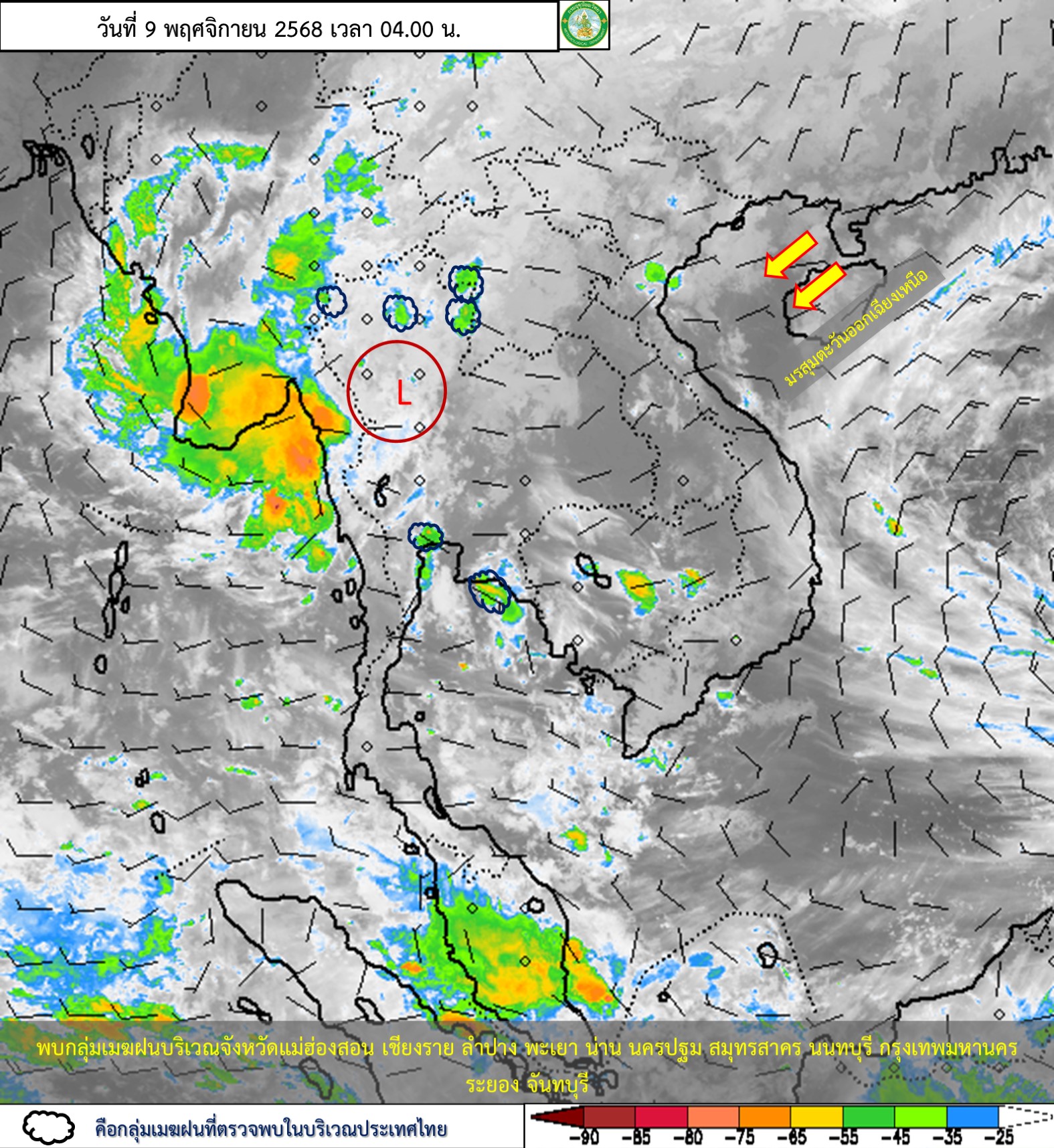 ลักษณะอากาศทั่วไป : พยากรณ์อากาศ 24 ชั่วโมงข้างหน้า ภาคเหนือมีฝนตกหนักบางแห่ง โดยเฉพาะบริเวณจังหวัดแม่ฮ่องสอน เชียงใหม่ เชียงราย ลำพูน ลำปาง พะเยา และตาก เนื่องจากหย่อมความกดอากาศต่ำปกคลุมด้านตะวันตกของภาคเหนือและประเทศเมียนมา ขอให้ประชาชนในบริเวณดังกล่าวระวังอันตรายจากฝนตกหนักและฝนที่ตกสะสมซึ่งอาจทำให้เกิดน้ำท่วมฉับพลัน น้ำป่าไหลหลาก และน้ำล้นตลิ่ง โดยเฉพาะพื้นที่ลาดเชิงเขาใกล้ทางน้ำไหลผ่าน พื้นที่ลุ่ม และพื้นที่น้ำท่วมขัง ส่วนเกษตรกรควรป้องกันและระวังความเสียหายที่จะเกิดต่อผลผลิตทางการเกษตร สำหรับภาคใต้มีฝนตกหนักบางแห่ง เนื่องจากมีลมตะวันตกเฉียงใต้พัดปกคลุมทะเลอันดามันและภาคใต้ ส่วนคลื่นลมบริเวณทะเลอันดามันมีกำลังปานกลาง โดยมีคลื่นสูง 1-2 เมตร บริเวณที่มีฝนฟ้าคะนองคลื่นสูงมากกว่า 2 เมตร อ่าวไทยมีคลื่นสูงประมาณ 1 เมตร บริเวณที่มีฝนฟ้าคะนองคลื่นสูงมากกว่า 2 เมตร ขอให้ชาวเรือเดินเรือด้วยความระมัดระวัง หลีกเลี่ยงการเดินเรือในบริเวณที่มีฝนฟ้าคะนอง
