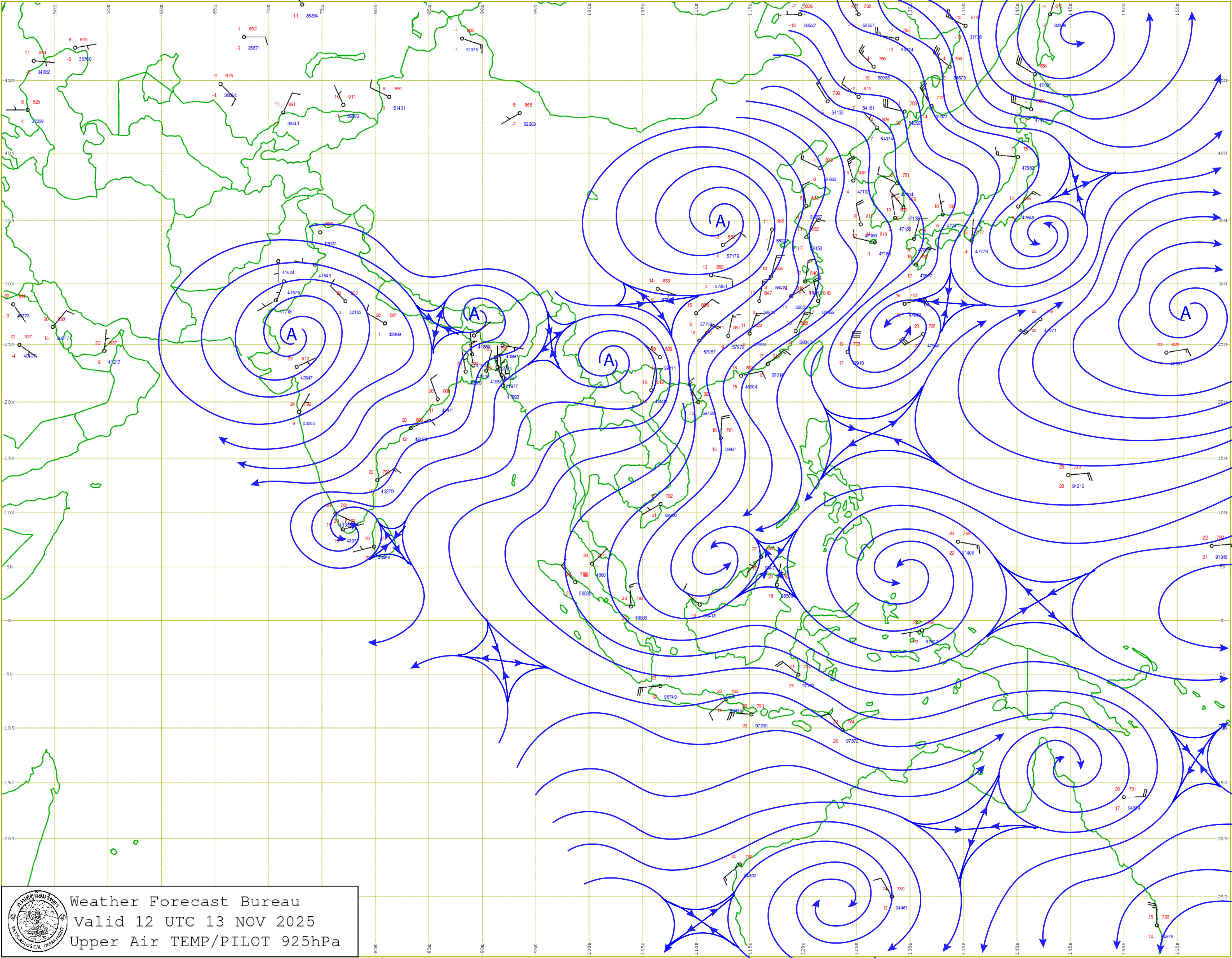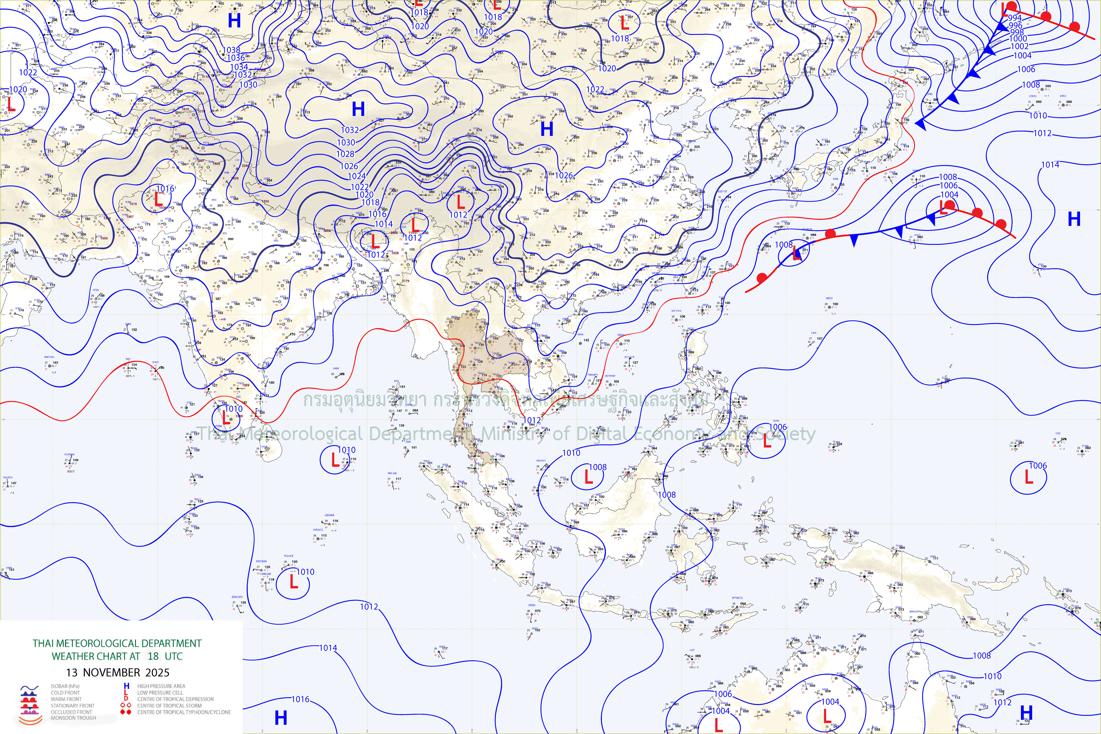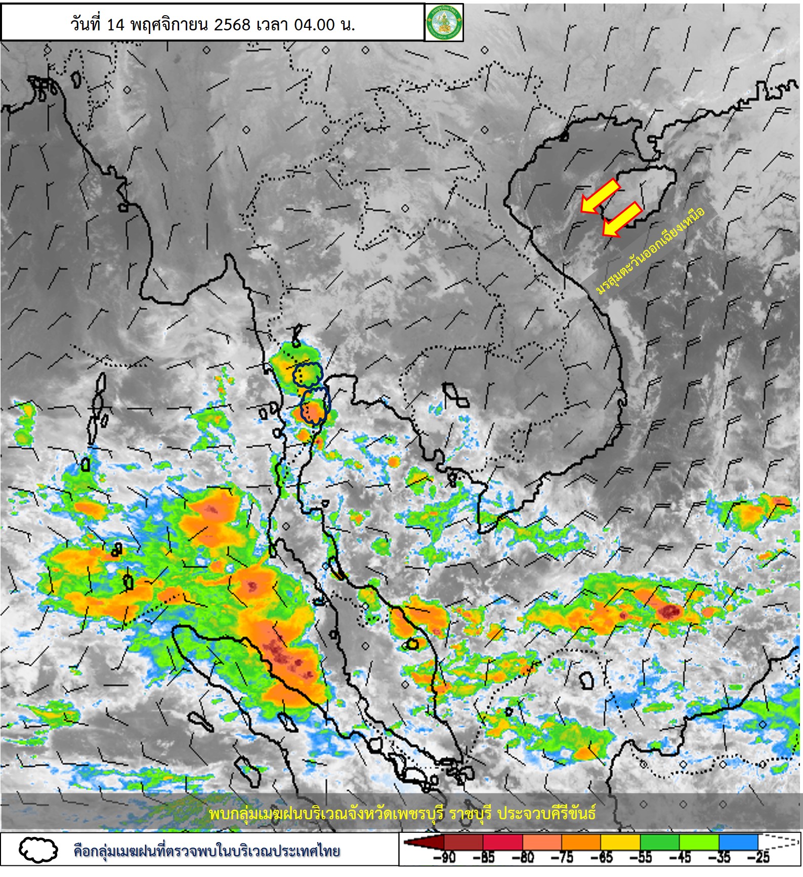 ลักษณะอากาศทั่วไป : พยากรณ์อากาศ 24 ชั่วโมงข้างหน้า ภาคตะวันออกเฉียงเหนือ ภาคเหนือ และภาคตะวันออกทางตอนบนของภาคมีอากาศเย็นในตอนเช้า โดยจะมีอุณหภูมิลดลงอีก 1-2 องศาเซลเซียส ส่วนภาคกลางด้านตะวันออกและภาคตะวันออกตอนบนจะมีอุณหภูมิลดลงเล็กน้อย เนื่องจากบริเวณความกดอากาศสูงหรือมวลอากาศเย็นกำลังปานกลางจากประเทศจีนได้แผ่ลงมาปกคลุมบริเวณดังกล่าว ส่วนภาคกลาง ภาคตะวันออก รวมทั้งกรุงเทพมหานครและปริมณฑล และภาคเหนือ มีฝนลดลงแต่ยังคงมีฝนฟ้าคะนองเกิดขึ้นได้บางพื้นที่ โดยมีฝนตกหนักบางแห่งบริเวณภาคกลางด้านตะวันตก เนื่องจากมีลมตะวันออกและลมตะวันออกเฉียงใต้พัดนำความชื้นเข้ามาปกคลุมบริเวณดังกล่าว ขอให้ประชาชนในบริเวณประเทศไทยตอนบนดูแลรักษาสุขภาพเนื่องจากสภาพอากาศที่เปลี่ยนแปลงไว้ด้วย สำหรับภาคใต้ตอนบนมีฝนฟ้าคะนองและมีฝนตกหนักบางแห่ง ส่วนคลื่นลมบริเวณอ่าวไทยตอนบน และห่างฝั่งของทะเลอันดามันมีกำลังปานกลาง โดยมีคลื่นสูง 1-2 เมตร บริเวณที่มีฝนฟ้าคะนองคลื่นสูงมากกว่า 2 เมตร ขอให้ชาวเรือบริเวณอ่าวไทยและทะเลอันดามันเดินเรือด้วยความระมัดระวังและหลีกเลี่ยงการเดินเรือในบริเวณที่มีฝนฟ้าคะนอง