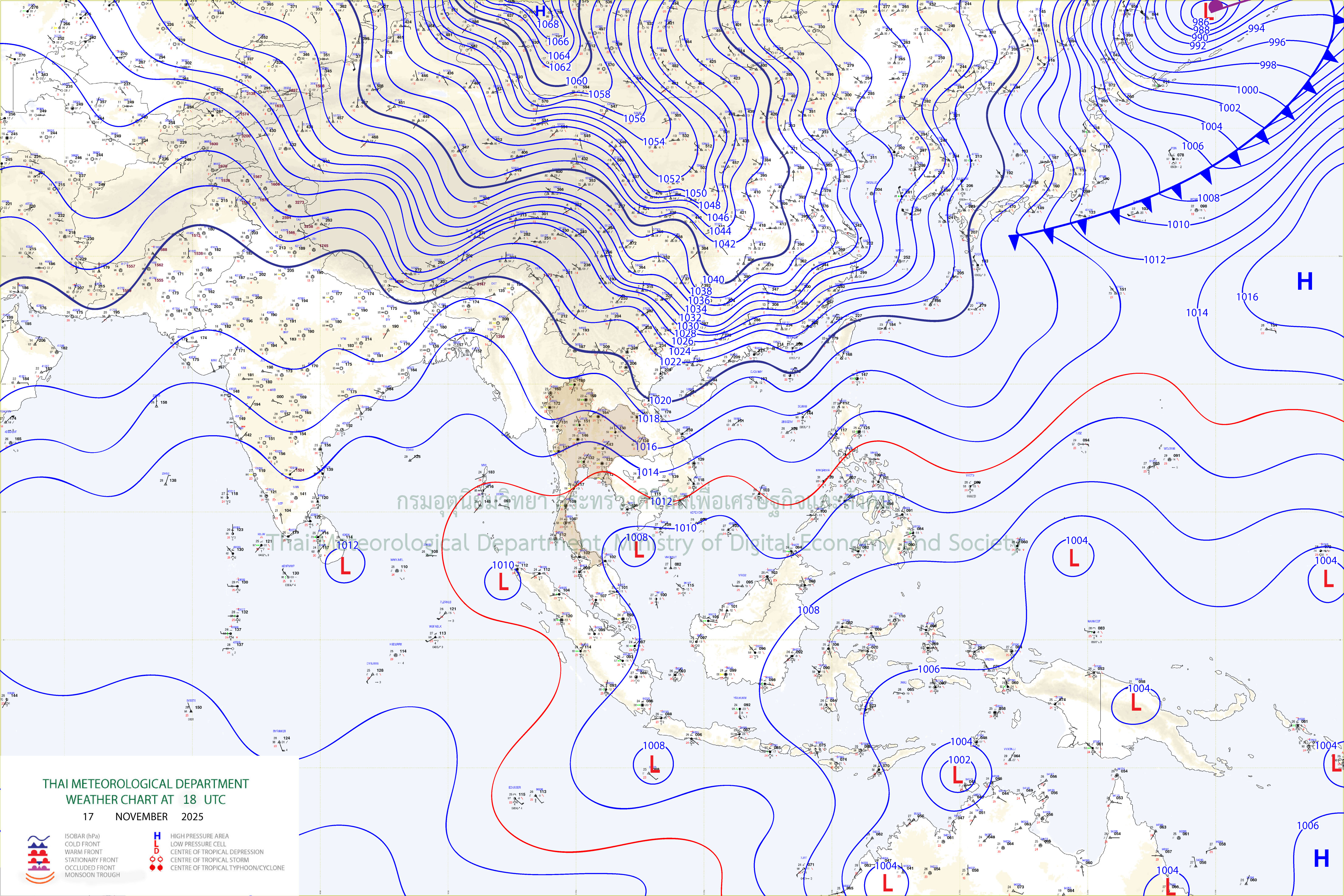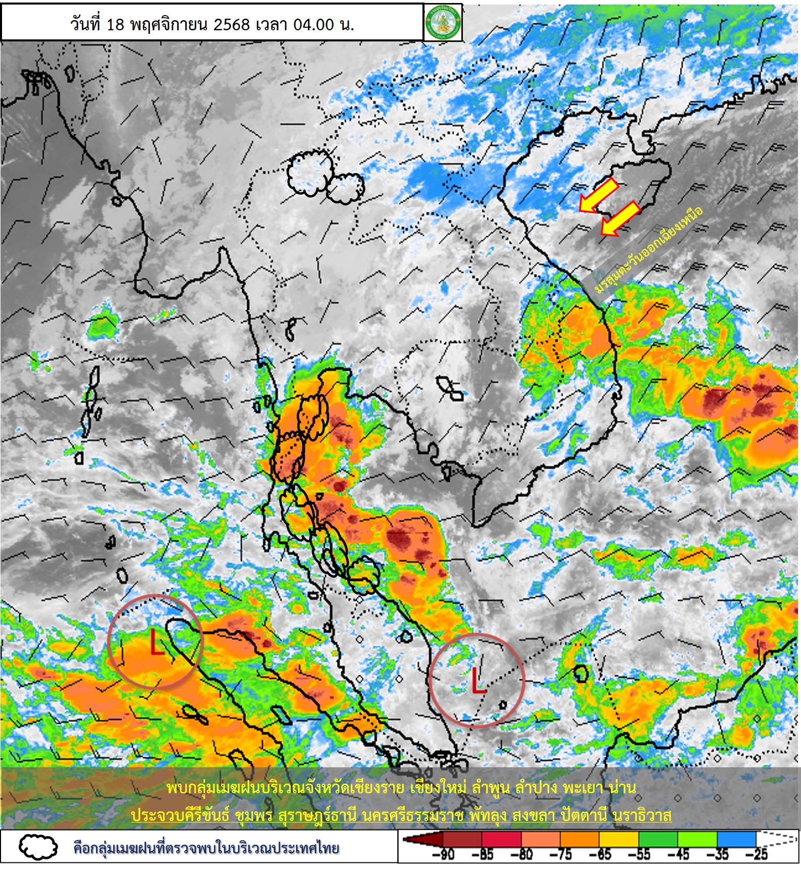 ลักษณะอากาศทั่วไป : พยากรณ์อากาศ 24 ชั่วโมงข้างหน้า ประเทศไทยตอนบนยังคงมีอากาศแปรปรวน โดยมีฝนบางพื้นที่ในระยะแรก หลังจากนั้นในช่วงวันที่ 19 – 20 พ.ย. 68 อุณหภูมิจะลดลง กับมีลมแรงโดยภาคตะวันออกเฉียงเหนือ อุณหภูมิจะลดลง 3-5 องศาเซลเซียส ส่วนภาคเหนือ ภาคกลาง รวมทั้งกรุงเทพมหานครและปริมณฑล และภาคตะวันออก อุณหภูมิจะลดลง 1-3 องศาเซลเซียส ขอให้ประชาชนในบริเวณดังกล่าวดูแลรักษาสุขภาพเนื่องจากสภาพอากาศที่เปลี่ยนแปลง ส่วนเกษตรกรควรเตรียมการป้องกันและระวังความเสียหายที่จะเกิดต่อผลผลิตทางการเกษตรไว้ด้วย ทั้งนี้เนื่องจากบริเวณความกดอากาศสูงหรือมวลอากาศเย็นกำลังแรงระลอกใหม่จากประเทศจีนได้แผ่ลงมาปกคลุมภาคตะวันออกเฉียงเหนือตอนบน และทะเลจีนใต้แล้ว คาดว่าจะแผ่ปกคลุมประเทศไทยตอนบนในวันนี้ (18 พ.ย. 68) ในขณะที่ยังคงมีลมฝ่ายตะวันออกพัดนำความชื้นเข้ามาปกคลุมประเทศไทยตอนบน สำหรับภาคใต้มีฝนตกหนักถึงหนักมากบางแห่ง เนื่องจากมรสุมตะวันออกเฉียงเหนือกำลังปานกลางที่พัดปกคลุมอ่าวไทย ภาคใต้ และทะเลอันดามันตอนบนเริ่มมีกำลังแรงขึ้น ขอให้ประชาชนในภาคใต้ระวังอันตรายจากฝนตกหนักถึงหนักมากและฝนที่ตกสะสม ซึ่งอาจทำให้เกิดน้ำท่วมฉับพลันและน้ำป่าไหลหลาก โดยเฉพาะพื้นที่ลาดเชิงเขาใกล้ทางน้ำไหลผ่านและพื้นที่ลุ่มไว้ด้วย ส่วนคลื่นลมบริเวณอ่าวไทยและห่างฝั่งของทะเลอันดามันตอนบนมีกำลังแรงขึ้น โดยมีคลื่นสูงประมาณ 2 เมตร บริเวณที่มีฝนฟ้าคะนองคลื่นสูงมากกว่า 2 เมตร ขอให้ชาวเรือบริเวณอ่าวไทยและทะเลอันดามันเดินเรือด้วยความระมัดระวัง และหลีกเลี่ยงการเดินเรือในบริเวณที่มีฝนฟ้าคะนอง