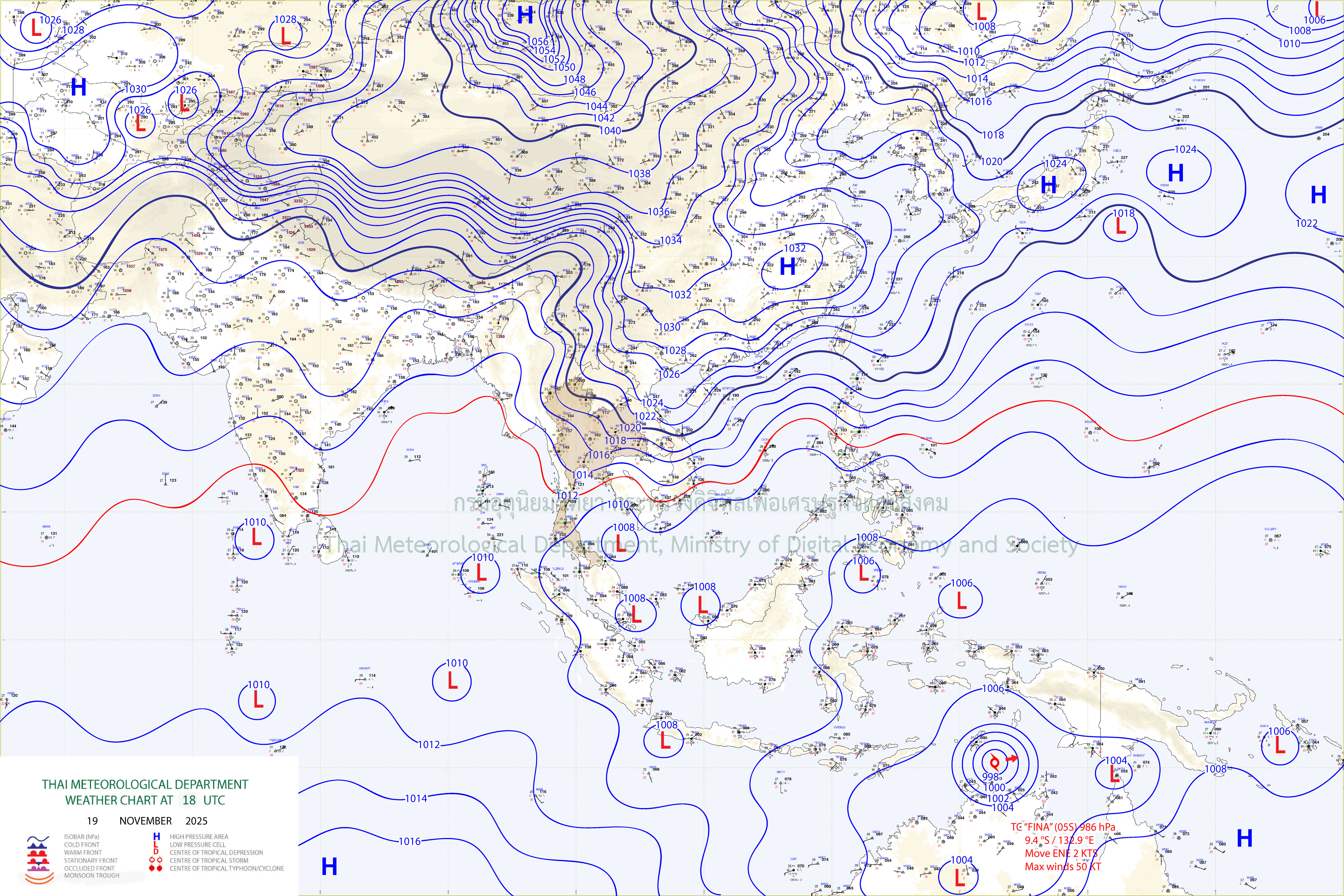 ลักษณะอากาศทั่วไป : พยากรณ์อากาศ 24 ชั่วโมงข้างหน้า ภาคเหนือและภาคตะวันออกเฉียงเหนือ มีอากาศเย็นถึงหนาว อุณหภูมิจะลดลง 1-2 องศาเซลเซียส ส่วนภาคกลาง รวมทั้งกรุงเทพมหานครและปริมณฑล และภาคตะวันออก มีอากาศเย็น ขอให้ประชาชนในบริเวณดังกล่าวดูแลรักษาสุขภาพ เนื่องจากสภาพอากาศที่หนาวเย็นลงกับมีลมแรง สำหรับเกษตรกรควรป้องกันและระวังความเสียหายที่จะเกิดต่อผลผลิตทางการเกษตรไว้ด้วย ส่วนประชาชนบริเวณภาคตะวันออกเฉียงเหนือระวังอันตรายจากอัคคีภัยเนื่องจากสภาพอากาศที่แห้งและมีลมแรง ทั้งนี้เนื่องจากบริเวณความกดอากาศสูงหรือมวลอากาศเย็นกำลังแรงจากประเทศจีนได้แผ่ลงมาปกคลุมถึงภาคใต้ตอนบนแล้ว สำหรับภาคใต้มีฝนตกหนักหลายพื้นที่และมีฝนตกหนักมากบางแห่ง เนื่องจากมรสุมตะวันออกเฉียงเหนือที่พัดปกคลุมอ่าวไทย ภาคใต้ และทะเลอันดามันตอนบนมีกำลังค่อนข้างแรง ประกอบกับมีหย่อมความกดอากาศต่ำบริเวณอ่าวไทยและภาคใต้ตอนล่าง ขอให้ประชาชนในภาคใต้ระวังอันตรายจากฝนตกหนักถึงหนักมากและฝนที่ตกสะสม ซึ่งอาจทำให้เกิดน้ำท่วมฉับพลันและน้ำป่าไหลหลาก โดยเฉพาะพื้นที่ลาดเชิงเขาใกล้ทางน้ำไหลผ่านและพื้นที่ลุ่มไว้ด้วย ส่วนคลื่นลมบริเวณอ่าวไทยมีกำลังค่อนข้างแรง โดยมีคลื่นสูง 2-3 เมตร ห่างฝั่งของทะเลอันดามันตอนบนมีคลื่นสูง 2-3 เมตร บริเวณที่มีฝนฟ้าคะนองคลื่นสูงมากกว่า 3 เมตร ขอให้ชาวเรือบริเวณอ่าวไทยและทะเลอันดามันเดินเรือด้วยความระมัดระวังและหลีกเลี่ยงการเดินเรือในบริเวณที่มีฝนฟ้าคะนอง สำหรับเรือเล็กบริเวณอ่าวไทยควรงดออกจากฝั่ง