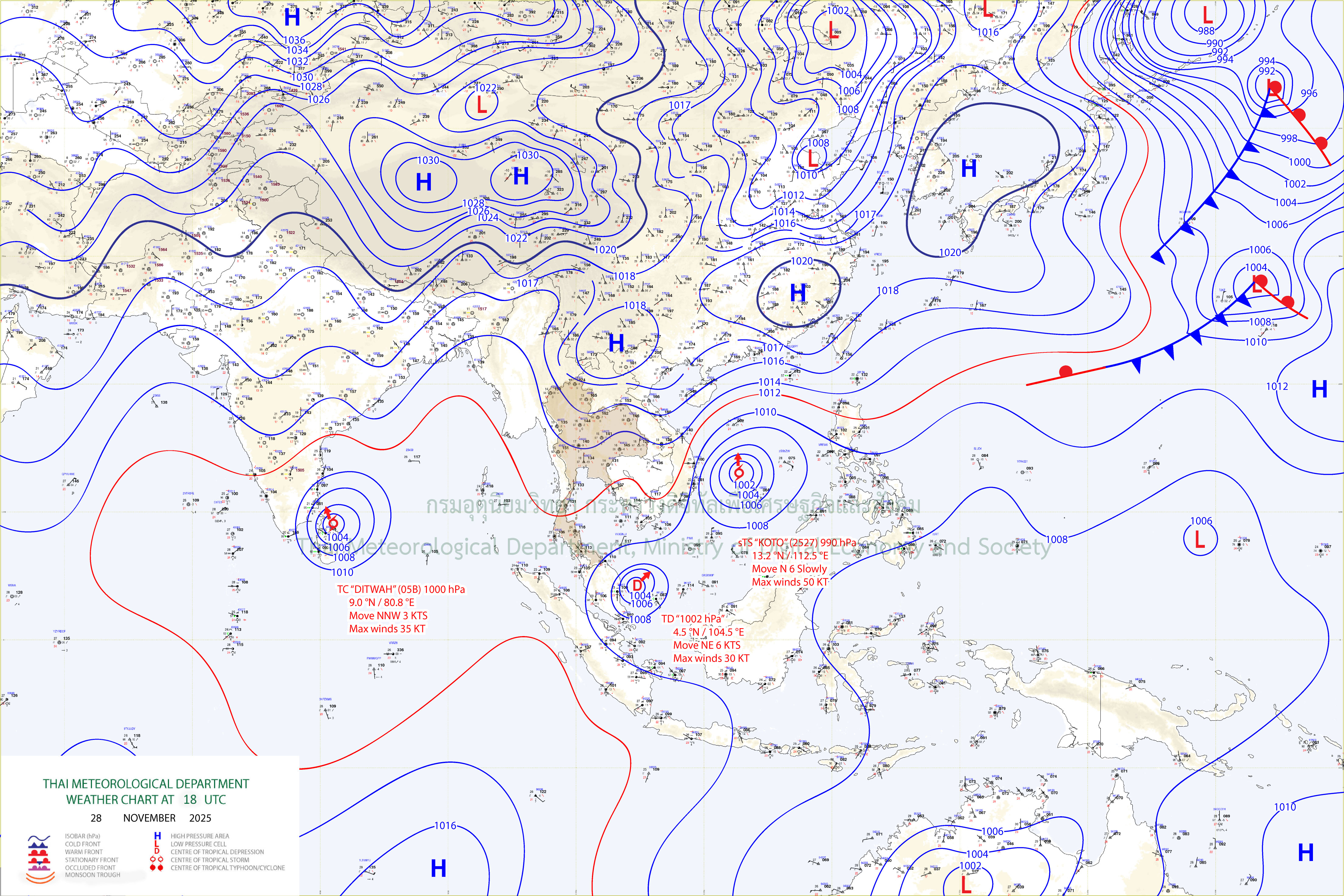 ลักษณะอากาศทั่วไป : ประเทศไทยตอนบน และภาคใต้ตอนบนมีอากาศเย็นถึงหนาวกับมีลมแรง และอุณหภูมิจะลดลงอีกเล็กน้อย โดยภาคเหนือ และภาคตะวันออกเฉียงเหนือมีอากาศหนาวจัดในบางพื้นที่ ขอให้ประชาชนในบริเวณดังกล่าวดูแลรักษาสุขภาพเนื่องจากสภาพอากาศที่หนาวเย็นลง รวมถึงให้ระวังอันตรายจากอัคคีภัยที่อาจจะเกิดขึ้นจากสภาพอากาศแห้งและลมแรง ทั้งนี้เนื่องจากบริเวณความกดอากาศสูงหรือมวลอากาศเย็นกำลังค่อนข้างแรงปกคลุมประเทศไทยตอนบนและภาคใต้ตอนบน สำหรับภาคใต้มีฝนลดลง แต่มีฝนหนักบางพื้นที่ทางตอนล่างของภาค เนื่องจากมรสุมตะวันออกเฉียงเหนือกำลังปานกลางพัดปกคลุมอ่าวไทย ภาคใต้ และทะเลอันดามันส่วนคลื่นลมบริเวณอ่าวไทยมีกำลังปานกลาง โดยมีคลื่นสูงประมาณ 2 เมตร บริเวณที่มีฝนฟ้าคะนองคลื่นสูงมากกว่า 2 เมตร ขอให้ชาวเรือบริเวณอ่าวไทยและทะเลอันดามันเดินเรือด้วยความระมัดระวังและหลีกเลี่ยงการเดินเรือในบริเวณที่มีฝนฟ้าคะนอง อนึ่ง พายุโซนร้อนกำลังแรง “โคโตะ” (KOTO) บริเวณทะเลจีนใต้ตอนกลาง คาดว่าจะเคลื่อนเข้าใกล้ชายฝั่งประเทศเวียดนามในช่วงวันที่ 30 พ.ย. - 2 ธ.ค. 68 ในขณะที่บริเวณความกดอากาศสูงหรือมวลอากาศเย็นปกคลุมบริเวณประเทศเวียดนามและทะเลจีนใต้ตอนบน ส่งผลให้พายุนี้จะอ่อนกำลังลงอย่างรวดเร็วตามลำดับ และมีพายุดีเปรสชันบริเวณทะลจีนใต้ด้านตะวันออกของประเทศมาเลเซีย มีแนวโน้มเคลื่อนออกไปทางทะเลจีนใต้ตอนกลาง โดยพายุทั้งสองนี้ไม่เคลื่อนเข้าสู่ประเทศไทย