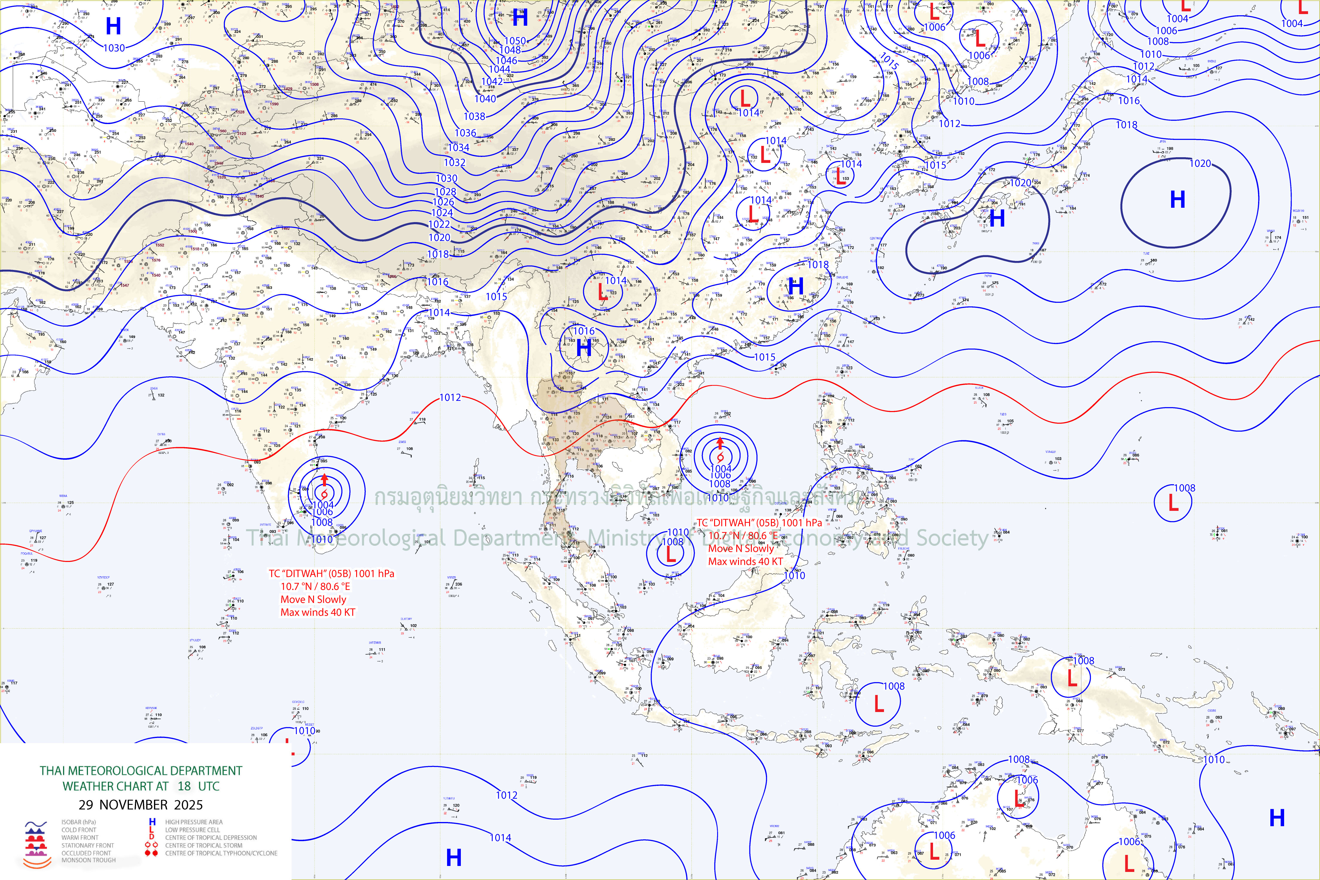 อนึ่ง พายุโซนร้อนกำลังแรง “โคโตะ” (KOTO) บริเวณทะเลจีนใต้ตอนกลาง คาดว่าจะเคลื่อนเข้าใกล้ชายฝั่งประเทศเวียดนามในช่วงวันที่ 1-2 ธ.ค. 68 ในขณะที่บริเวณความกดอากาศสูงหรือมวลอากาศเย็นปกคลุมบริเวณประเทศเวียดนามและทะเลจีนใต้ตอนบน ส่งผลให้พายุนี้จะอ่อนกำลังลงอย่างรวดเร็วตามลำดับ โดยพายุนี้ไม่เคลื่อนเข้าสู่ประเทศไทย