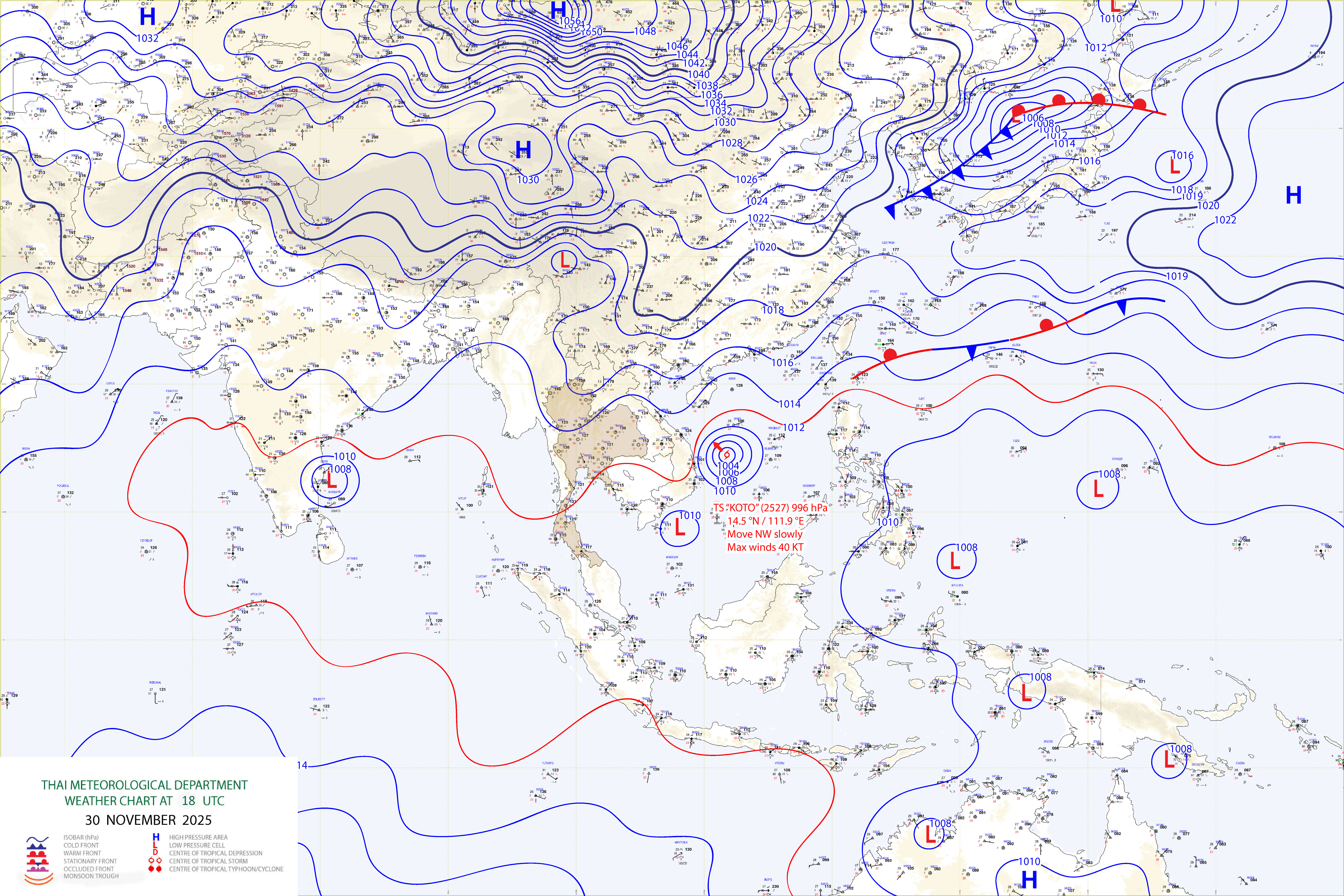 -อนึ่ง พายุโซนร้อน “โคโตะ” (KOTO) บริเวณทะเลจีนใต้ตอนกลางมีแนวโน้มจะเคลื่อนเข้าใกล้ชายฝั่งประเทศเวียดนามในช่วงวันที่ 1-2 ธ.ค. 68 ในขณะที่บริเวณความกดอากาศสูงหรือมวลอากาศเย็นปกคลุมบริเวณประเทศเวียดนามและทะเลจีนใต้ตอนบน ส่งผลให้พายุนี้จะอ่อนกำลังลงอย่างรวดเร็วตามลำดับ โดยพายุนี้ไม่เคลื่อนเข้าสู่ประเทศไทย