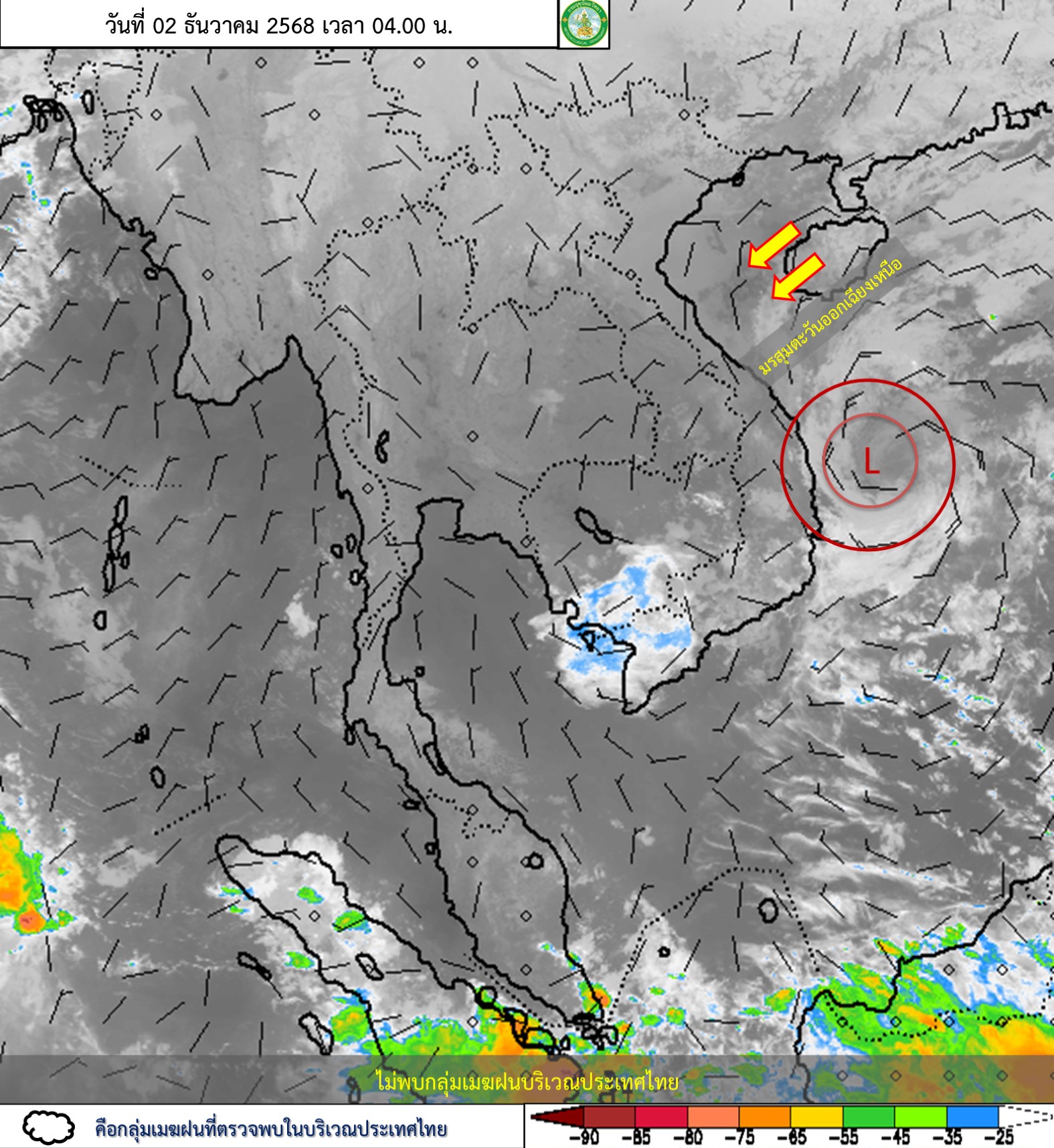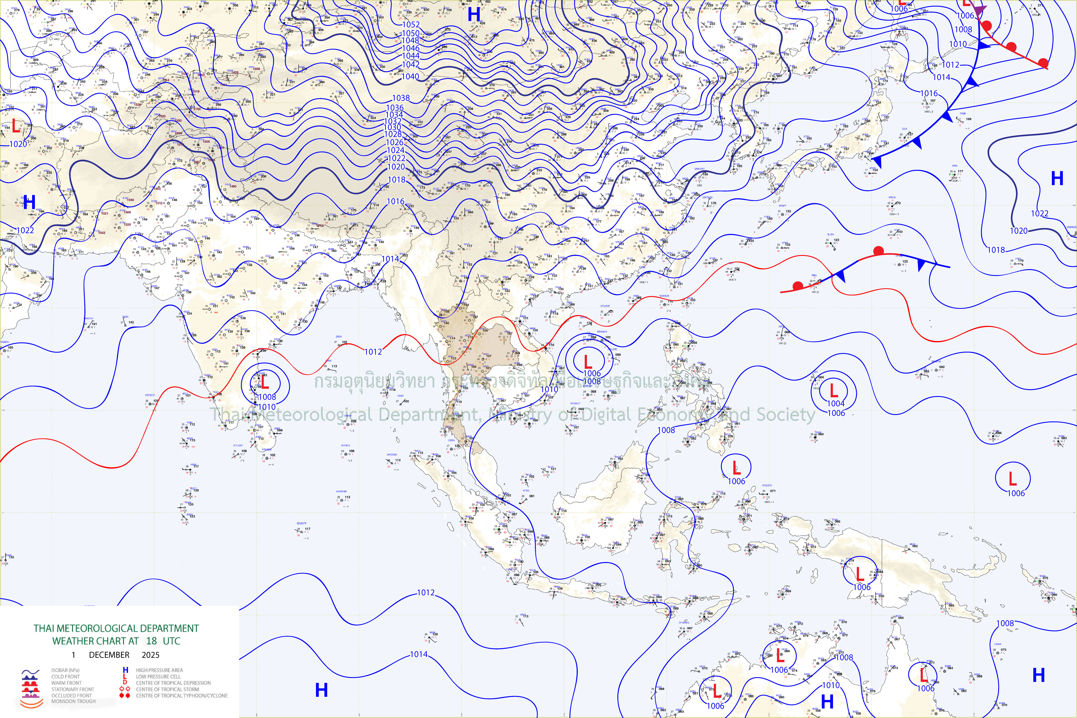 ลักษณะอากาศทั่วไป : พยากรณ์อากาศ 24 ชั่วโมงข้างหน้า ประเทศไทยตอนบนมีอุณหภูมิสูงขึ้นและมีหมอกในตอนเช้า แต่ยังคงมีอากาศเย็นถึงหนาว ขอให้ประชาชนในบริเวณดังกล่าวดูแลรักษาสุขภาพเนื่องจากสภาพอากาศที่เปลี่ยนแปลง รวมถึงให้ระวังอันตรายจากอัคคีภัยที่อาจเกิดขึ้นจากอากาศแห้งไว้ด้วย เนื่องจากบริเวณความกดอากาศสูงหรือมวลอากาศเย็นที่ปกคลุมประเทศไทยตอนบน และทะเลจีนใต้มีกำลังอ่อนลง สำหรับภาคใต้มีฝนน้อย เนื่องจากมรสุมตะวันออกเฉียงเหนือที่พัดปกคลุมอ่าวไทย ภาคใต้ และทะเลอันดามันมีกำลังอ่อนลง โดยคลื่นลมบริเวณอ่าวไทยและทะเลอันดามันมีคลื่นสูงประมาณ 1 เมตร บริเวณที่มีฝนฟ้าคะนองคลื่นสูงมากกว่า 1 เมตร ขอให้ชาวเรือบริเวณอ่าวไทยและทะเลอันดามันเดินเรือด้วยความระมัดระวังและหลีกเลี่ยงการเดินเรือในบริเวณที่มีฝนฟ้าคะนอง