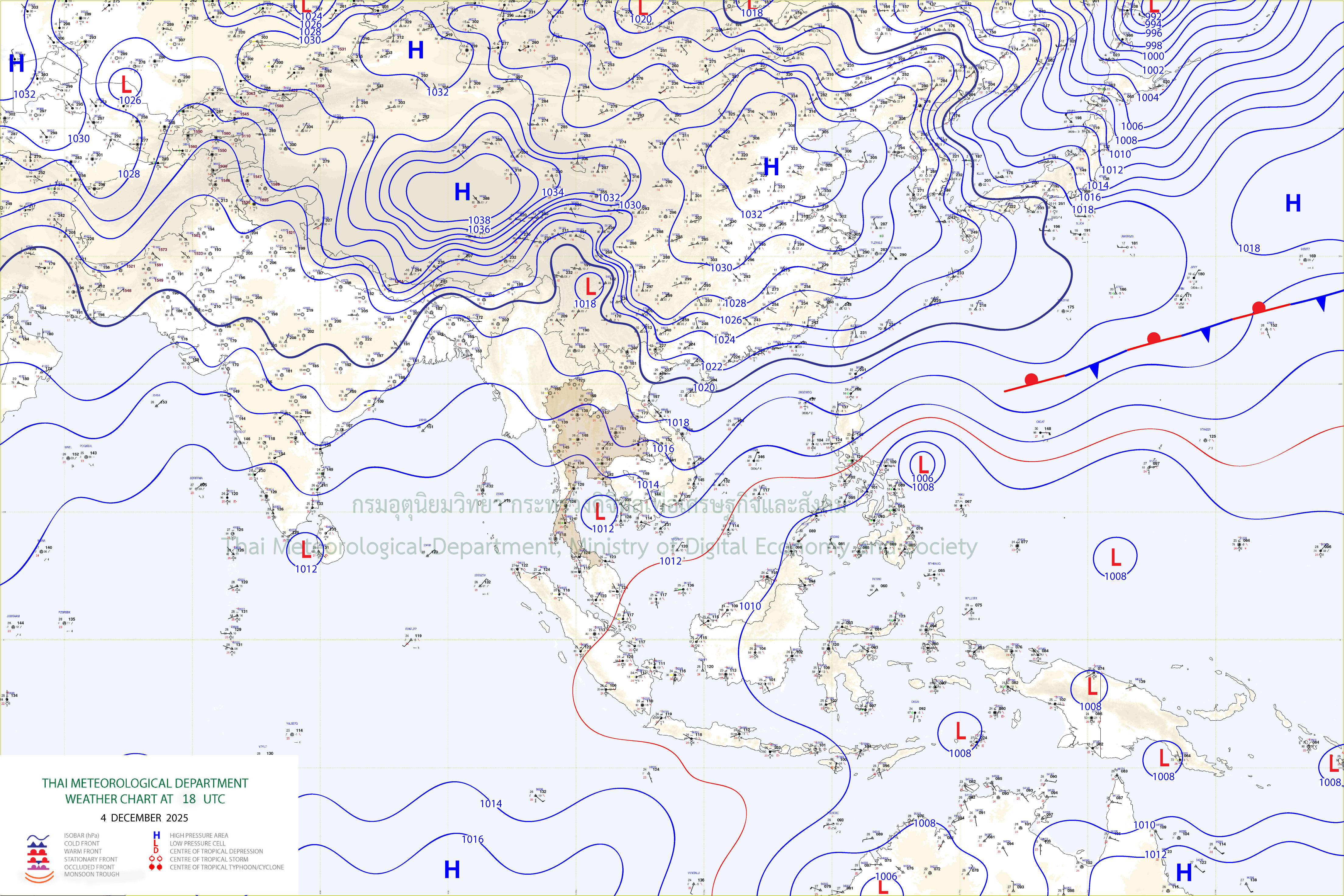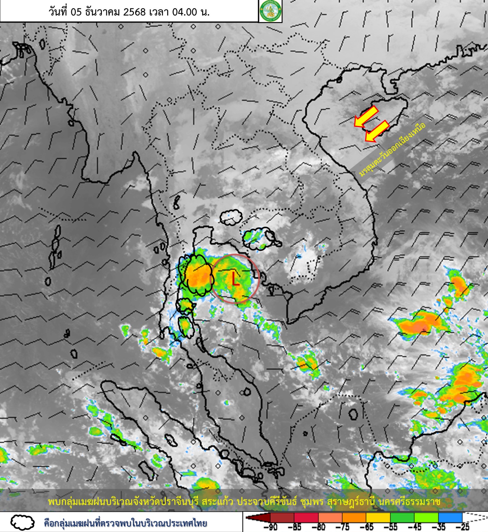 ลักษณะอากาศทั่วไป : พยากรณ์อากาศ 24 ชั่วโมงข้างหน้า ภาคใต้มีฝนเพิ่มขึ้นและมีฝนตกหนักถึงหนักมากบางแห่ง โดยเฉพาะบริเวณจังหวัดนครศรีธรรมราช พัทลุง สงขลา ปัตตานี ยะลา นราธิวาส พังงา ภูเก็ต ตรัง และสตูล ส่วนประเทศไทยตอนบน มีฝน/ฝนฟ้าคะนองเกิดขึ้นได้บางพื้นที่บริเวณภาคตะวันออกเฉียงเหนือตอนล่างและภาคตะวันออก แต่ยังคงมีอากาศเย็นในตอนเช้า ขอให้ประชาชนบริเวณภาคใต้ระวังอันตรายจากฝนตกหนักและฝนที่ตกสะสม ส่วนประชาชนในบริเวณประเทศไทยตอนบนดูแลรักษาสุขภาพจากสภาพอากาศที่เปลี่ยนแปลง และเพิ่มความระมัดระวังในการสัญจรผ่านบริเวณที่มีหมอก รวมถึงให้ระวังอันตรายจากอัคคีภัยที่อาจเกิดขึ้นได้จากสภาพอากาศแห้งไว้ด้วย เนื่องจากบริเวณความกดอากาศสูงหรือมวลอากาศเย็นกำลังปานกลางจากประเทศจีนได้แผ่ลงมาปกคลุมภาคเหนือตอนบน ภาคตะวันออกเฉียงเหนือและทะเลจีนใต้แล้ว ส่งผลทำให้มีลมตะวันออกพัดนำความชื้นเข้ามาปกคลุมภาคตะวันออกเฉียงเหนือตอนล่าง ภาคกลาง ภาคตะวันออก อ่าวไทย และภาคใต้ สำหรับบริเวณอ่าวไทยมีคลื่นสูง 1-2 เมตร บริเวณที่มีฝนฟ้าคะนองคลื่นสูงมากกว่า 2 เมตร ขอให้ชาวเรือบริเวณอ่าวไทยและทะเลอันดามัน ควรเพิ่มความระมัดระวังในการเดินเรือ และหลีกเลี่ยงการเดินเรือในบริเวณที่มีฝนฟ้าคะนอง