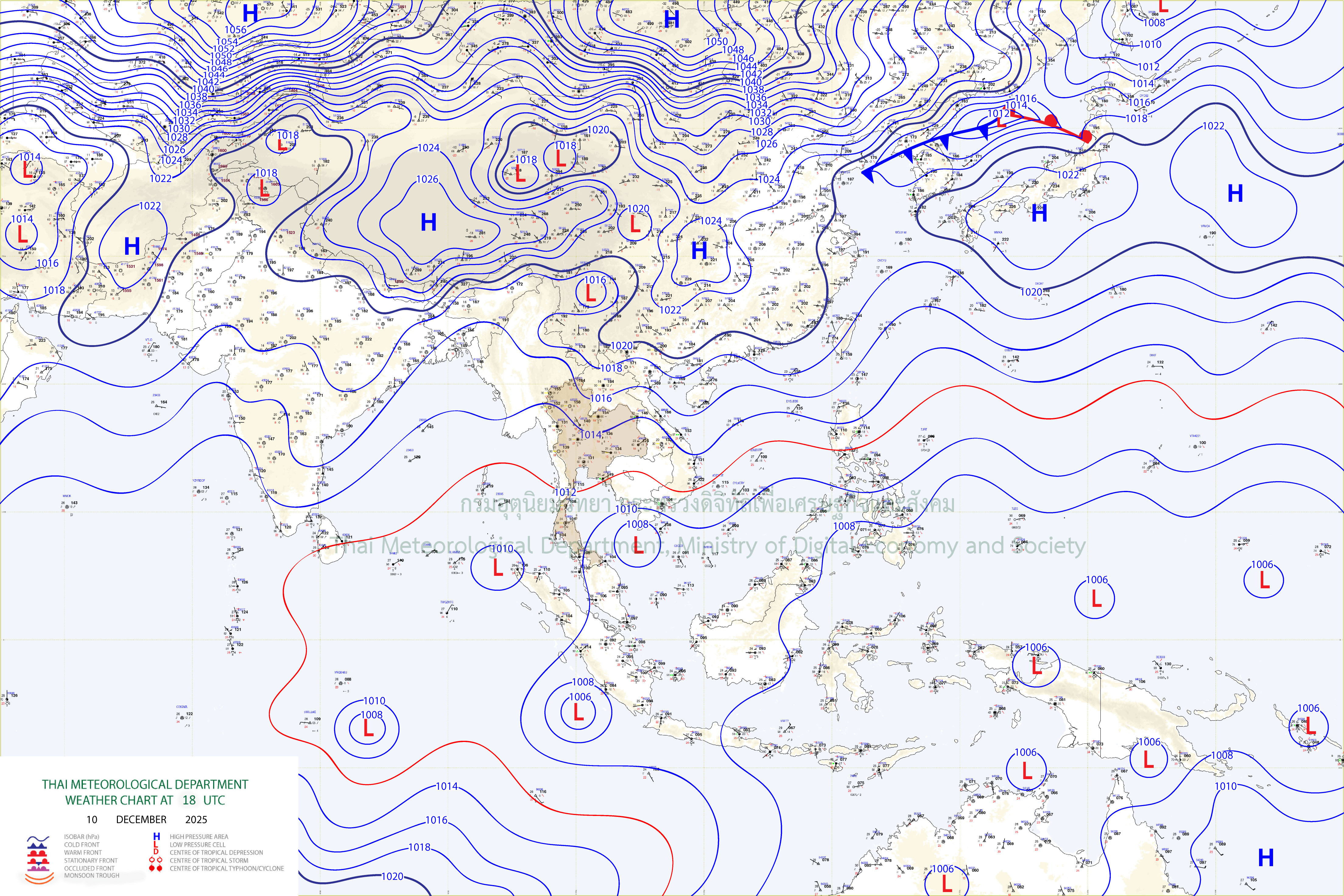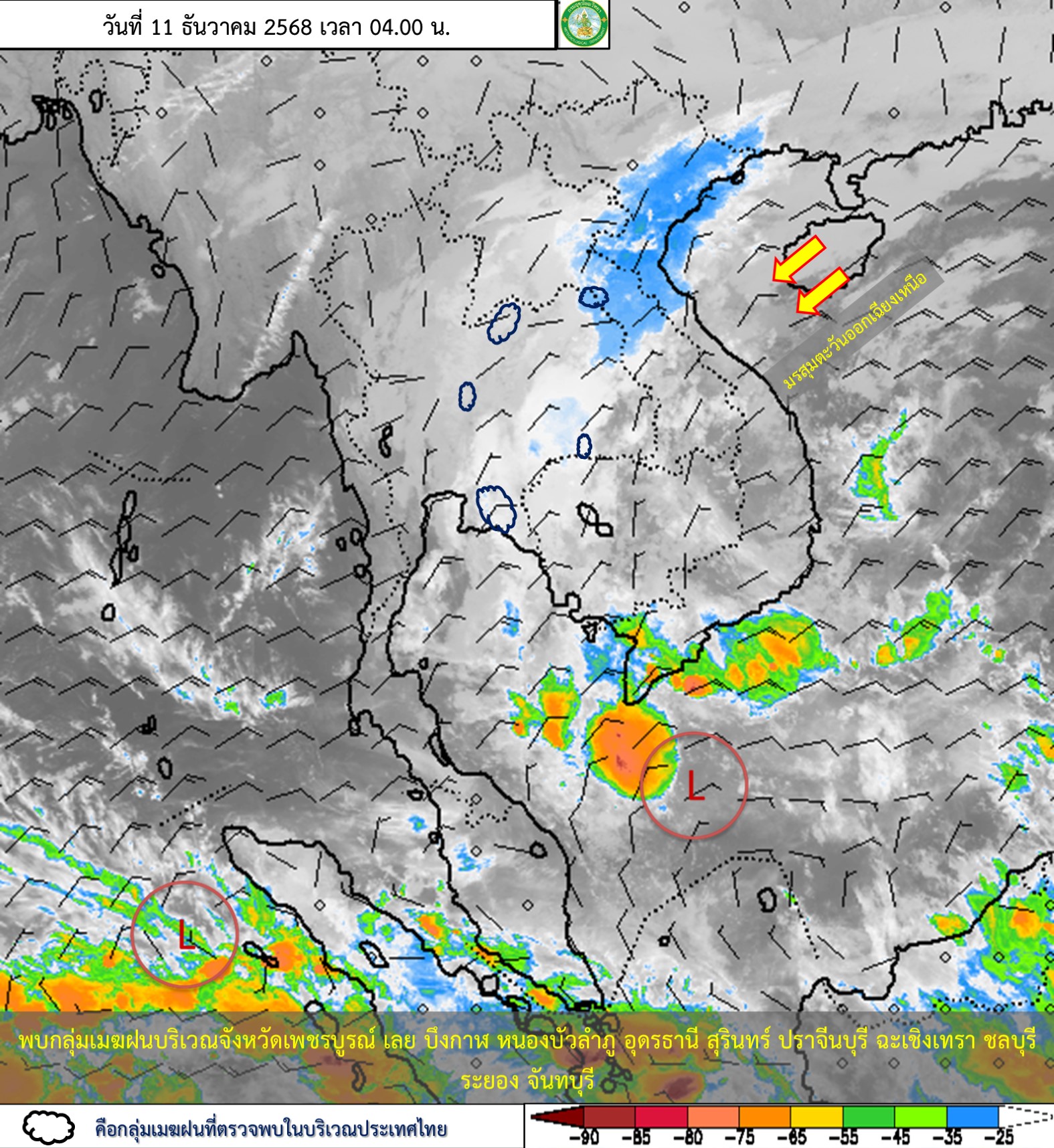 ลักษณะอากาศทั่วไป : พยากรณ์อากาศ 24 ชั่วโมงข้างหน้า ประเทศไทยตอนบนมีอุณหภูมิสูงขึ้นกับมีอากาศเย็นและมีหมอกบางในตอนเช้า โดยบริเวณภาคตะวันออกเฉียงเหนือตอนล่าง ภาคตะวันออก ภาคกลางตอนล่าง รวมทั้งกรุงเทพมหานครและปริมณฑล จะมีฝนเกิดขึ้นได้บางพื้นที่ ขอให้ประชาชนดูแลรักษาสุขภาพเนื่องจากสภาพอากาศที่เปลี่ยนแปลง และเพิ่มความระมัดระวังในการสัญจรผ่านบริเวณที่มีหมอก เกษตรกรควรเตรียมการป้องกันและระวังความเสียหายที่จะเกิดต่อผลลิตทางการเกษตรไว้ด้วย ทั้งนี้เนื่องจากบริเวณความกดอากาศสูงหรือมวลอากาศเย็นที่ปกคลุมประเทศไทยตอนบนและทะเลจีนใต้มีกำลังอ่อนลง ในขณะที่มีลมตะวันออกเฉียงใต้พัดเข้ามาปกคลุมบริเวณภาคตะวันออกเฉียงเหนือตอนล่าง และอ่าวไทยตอนบน