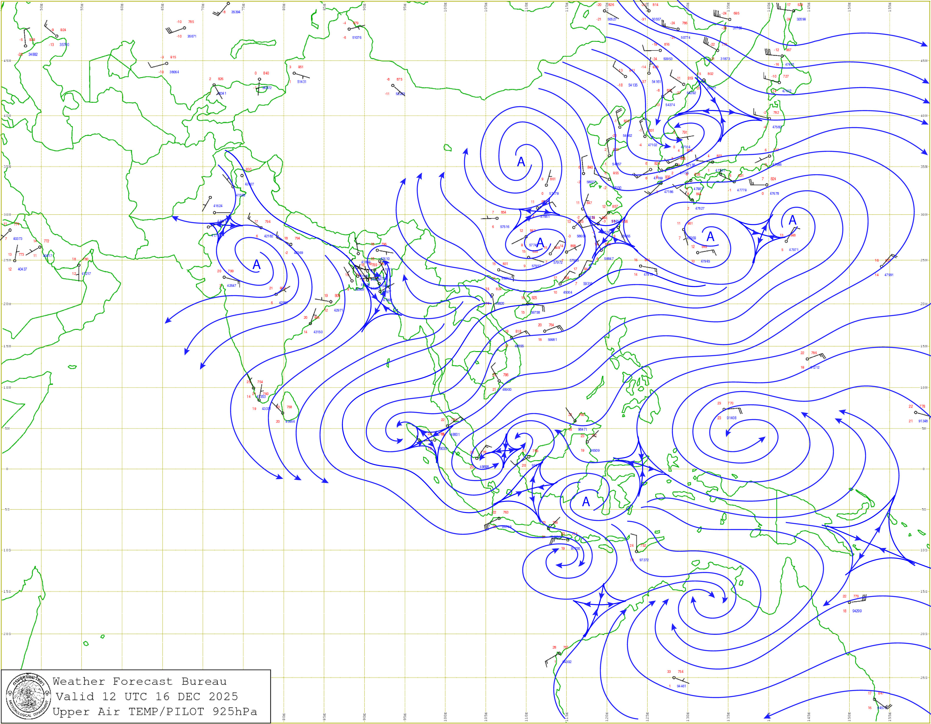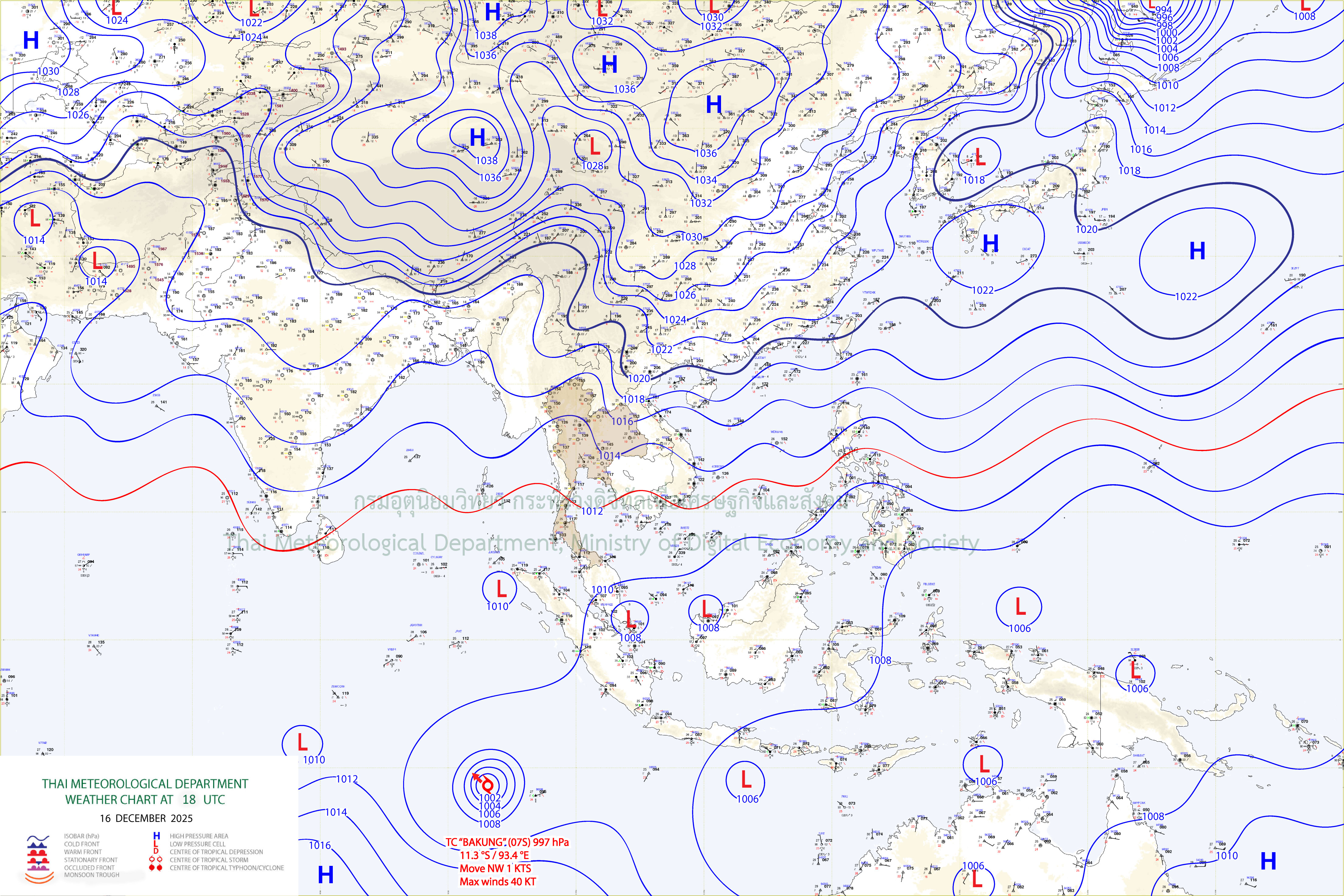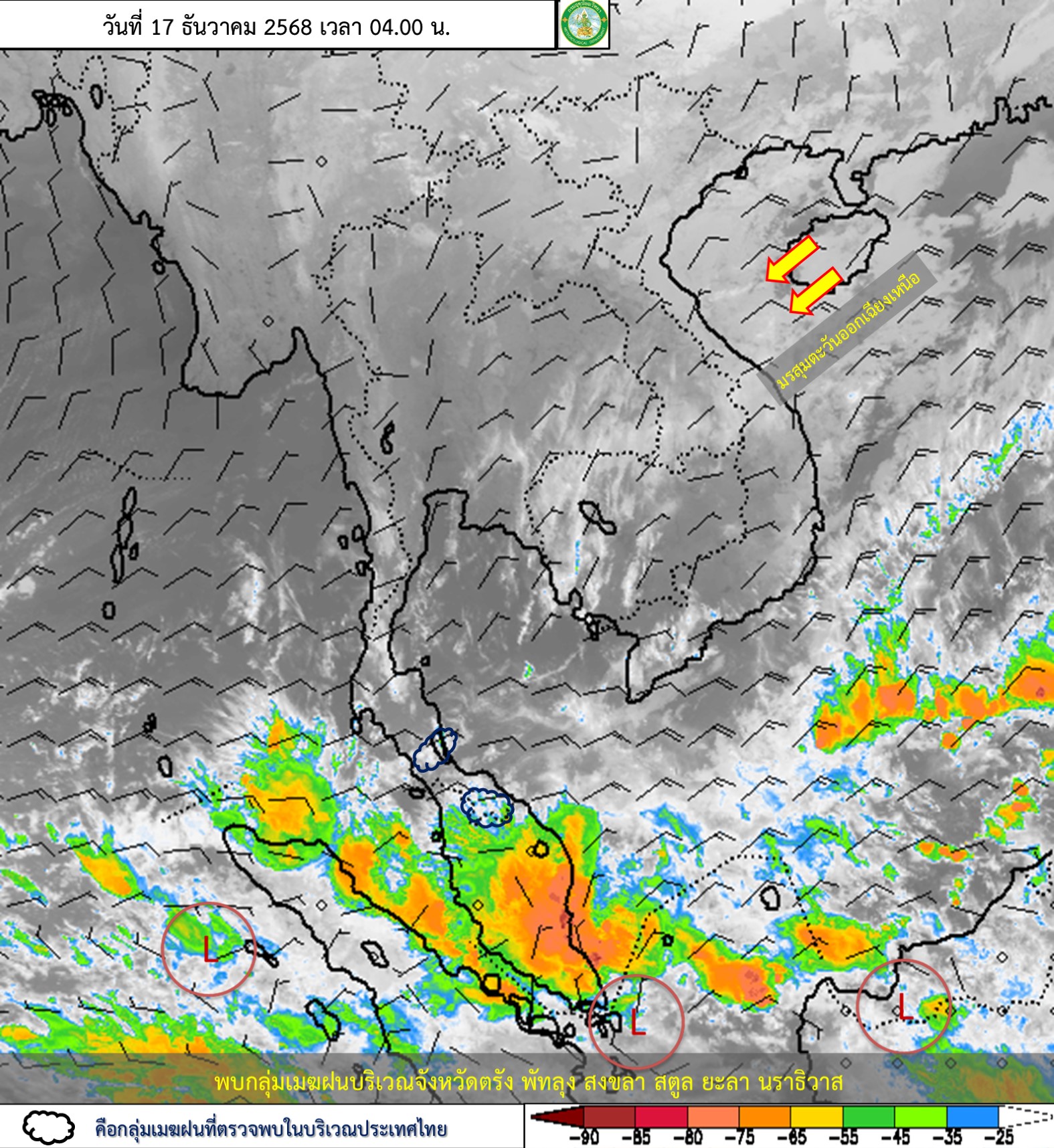 ลักษณะอากาศทั่วไป : พยากรณ์อากาศ 24 ชั่วโมงข้างหน้า มรสุมตะวันออกเฉียงเหนือที่พัดปกคลุมอ่าวไทย ภาคใต้ และทะเลอันดามันมีกำลังปานกลาง ทำให้ภาคใต้มีฝนลดลง แต่ยังคงมีฝนตกหนักบางแห่งบริเวณจังหวัดสงขลา ปัตตานี ยะลา และนราธิวาส ขอให้ประชาชนบริเวณภาคใต้ตอนล่างระวังอันตรายจากฝนตกหนักและฝนที่ตกสะสม ซึ่งอาจทำให้เกิดน้ำท่วมฉับพลันและน้ำป่าไหลหลาก โดยเฉพาะพื้นที่ลาดเชิงเขาใกล้ทางน้ำไหลผ่านและพื้นที่ลุ่ม ส่วนคลื่นลมบริเวณอ่าวไทยมีกำลังอ่อนลงเป็นปานกลาง โดยอ่าวไทยตอนล่างมีคลื่นสูงประมาณ 2 เมตร บริเวณที่มีฝนฟ้าคะนองคลื่นสูงมากกว่า 2 เมตร ขอให้ชาวเรือบริเวณอ่าวไทยและทะเลอันดามันเดินเรือด้วยความระมัดระวัง และหลีกเลี่ยงการเดินเรือในบริเวณที่มีฝนฟ้าคะนองตลอดช่วง