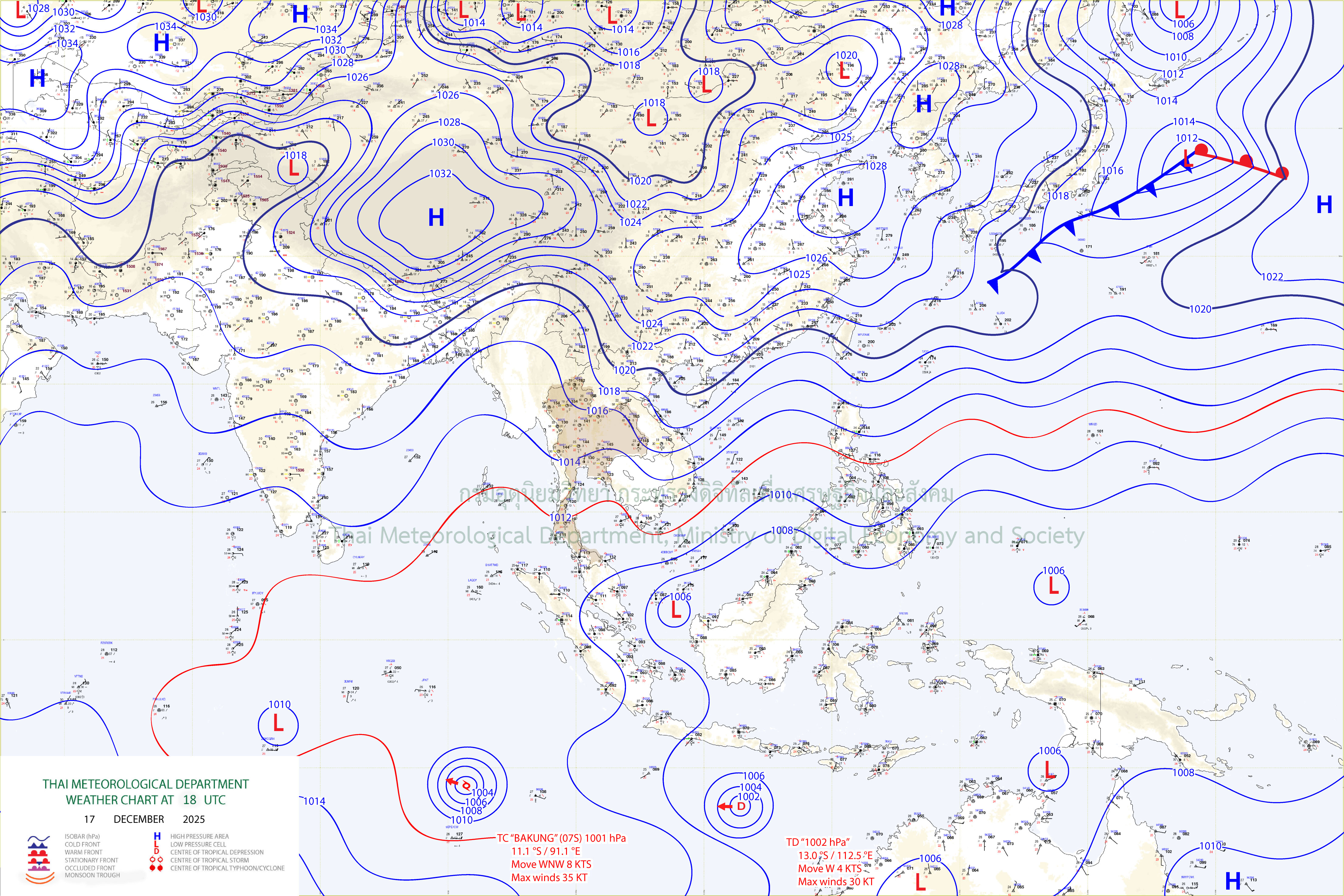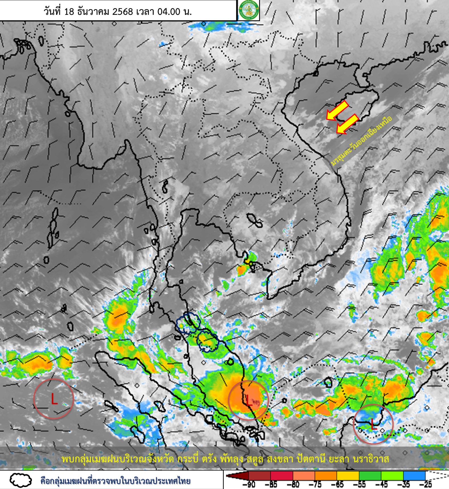 ลักษณะอากาศทั่วไป : พยากรณ์อากาศ 24 ชั่วโมงข้างหน้า ประเทศไทยตอนบนมีอากาศเย็นถึงหนาวในตอนเช้า และอุณหภูมิจะลดลง 1-3 องศาเซลซียส โดยมีฝนเกิดขึ้นได้บางพื้นที่ ในภาคเหนือตอนบนและภาคตะวันออกเฉียงเหนือตอนบน เนื่องจากบริเวณความกดอากาศสูงหรือมวลอากาศเย็นยังคงปกคลุมประเทศไทยตอนบน ในขณะที่คลื่นกระแสลมฝ่ายตะวันตกจากประเทศเมียนมาเคลื่อนเข้าปกคลุมภาคเหนือและประเทศลาวตอนบน ขอให้ประชาชนในบริเวณดังกล่าวดูแลรักษาสุขภาพเนื่องจากสภาพอากาศที่เปลี่ยนแปลง ส่วนเกษตรกรในภาคเหนือควรเตรียมการป้องกันและระวังความเสียหายที่อาจจะเกิดต่อผลผลิตทางการเกษตร สำหรับภาคใต้มีฝนลดลง แต่ยังคงมีฝนตกหนักบางแห่งบริเวณจังหวัดสงขลา ปัตตานี ยะลา และนราธิวาส เนื่องจากมรสุมตะวันออกเฉียงเหนือที่พัดปกคลุมอ่าวไทย ภาคใต้ และทะเลอันดามันมีกำลังปานกลาง ขอให้ประชาชนบริเวณภาคใต้ตอนล่างระวังอันตรายจากฝนตกหนักและฝนที่ตกสะสม ซึ่งอาจทำให้เกิดน้ำท่วมฉับพลันและน้ำป่าไหลหลาก โดยเฉพาะพื้นที่ลาดเชิงเขาใกล้ทางน้ำไหลผ่านและพื้นที่ลุ่ม ส่วนคลื่นลมบริเวณอ่าวไทยและห่างฝั่งทะเลอันดามันมีกำลังปานกลาง โดยอ่าวไทยตอนล่างมีคลื่นสูงประมาณ 2 เมตร อ่าวไทยตอนบนและห่างฝั่งทะเลอันดามันมีคลื่นสูง 1-2 เมตร บริเวณที่มีฝนฟ้าคะนองคลื่นสูงมากกว่า 2 เมตร ขอให้ชาวเรือบริเวณอ่าวไทยและทะเลอันดามันเดินเรือด้วยความระมัดระวัง และหลีกเลี่ยงการเดินเรือในบริเวณที่มีฝนฟ้าคะนอง