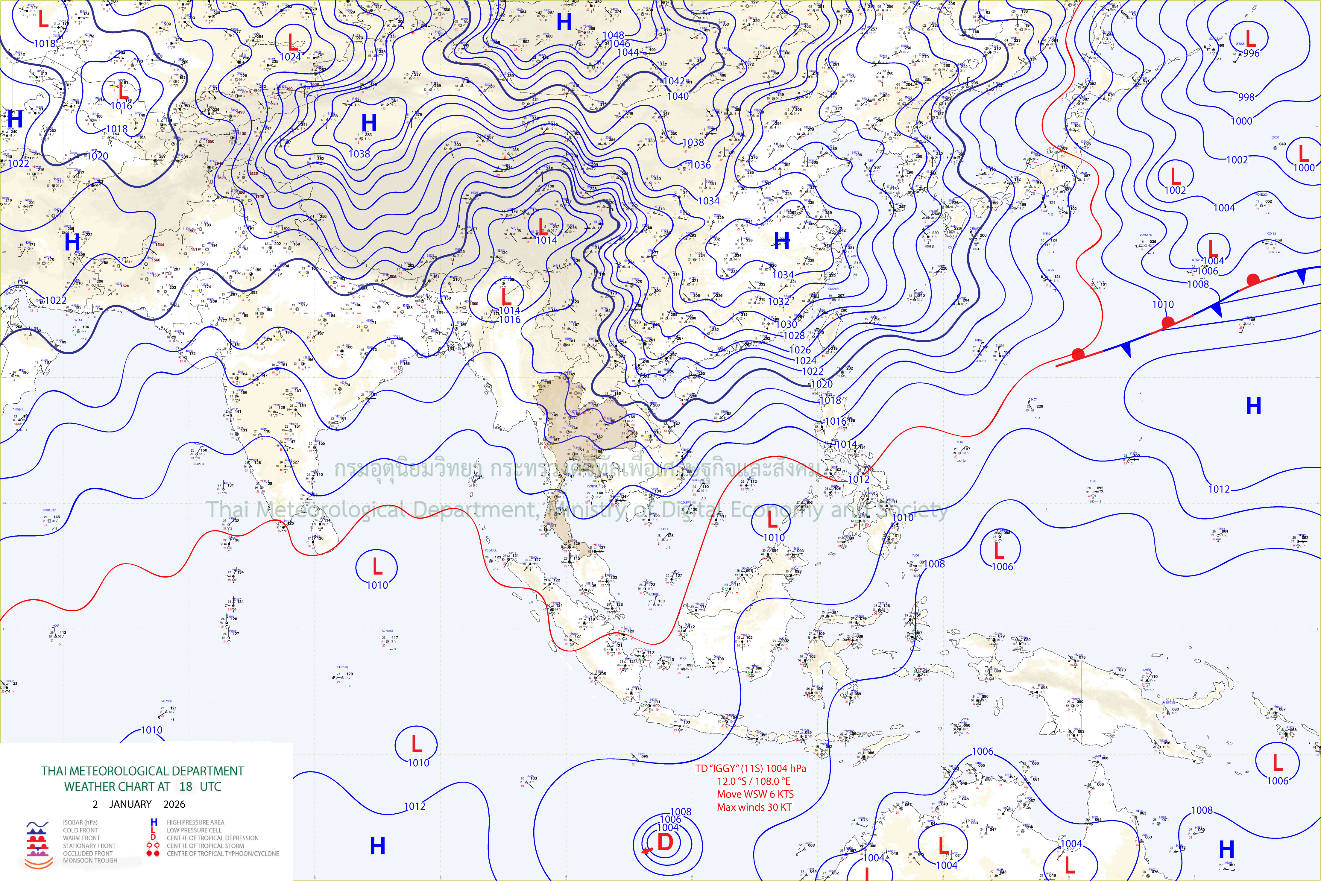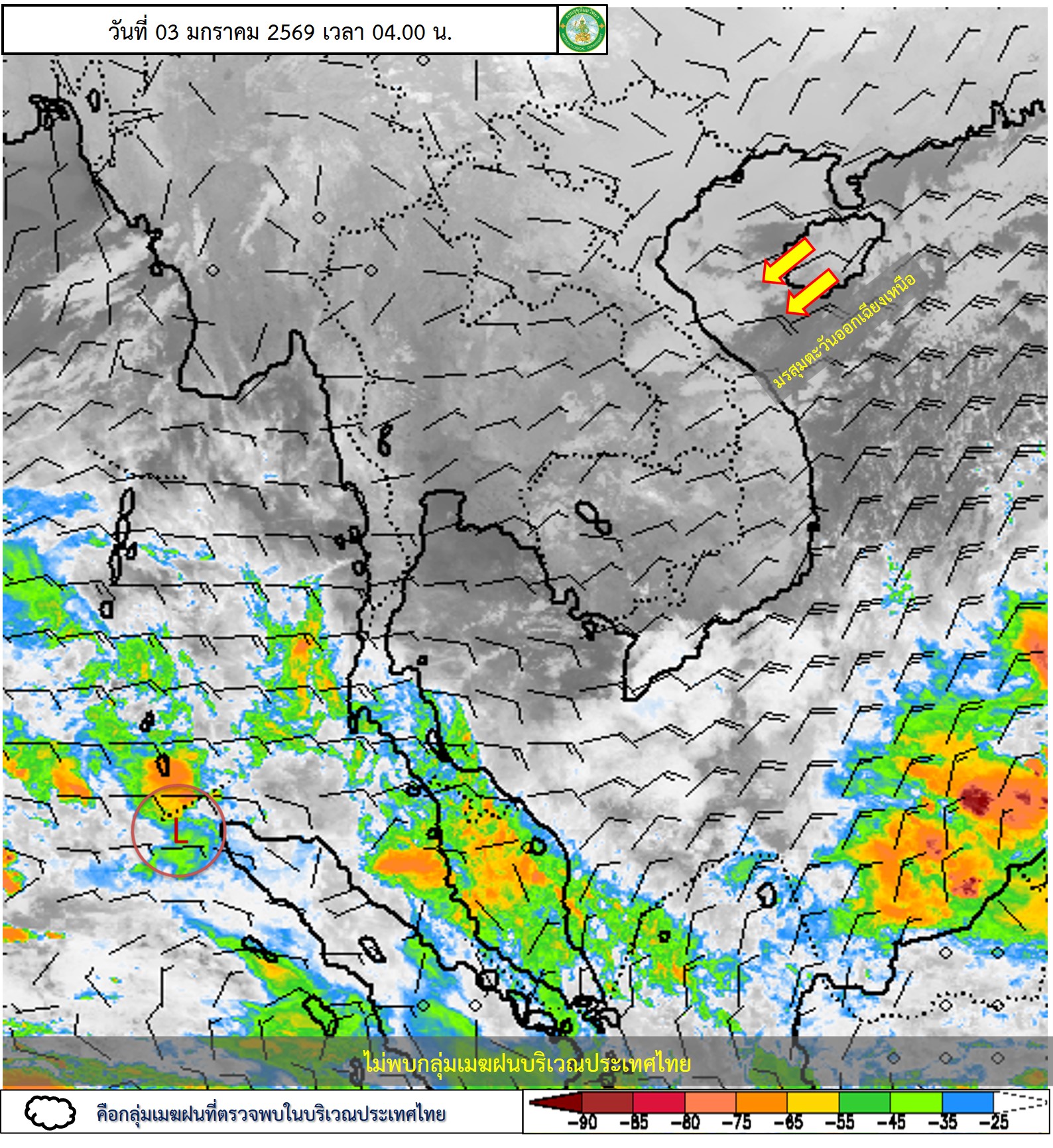 ลักษณะอากาศทั่วไป : พยากรณ์อากาศ 24 ชั่วโมงข้างหน้า ประเทศไทยตอนบนจะมีอากาศเย็นถึงหนาว กับมีลมแรง โดยภาคตะวันออกเฉียงเหนือจะมีอุณหภูมิลดลง 2–4 องศาเซลเซียส ส่วนภาคเหนือ ภาคกลาง รวมทั้งกรุงเทพมหานครและปริมณฑล ภาคตะวันออก และภาคใต้ตอนบนจะมีอุณหภูมิลดลง 1–3 องศาเซลเซียส เนื่องจากบริเวณความกดอากาศสูงหรือมวลอากาศเย็นกำลังค่อนข้างแรงระลอกใหม่จากประเทศจีนได้แผ่ลงมาปกคลุมประเทศไทยตอนบนและภาคใต้ตอนบนแล้ว ขอให้ประชาชนในบริเวณดังกล่าวดูแลรักษาสุขภาพเนื่องจากสภาพอากาศที่หนาวเย็นลง รวมทั้งระวังอันตรายจากอัคคีภัยเนื่องจากสภาพอากาศแห้งและลมแรง สำหรับภาคใต้ตอนล่างมีฝนฟ้าคะนองบางแห่ง เนื่องจากมรสุมตะวันออกเฉียงเหนือที่พัดปกคลุมอ่าวไทย ภาคใต้ และทะเลอันดามันมีกำลังแรงขึ้น ส่วนคลื่นลมบริเวณอ่าวไทยและทะเลอันดามันมีกำลังแรงขึ้น โดยอ่าวไทยตอนล่างมีคลื่นสูงประมาณ 2 เมตร อ่าวไทยตอนบนและห่างฝั่งทะเลอันดามันมีคลื่นสูง 1–2 เมตร บริเวณที่มีฝนฟ้าคะนองคลื่นสูงมากกว่า 2 เมตร ขอให้ชาวเรือในบริเวณดังกล่าวเดินเรือด้วยความระมัดระวัง และหลีกเลี่ยงการเดินเรือในบริเวณที่มีฝนฟ้าคะนอง ประชาชนบริเวณชายฝั่งภาคใต้ฝั่งตะวันออกตอนล่างควรระมัดระวังคลื่นที่ซัดเข้าหาฝั่งในระยะนี้ไว้ด้วย