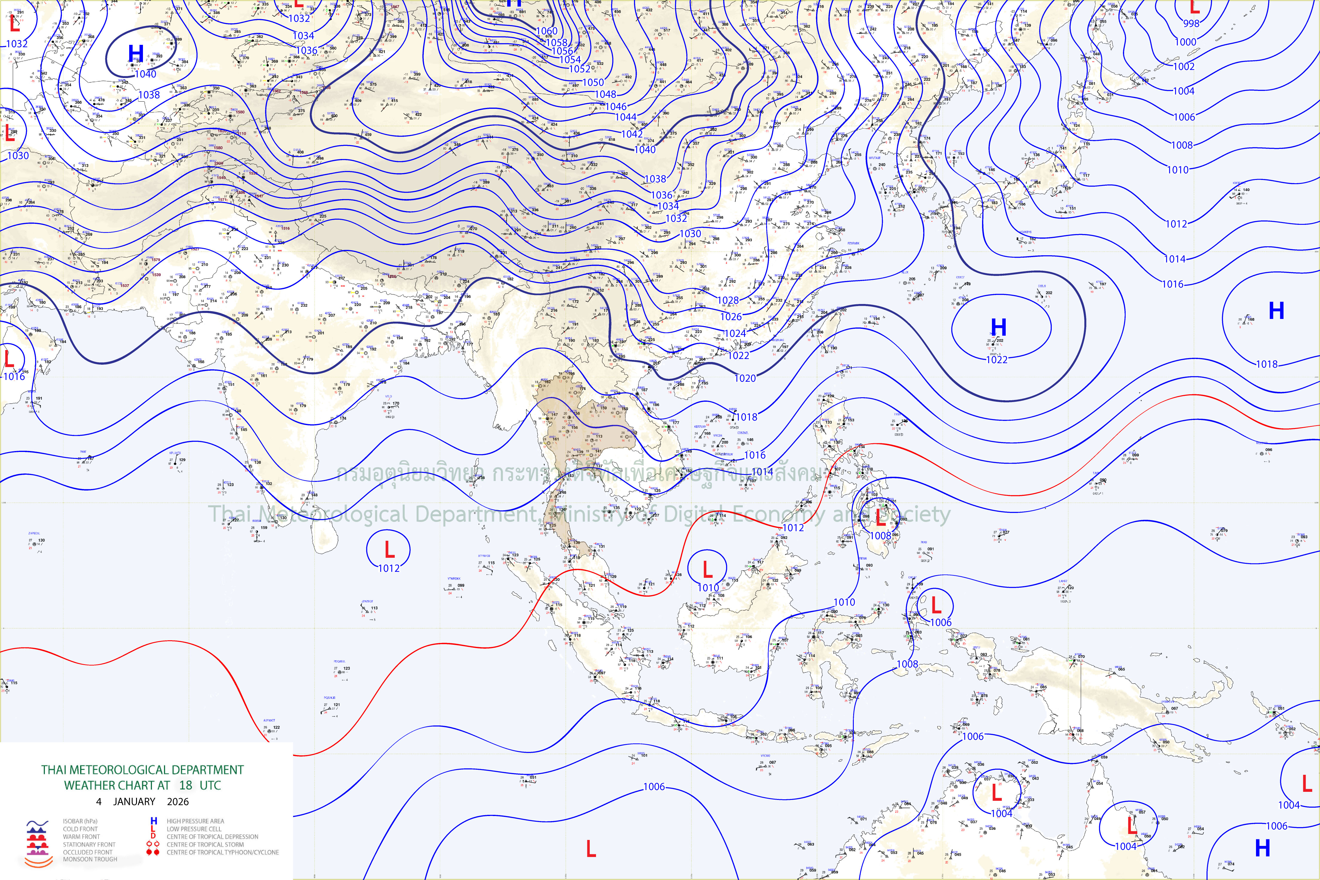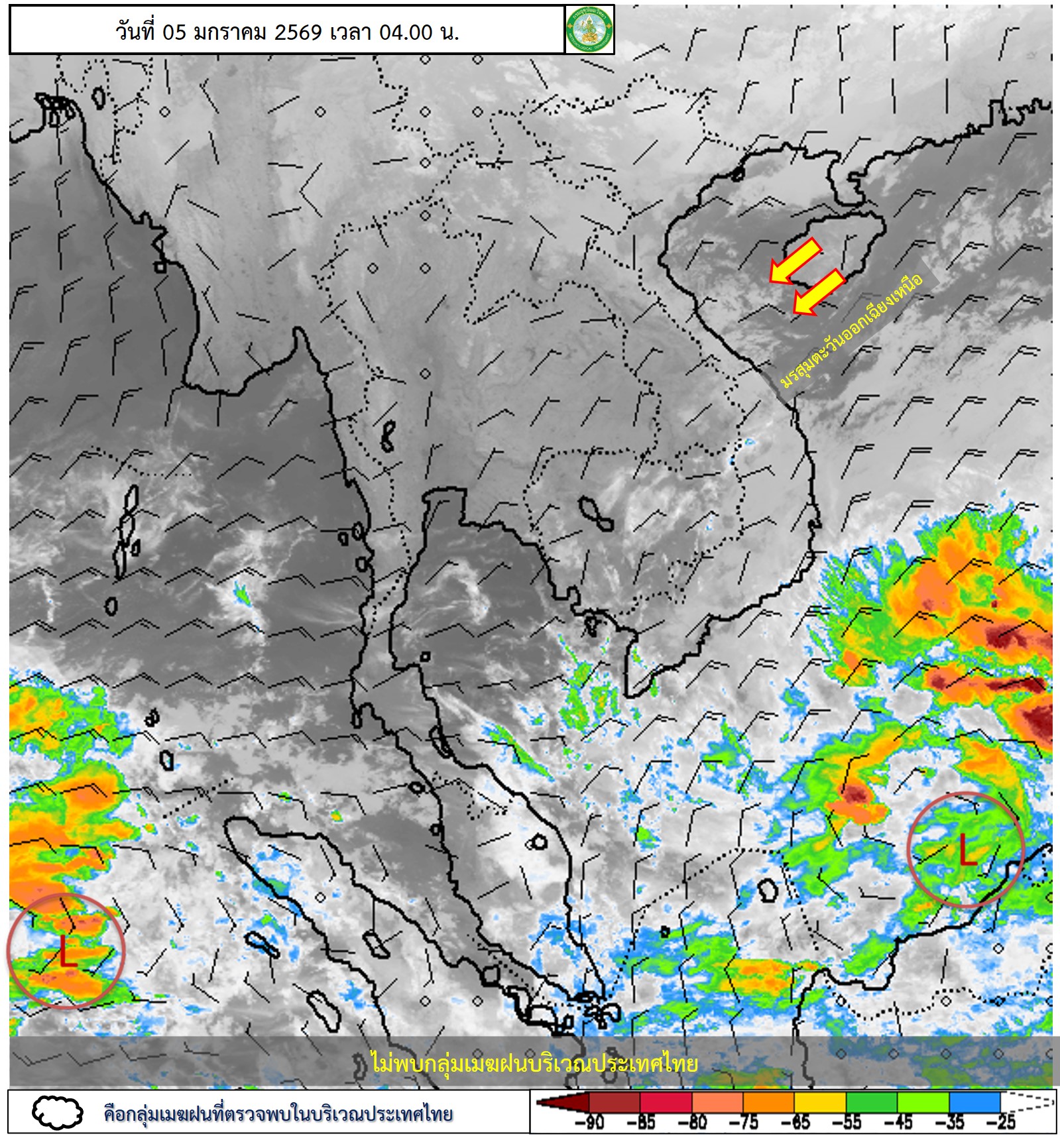 อนึ่ง ในช่วงวันที่ 6–10 ม.ค. 69 ประเทศไทยตอนบนยังคงมีอากาศเย็นถึงหนาวต่อเนื่อง โดยอุณหภูมิจะลดลง กับมีลมแรง เนื่องจากบริเวณความกดอากาศสูงหรือมวลอากาศเย็นกำลังค่อนข้างแรงอีกระลอกหนึ่งจากประเทศจีนจะแผ่เสริมลงมาปกคลุมประเทศไทยตอนบนและทะเลจีนใต้ สำหรับภาคใต้จะมีฝนเพิ่มขึ้น และมีฝนตกหนักบางแห่งบริเวณภาคใต้ตอนล่าง เนื่องจากมรสุมตะวันออกเฉียงเหนือกำลังปานกลางที่พัดปกคลุมอ่าวไทย ภาคใต้ และทะเลอันดามันจะมีกำลังแรงขึ้น โดยคลื่นลมบริเวณอ่าวไทยและทะเลอันดามันจะมีกำลังแรงขึ้น โดยอ่าวไทยตอนล่างมีคลื่นสูง 2-3 เมตร บริเวณที่มีฝนฟ้าคะนองคลื่นสูงมากกว่า 3 เมตร ส่วนอ่าวไทยตอนบนมีคลื่นสูงประมาณ 2 เมตร บริเวณที่มีฝนฟ้าคะนองคลื่นสูงมากกว่า 2 เมตร ชาวเรือบริเวณอ่าวไทยและทะเลอันดามันควรเดินเรือด้วยความระมัดระวัง และหลีกเลี่ยงการเดินเรือในบริเวณที่มีฝนฟ้าคะนอง สำหรับเรือเล็กบริเวณอ่าวไทยตอนล่างควรงดออกจากฝั่งในช่วงวันที่ 6–9 ม.ค. 69 ไว้ด้วย