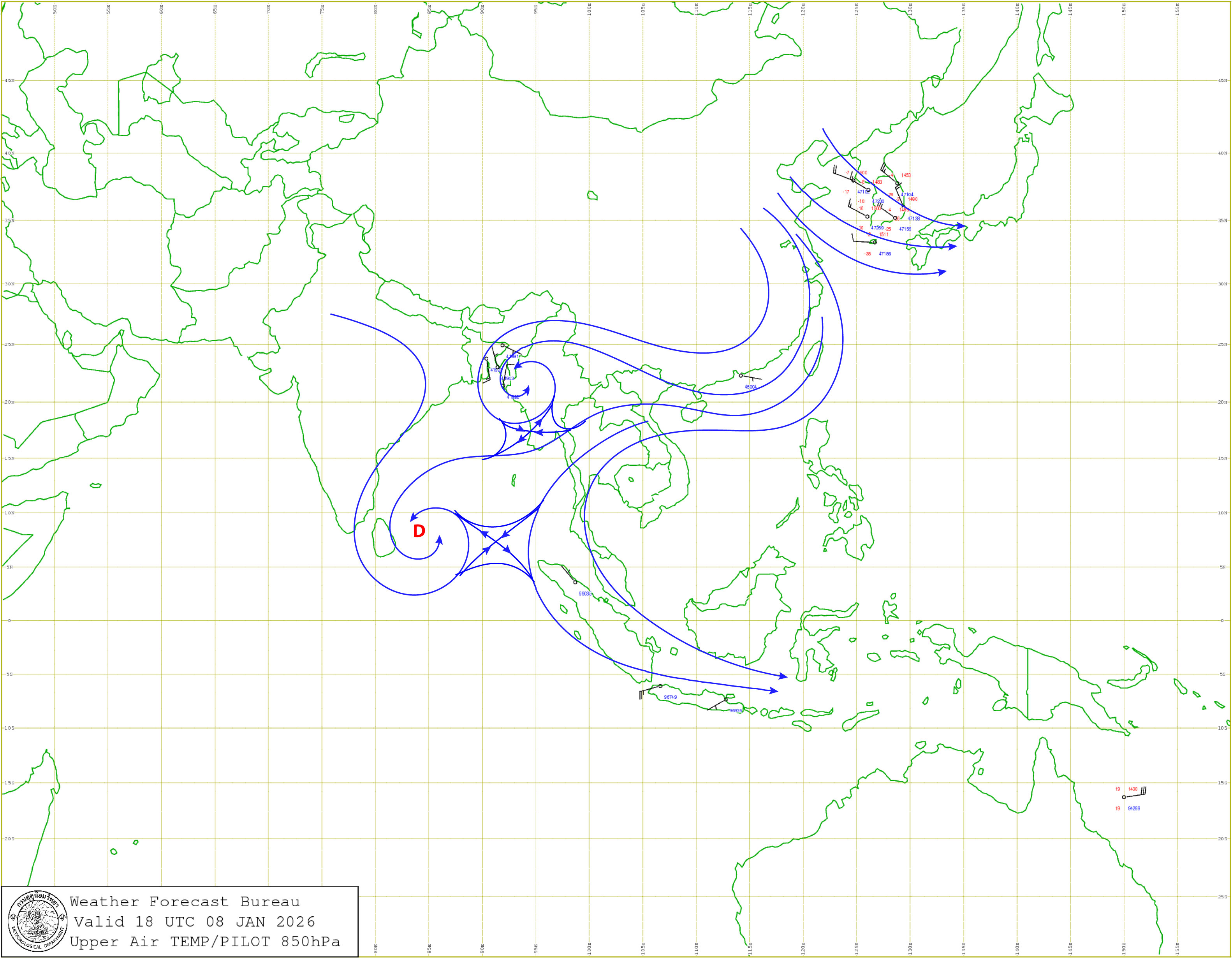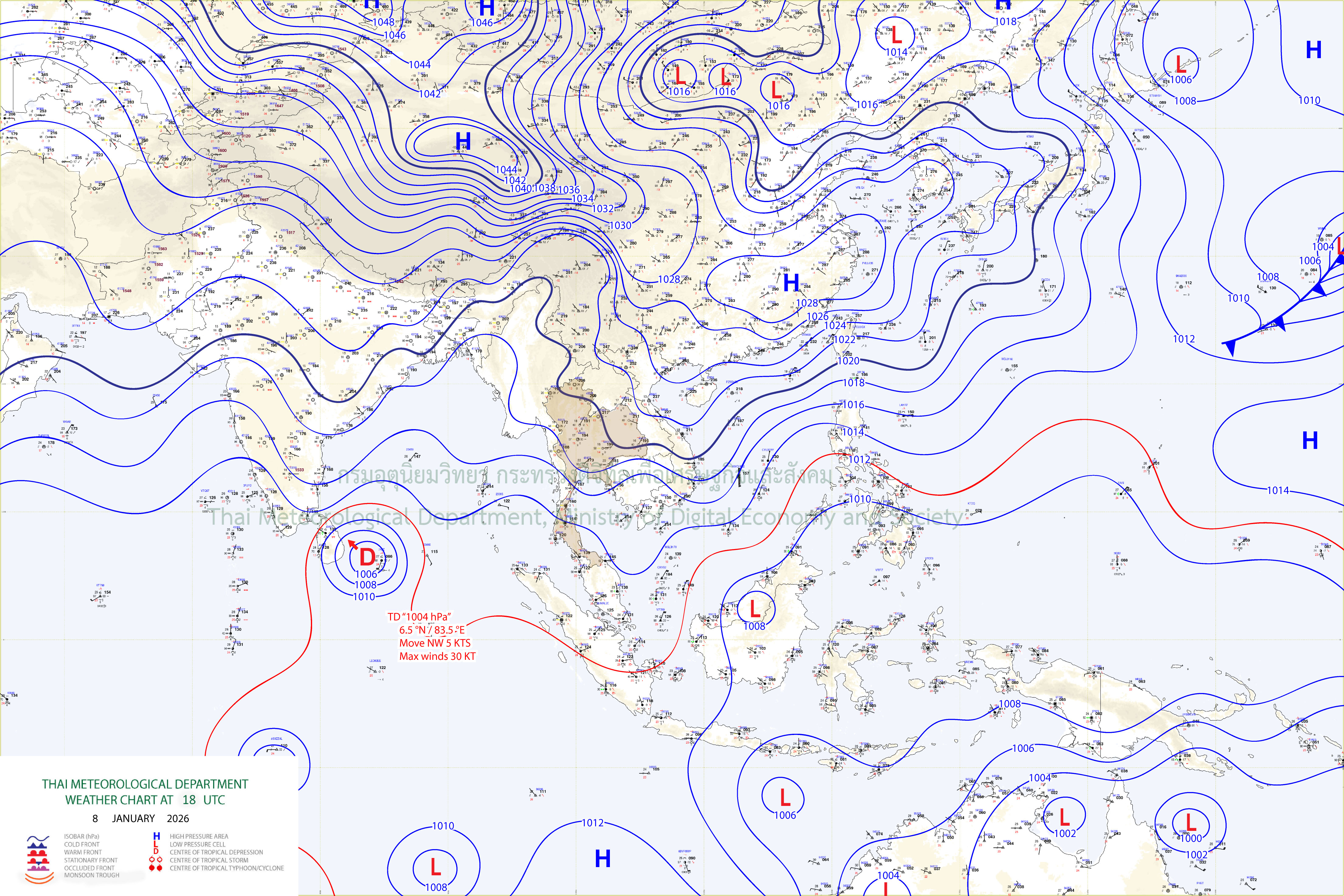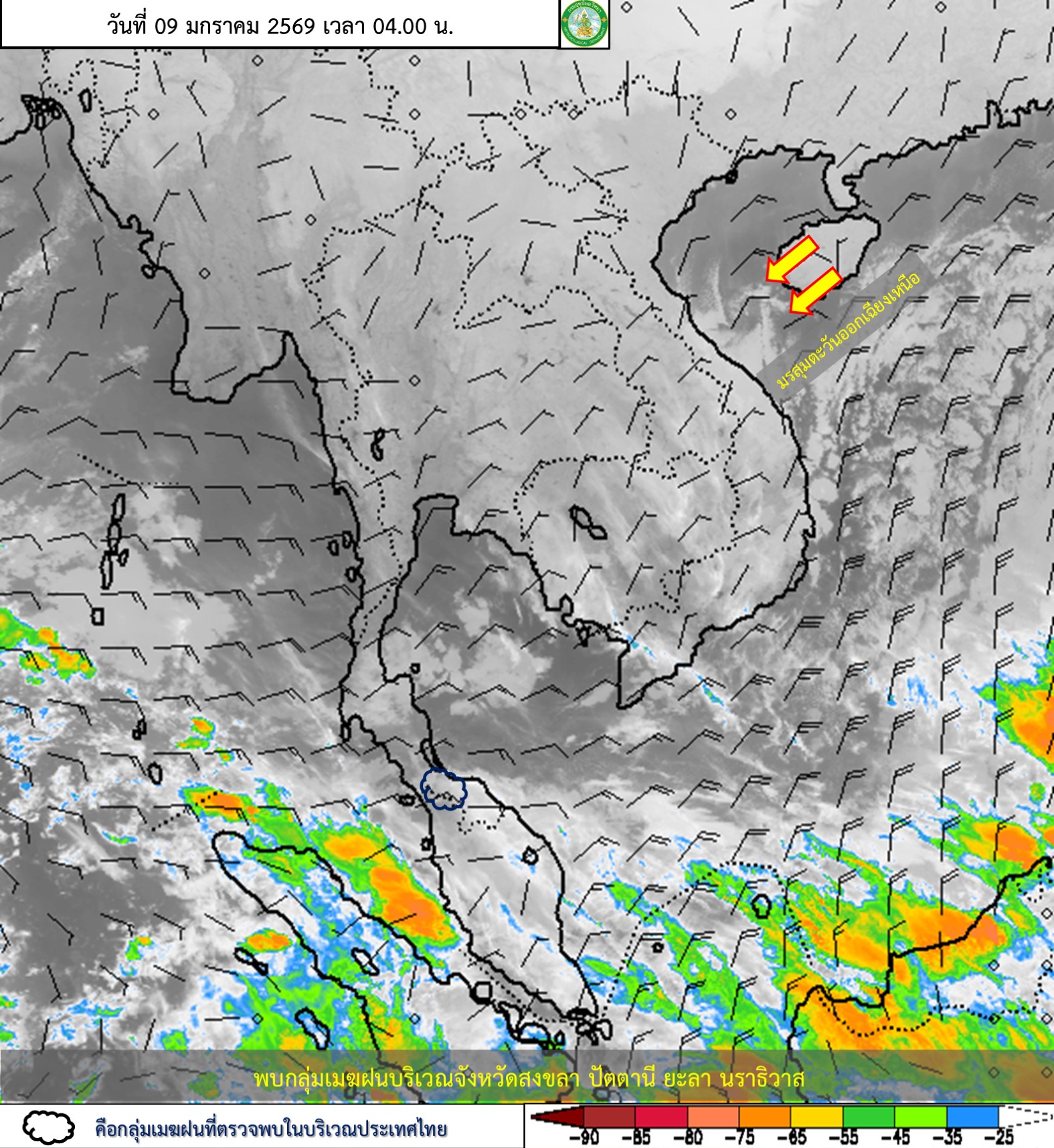 ลักษณะอากาศทั่วไป : พยากรณ์อากาศ 24 ชั่วโมงข้างหน้า ประเทศไทยตอนบนมีอากาศหนาวเย็น กับมีลมแรง เนื่องจากบริเวณความกดอากาศสูงหรือมวลอากาศเย็นกำลังแรงจากประเทศจีนปกคลุมประเทศไทยตอนบน ขอให้ประชาชนดูแลรักษาสุขภาพเนื่องจากสภาพอากาศที่หนาวเย็นลง รวมทั้งให้ระวังอันตรายจากอัคคีภัยเนื่องจากสภาพอากาศแห้งและลมแรง สำหรับภาคใต้มีฝนลดลง แต่ยังคงมีฝนฟ้าคะนองบริเวณภาคใต้ตอนล่าง เนื่องจากมรสุมตะวันออกเฉียงเหนือกำลังค่อนข้างแรงพัดปกคลุมอ่าวไทย และภาคใต้ ส่วนคลื่นลมบริเวณอ่าวไทยมีกำลังค่อนข้างแรง โดยมีคลื่นสูง 2-3 เมตร บริเวณที่มีฝนฟ้าคะนองคลื่นสูงมากกว่า 3 เมตร ทะเลอันดามันมีคลื่นสูง 1-2 เมตร ห่างฝั่งและบริเวณที่มีฝนฟ้าคะนองคลื่นสูงมากกว่า 2 เมตร ขอให้ชาวเรือในบริเวณดังกล่าวเดินเรือด้วยความระมัดระวัง และเรือเล็กบริเวณอ่าวไทยควรงดออกจากฝั่ง ส่วนประชาชนบริเวณชายฝั่งภาคใต้ฝั่งตะวันออกระมัดระวังอันตรายจากคลื่นที่ซัดเข้าหาฝั่งไว้ด้วย