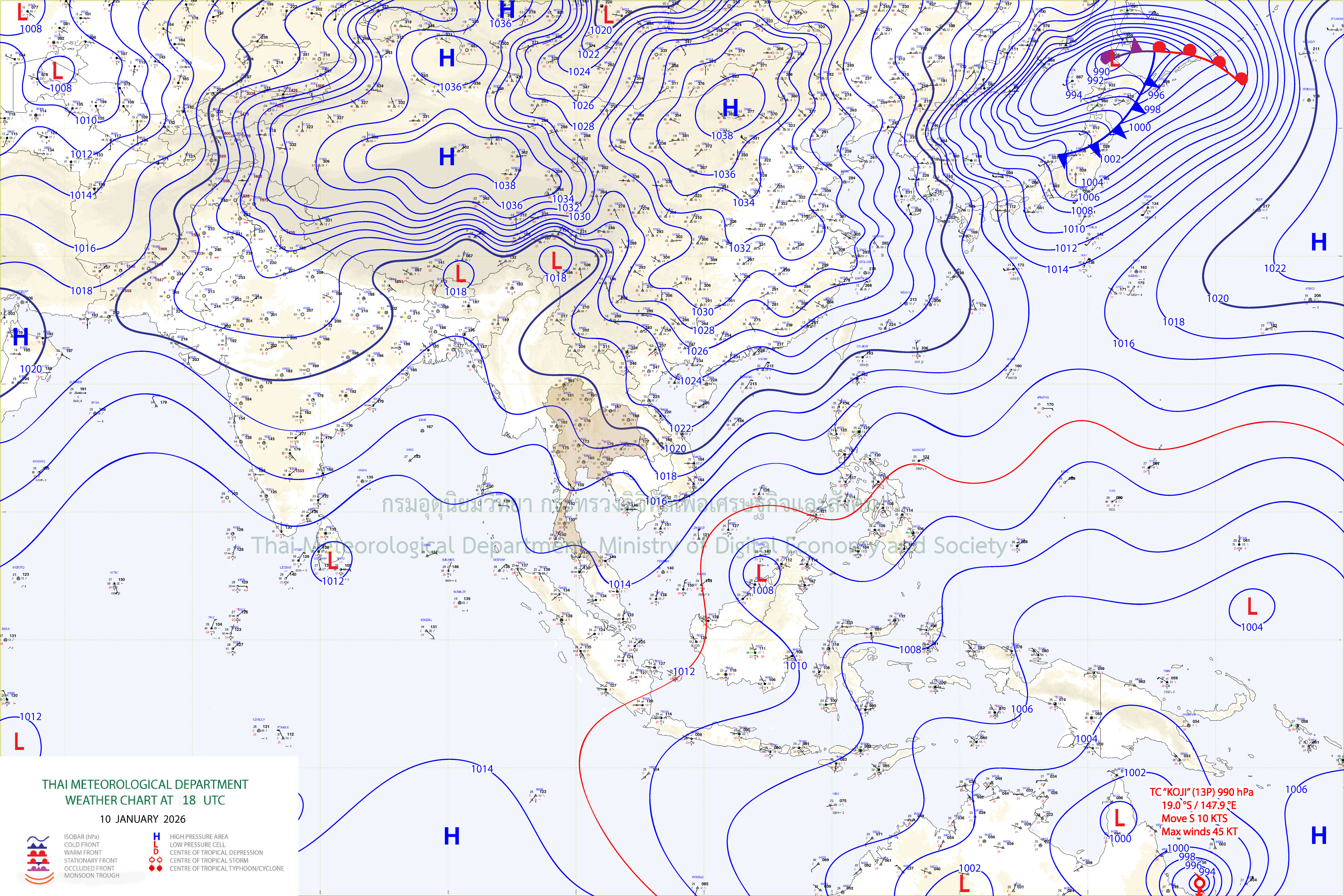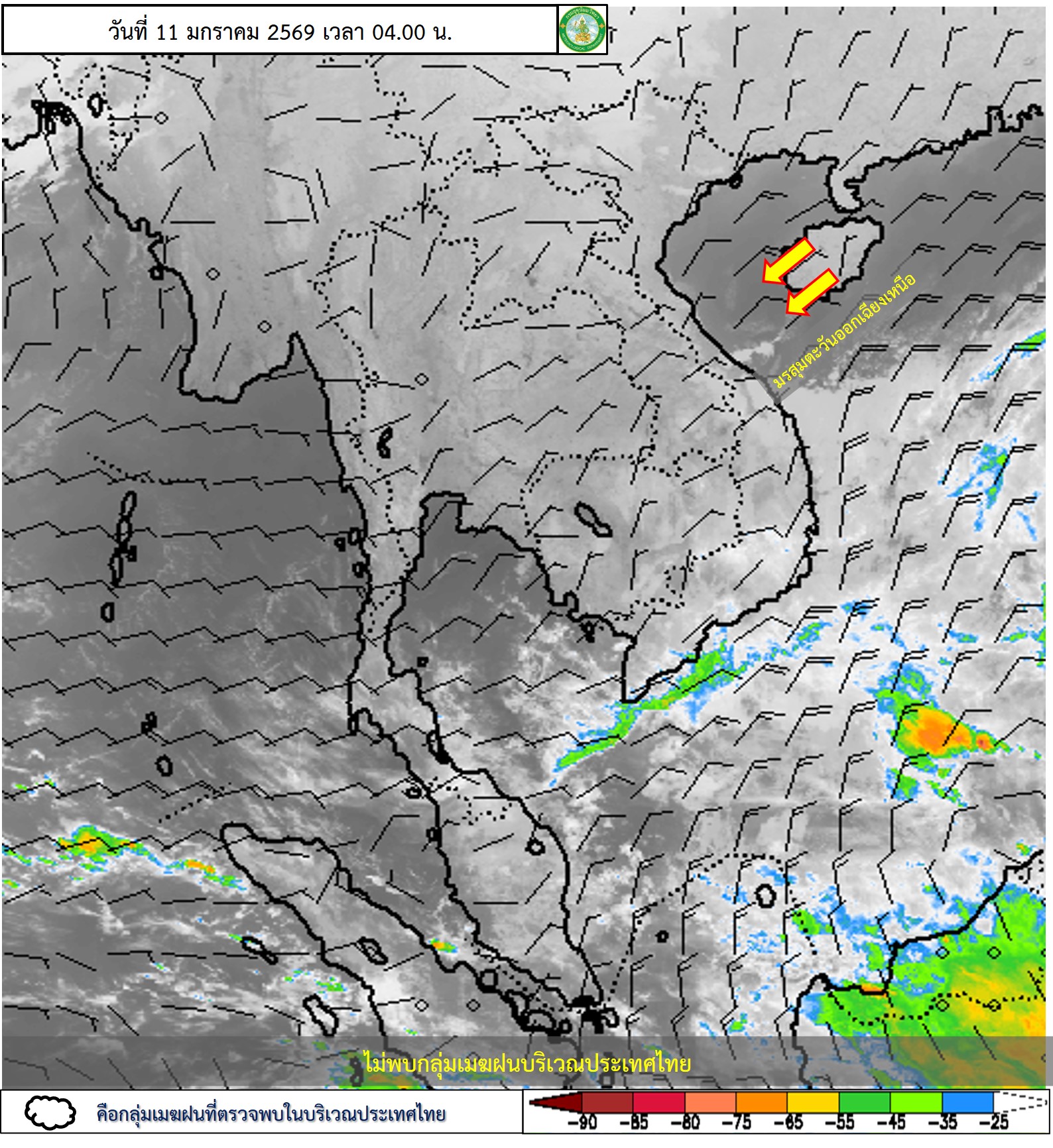 ลักษณะอากาศทั่วไป : พยากรณ์อากาศ 24 ชั่วโมงข้างหน้า ประเทศไทยยังคงมีอากาศหนาวเย็นต่อเนื่อง โดยภาคเหนือ และภาคตะวันออกเฉียงเหนือมีอากาศหนาว ส่วนภาคกลาง ภาคตะวันออก และภาคใต้ตอนบนมีอากาศเย็นถึงหนาว เนื่องจากบริเวณความกดอากาศสูงหรือมวลอากาศเย็นกำลังค่อนข้างแรงปกคลุมประเทศไทยตอนบน และภาคใต้ตอนบน ขอให้ประชาชนดูแลรักษาสุขภาพเนื่องจากสภาพอากาศที่หนาวเย็น รวมทั้งระวังอันตรายจากอัคคีภัยเนื่องจากสภาพอากาศแห้ง สำหรับภาคใต้มีฝนน้อย แต่ยังคงมีฝนเล็กน้อยบางแห่งบริเวณภาคใต้ตอนล่าง (ฝั่งตะวันออก) เนื่องจากมรสุมตะวันออกเฉียงเหนือกำลังปานกลางพัดปกคลุมอ่าวไทย ภาคใต้ และทะเลอันดามัน ส่วนคลื่นลมบริเวณอ่าวไทยและทะเลอันดามันมีกำลังปานกลาง โดยอ่าวไทยตอนล่างมีคลื่นสูงประมาณ 2 เมตร ส่วนอ่าวไทยตอนบนและห่างฝั่งทะเลอันดามันคลื่นสูง 1-2 เมตร ขอให้ชาวเรือเดินเรือด้วยความระมัดระวังไว้ด้วย