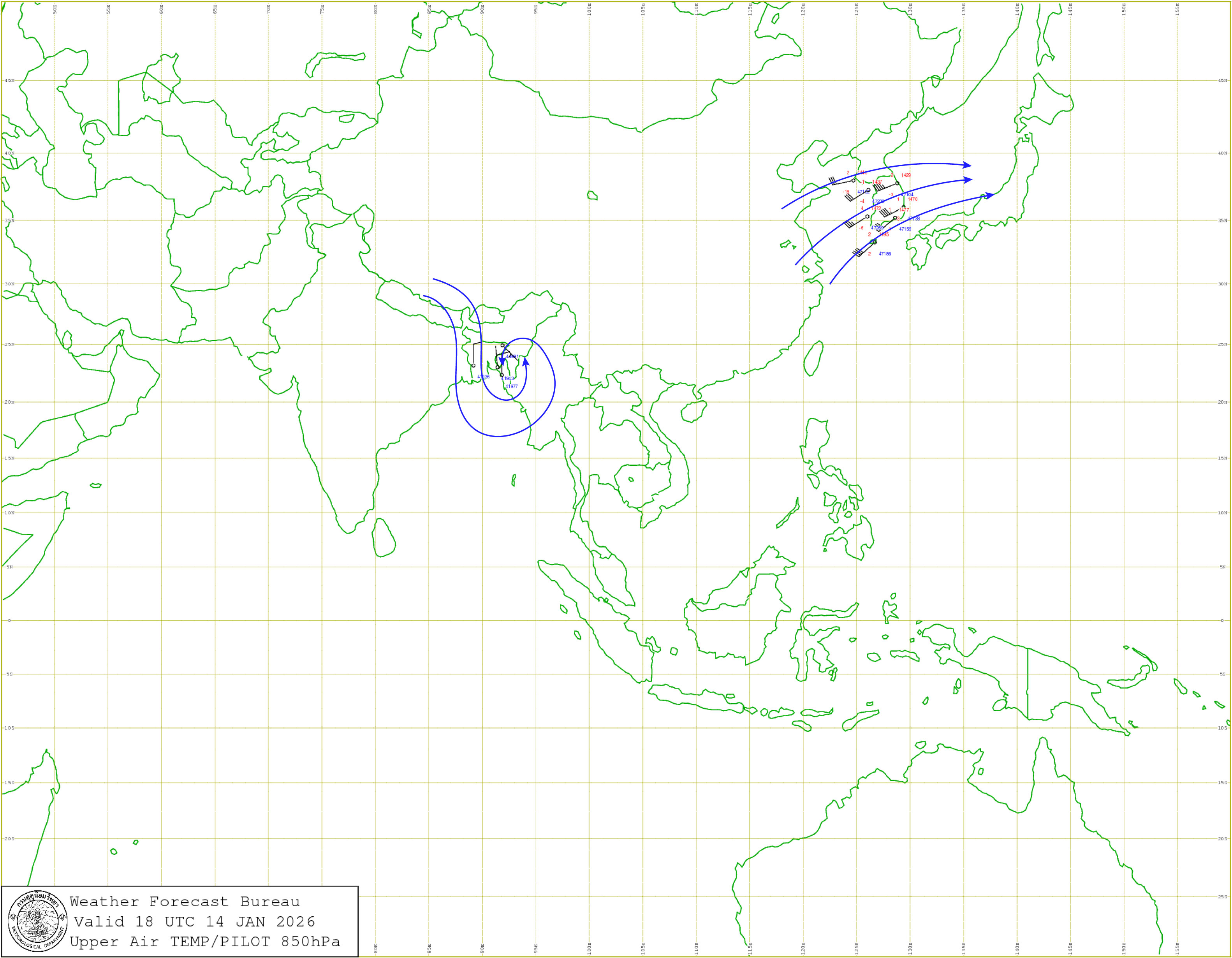 กรุงเทพมหานครและปริมณฑล : อากาศเย็นกับมีหมอกในตอนเช้า อุณหภูมิจะสูงขึ้น 1-3 องศาเซลเซียส อุณหภูมิต่ำสุด 21-23 องศาเซลเซียส อุณหภูมิสูงสุด 32-34 องศาเซลเซียส ลมตะวันออกเฉียงใต้ ความเร็ว 10-15 กม./ชม.