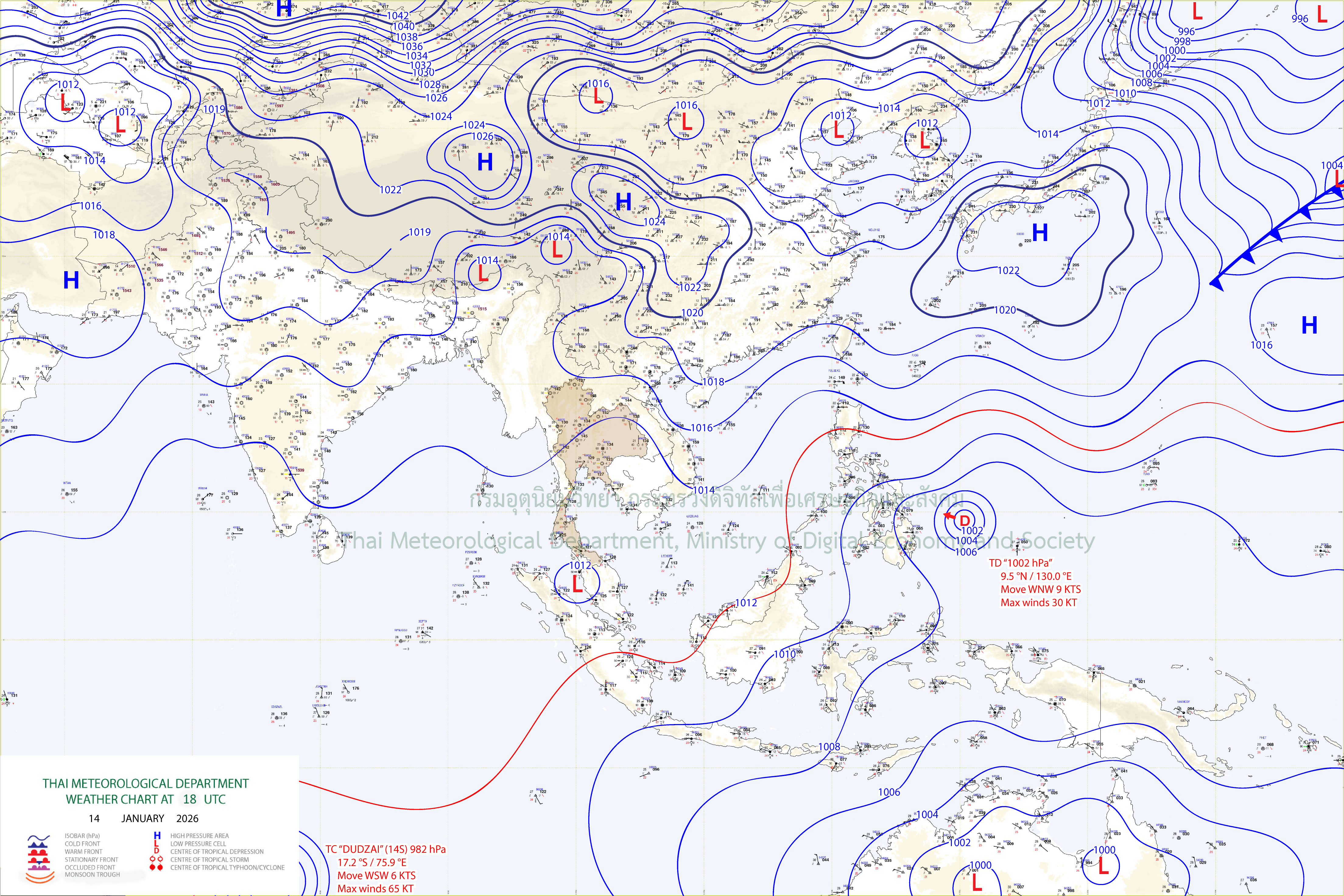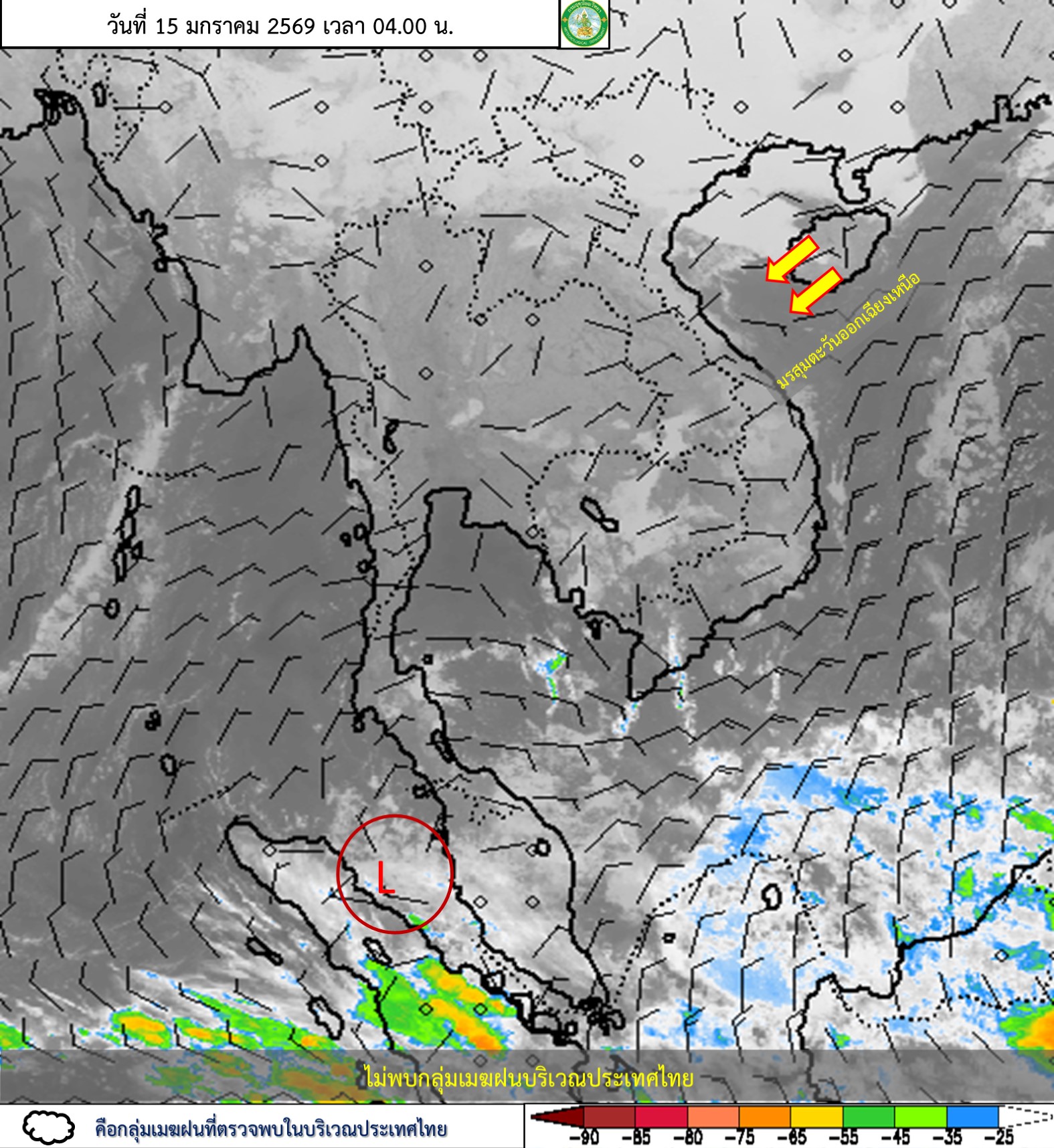 ลักษณะอากาศทั่วไป : พยากรณ์อากาศ 24 ชั่วโมงข้างหน้า ประเทศไทยมีอุณหภูมิสูงขึ้น 1-3 องศาเซลเซียส กับมีหมอกในตอนเช้า และมีหมอกหนาบางพื้นที่ แต่ยังคงมีอากาศเย็นถึงหนาวในภาคเหนือ และภาคตะวันออกเฉียงเหนือ เนื่องจากบริเวณความกดอากาศสูงหรือมวลอากาศเย็นที่ปกคลุมประเทศไทยมีกำลังอ่อนลง ขอให้ประชาชนดูแลรักษาสุขภาพเนื่องจากสภาพอากาศที่เปลี่ยนแปลง ระมัดระวังการเดินทางผ่านบริเวณที่มีหมอกและระวังอันตรายจากอัคคีภัยเนื่องจากสภาพอากาศแห้งไว้ด้วย สำหรับภาคใต้มีฝนน้อย ส่วนมากทางตอนล่าง เนื่องจากมรสุมตะวันออกเฉียงเหนือกำลังปานกลางพัดปกคลุมอ่าวไทย ภาคใต้ และทะเลอันดามัน ส่วนบริเวณอ่าวไทยตอนล่าง มีคลื่นสูง 1-2 เมตร ขอให้ชาวเรือเดินเรือด้วยความระมัดระวังไว้ด้วย