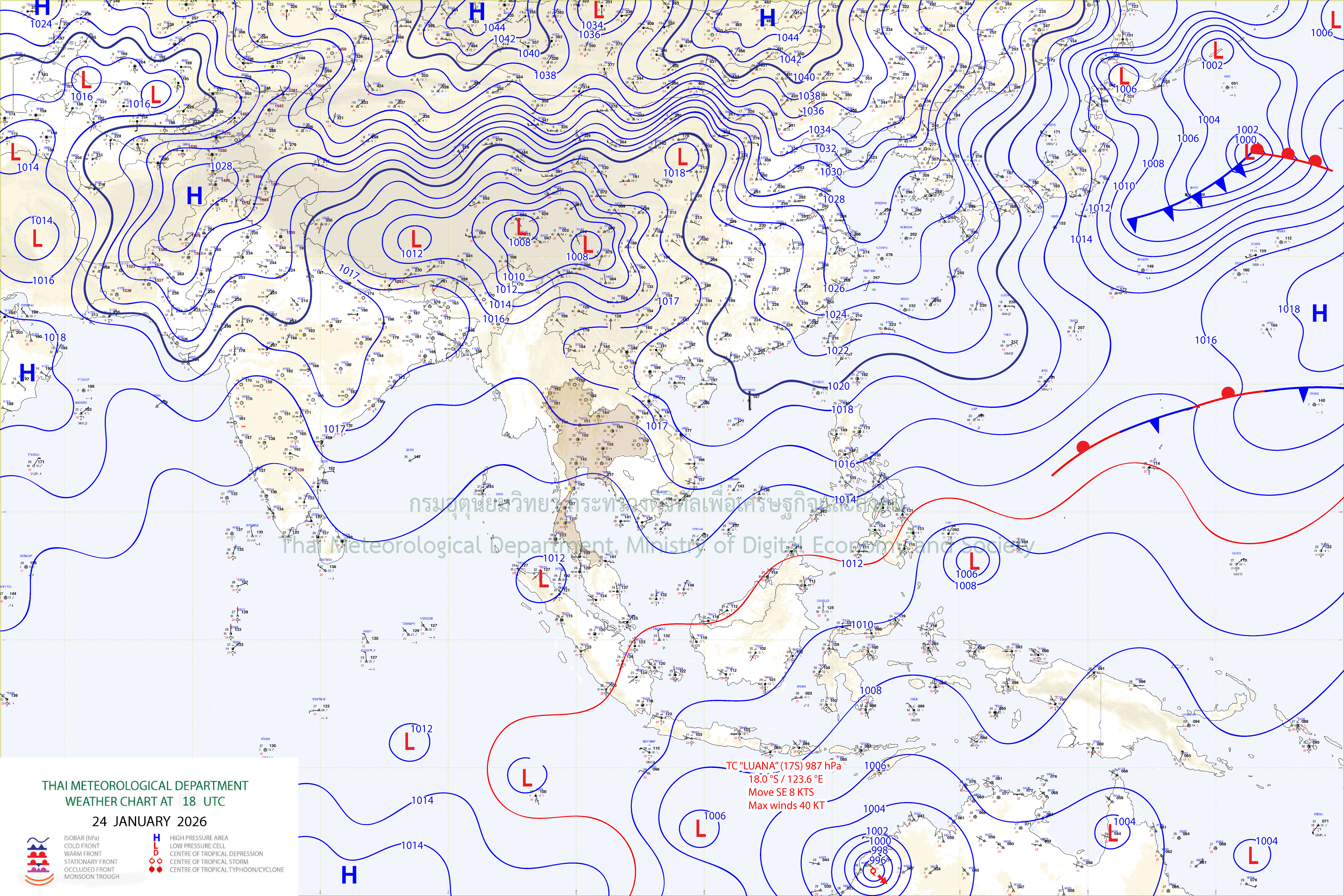 ลักษณะอากาศทั่วไป : พยากรณ์อากาศ 24 ชั่วโมงข้างหน้า ภาคเหนือและภาคตะวันออกเฉียงเหนือยังคงมีอากาศเย็นถึงหนาว สำหรับภาคกลางรวมทั้งกรุงเทพมหานครและปริมณฑล ภาคตะวันออก และภาคใต้ตอนบน มีอากาศเย็นในตอนเช้า เนื่องจากบริเวณความกดอากาศสูงหรือมวลอากาศเย็นกำลังค่อนข้างแรงที่ปกคลุมประเทศไทยตอนบนเริ่มมีกำลังอ่อนลง ขอให้ประชาชนดูแลรักษาสุขภาพเนื่องจากสภาพอากาศที่เปลี่ยนแปลงและอากาศที่หนาวเย็นลงไว้ด้วย สำหรับภาคใต้มีฝนฟ้าคะนองบางแห่ง เนื่องจากมรสุมตะวันออกเฉียงเหนือกำลังปานกลางพัดปกคลุมอ่าวไทย ภาคใต้ และทะเลอันดามัน ส่วนคลื่นลมบริเวณอ่าวไทยและทะเลอันดามันมีกำลังปานกลาง โดยอ่าวไทยตอนล่างมีคลื่นสูงประมาณ 2 เมตร อ่าวไทยตอนบนและห่างฝั่งทะเลอันดามันมีคลื่นสูง 1-2 เมตร บริเวณที่มีฝนฟ้าคะนองคลื่นสูงมากกว่า 2 เมตร ขอให้ชาวเรือเดินเรือด้วยความระมัดระวังและหลีกเลี่ยงการเดินเรือในบริเวณที่มีฝนฟ้าคะนองไว้ด้วย