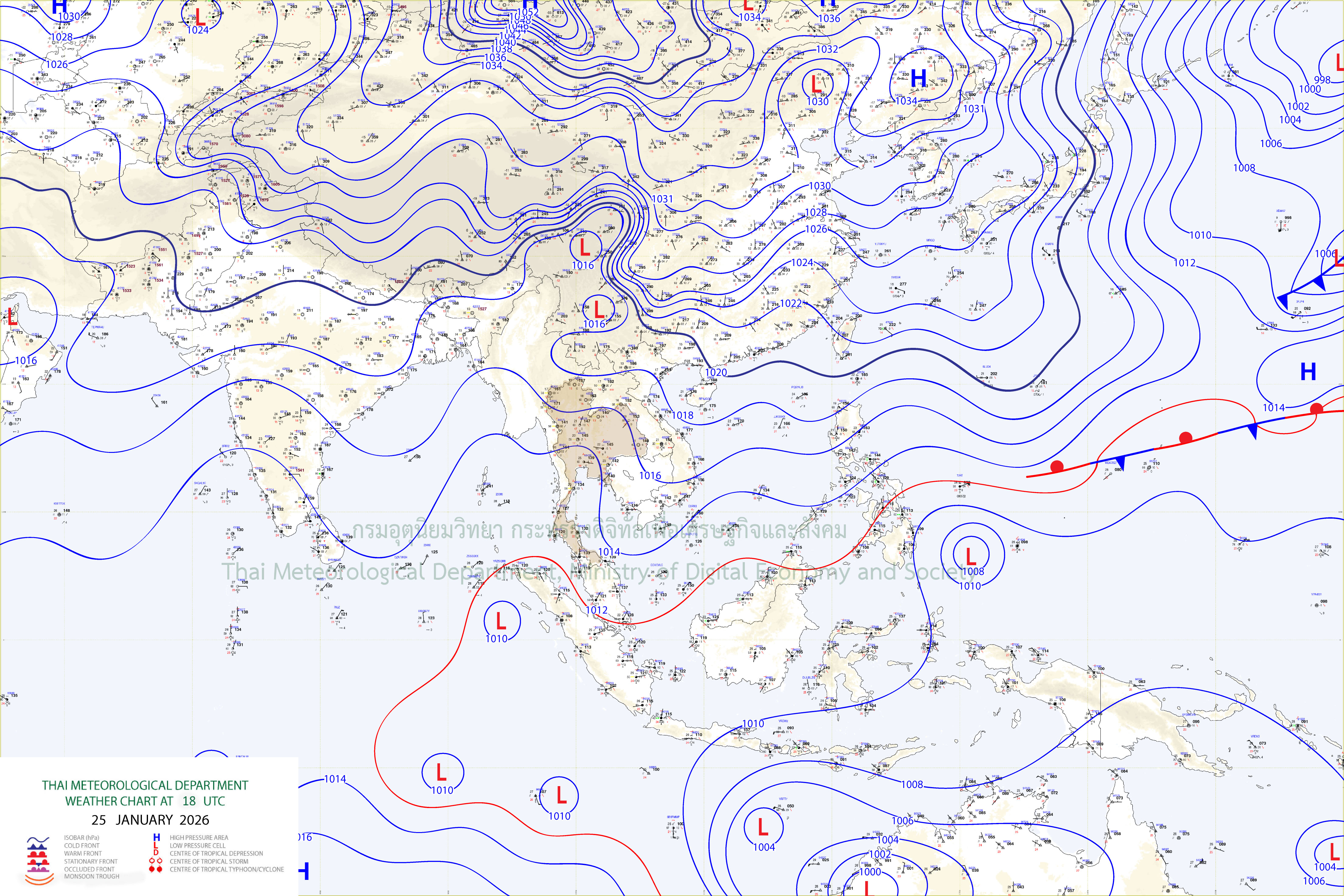 ลักษณะอากาศทั่วไป : พยากรณ์อากาศ 24 ชั่วโมงข้างหน้า ประเทศไทยตอนบนและภาคใต้ตอนบนมีอุณหภูมิสูงขึ้น 1-2 องศาเซลเซียส กับมีหมอกบางในตอนเช้า แต่ยังคงมีอากาศเย็นถึงหนาวในภาคเหนือ และภาคตะวันออกเฉียงเหนือ ส่วนภาคกลาง รวมทั้งกรุงเทพมหานครและปริมณฑล ภาคตะวันออก และภาคใต้ตอนบน มีอากาศเย็นในตอนเช้า เนื่องจากบริเวณความกดอากาศสูงหรือมวลอากาศเย็นกำลังค่อนข้างแรงที่ปกคลุมประเทศไทยตอนบนและภาคใต้ตอนบนมีกำลังอ่อนลง ขอให้ประชาชนดูแลรักษาสุขภาพเนื่องจากสภาพอากาศที่ยังคงหนาวเย็น รวมทั้งเพิ่มความระมัดระวังในการสัญจรผ่านบริเวณที่มีหมอกไว้ด้วย