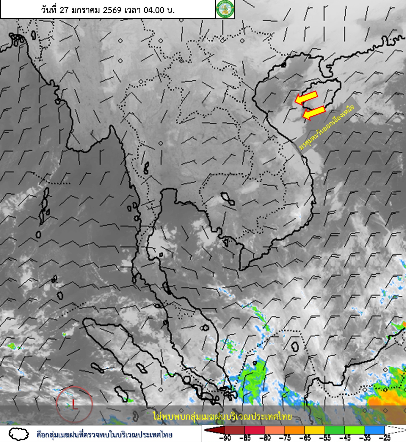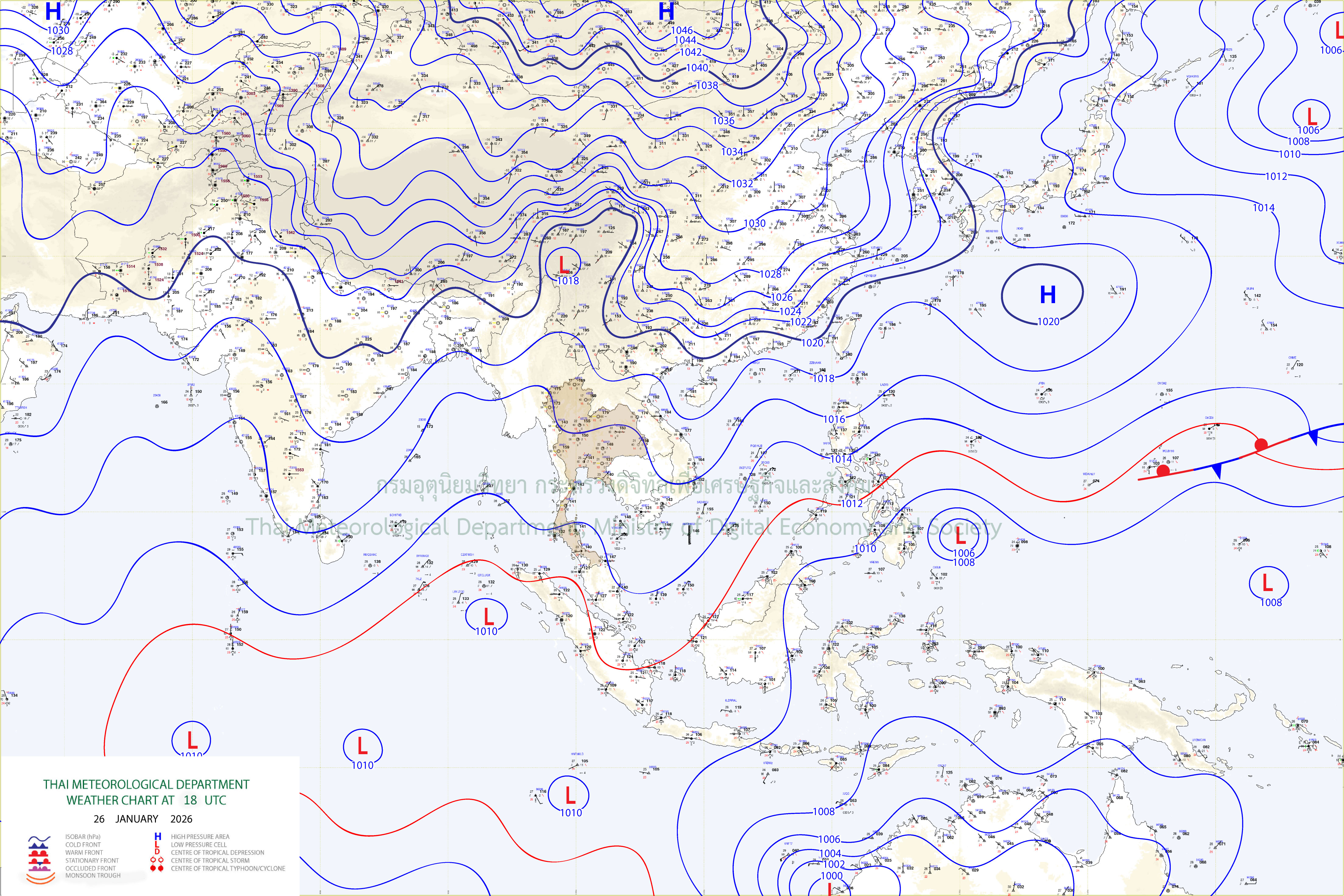 ลักษณะอากาศทั่วไป : พยากรณ์อากาศ 24 ชั่วโมงข้างหน้า ภาคเหนือ และภาคตะวันออกเฉียงเหนือยังคงมีอากาศเย็นถึงหนาว ส่วนภาคกลาง รวมทั้งกรุงเทพมหานครและปริมณฑล ภาคตะวันออก และภาคใต้ มีอากาศเย็นกับมีหมอกบางในตอนเช้า เนื่องจากบริเวณความกดอากาศสูงหรือมวลอากาศเย็นที่ปกคลุม ประเทศไทยตอนบน และภาคใต้ตอนบนมีกำลังปานกลาง ขอให้ประชาชนดูแลรักษาสุขภาพเนื่องจากสภาพอากาศที่ยังคงหนาวเย็น รวมทั้งเพิ่มความระมัดระวังในการสัญจรผ่านบริเวณที่มีหมอกไว้ด้วย สำหรับภาคใต้ตอนล่างมีฝนน้อย แต่ยังคงมีฝนฟ้าคะนองบางแห่ง เนื่องจากมรสุมตะวันออกเฉียงเหนือกำลังปานกลางพัดปกคลุมอ่าวไทย ภาคใต้ และทะเลอันดามัน ส่วนคลื่นลมบริเวณอ่าวไทยมีกำลังปานกลาง โดยอ่าวไทยตอนล่างมีคลื่นสูงประมาณ 2 เมตร อ่าวไทยตอนบนมีคลื่นสูง 1-2 เมตร บริเวณที่มีฝนฟ้าคะนองคลื่นสูงมากกว่า 2 เมตร ขอให้ชาวเรือบริเวณอ่าวไทยและทะเลอันดามันเดินเรือด้วยความระมัดระวังและหลีกเลี่ยงการเดินเรือในบริเวณที่มีฝนฟ้าคะนองไว้ด้วย