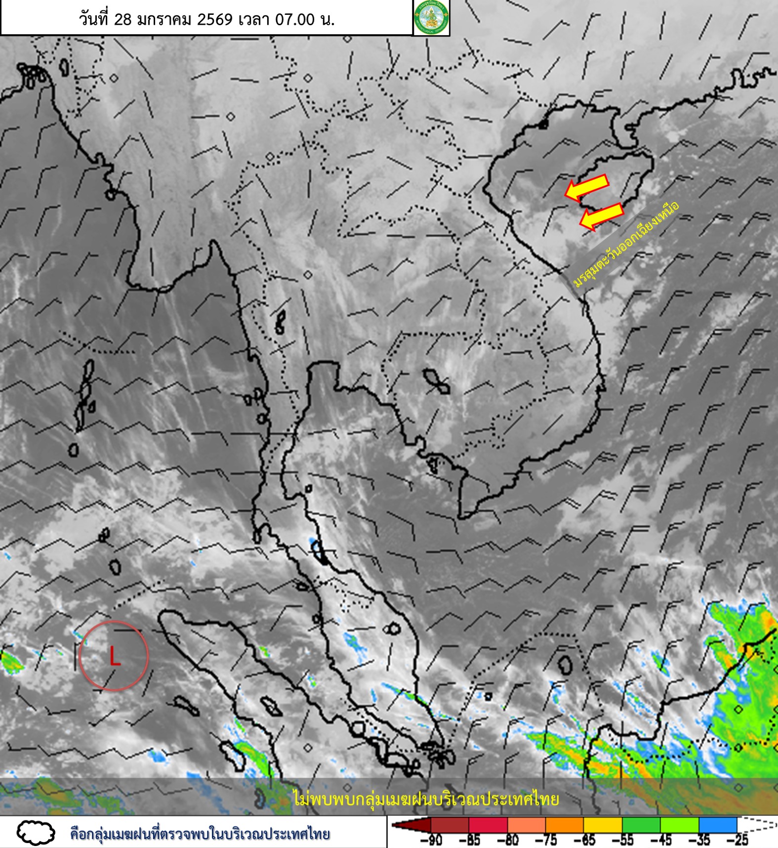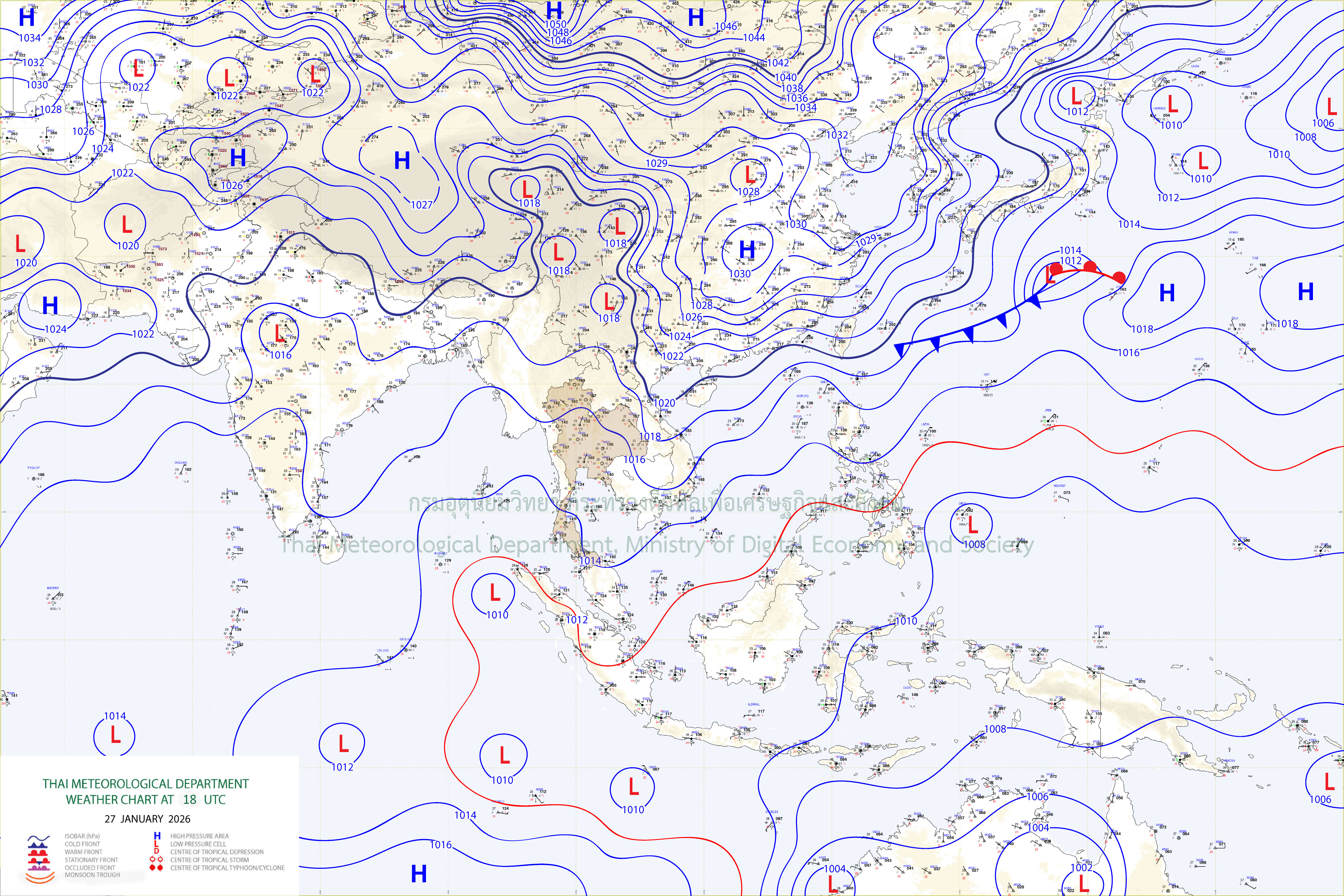 ลักษณะอากาศทั่วไป : พยากรณ์อากาศ 24 ชั่วโมงข้างหน้า ระเทศไทยมีอากาศเย็นกับมีหมอกในตอนเช้า โดยภาคเหนือและภาคตะวันออกเฉียงเหนือยังคงมีอากาศเย็นถึงหนาว เนื่องจากบริเวณความกดอากาศสูงหรือมวลอากาศเย็นกำลังปานกลางปกคลุมประเทศไทยตอนบนและภาคใต้ตอนบน ขอให้ประชาชนดูแลรักษาสุขภาพเนื่องจากสภาพอากาศที่เปลี่ยนแปลง รวมทั้งเพิ่มความระมัดระวังในการสัญจรผ่านบริเวณที่มีหมอกไว้ด้วย สำหรับภาคใต้มีฝนน้อย แต่ยังคงมีฝนฟ้าคะนองบางแห่ง เนื่องจากมรสุมตะวันออกเฉียงเหนือกำลังปานกลางที่พัดปกคลุมอ่าวไทย ภาคใต้ และทะเลอันดามันมีกำลังอ่อนลง ส่วนคลื่นลมบริเวณอ่าวไทยมีกำลังปานกลาง โดยอ่าวไทยตอนล่างมีคลื่นสูง 1-2 เมตร อ่าวไทยตอนบนคลื่นสูงประมาณ 1 เมตร บริเวณที่มีฝนฟ้าคะนองคลื่นสูงมากกว่า 2 เมตร ขอให้ชาวเรือบริเวณอ่าวไทยและทะเลอันดามันเดินเรือด้วยความระมัดระวังไว้ด้วย