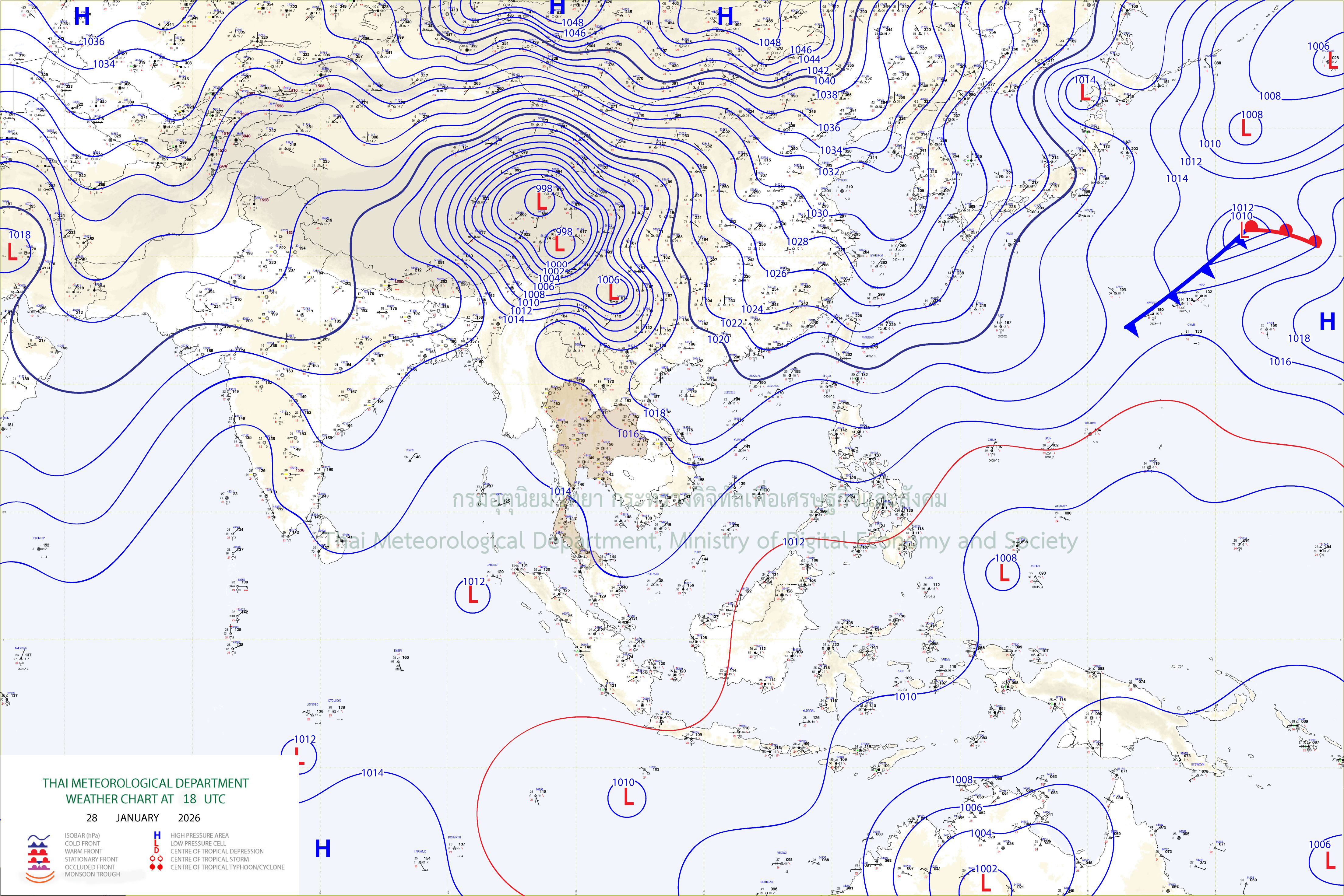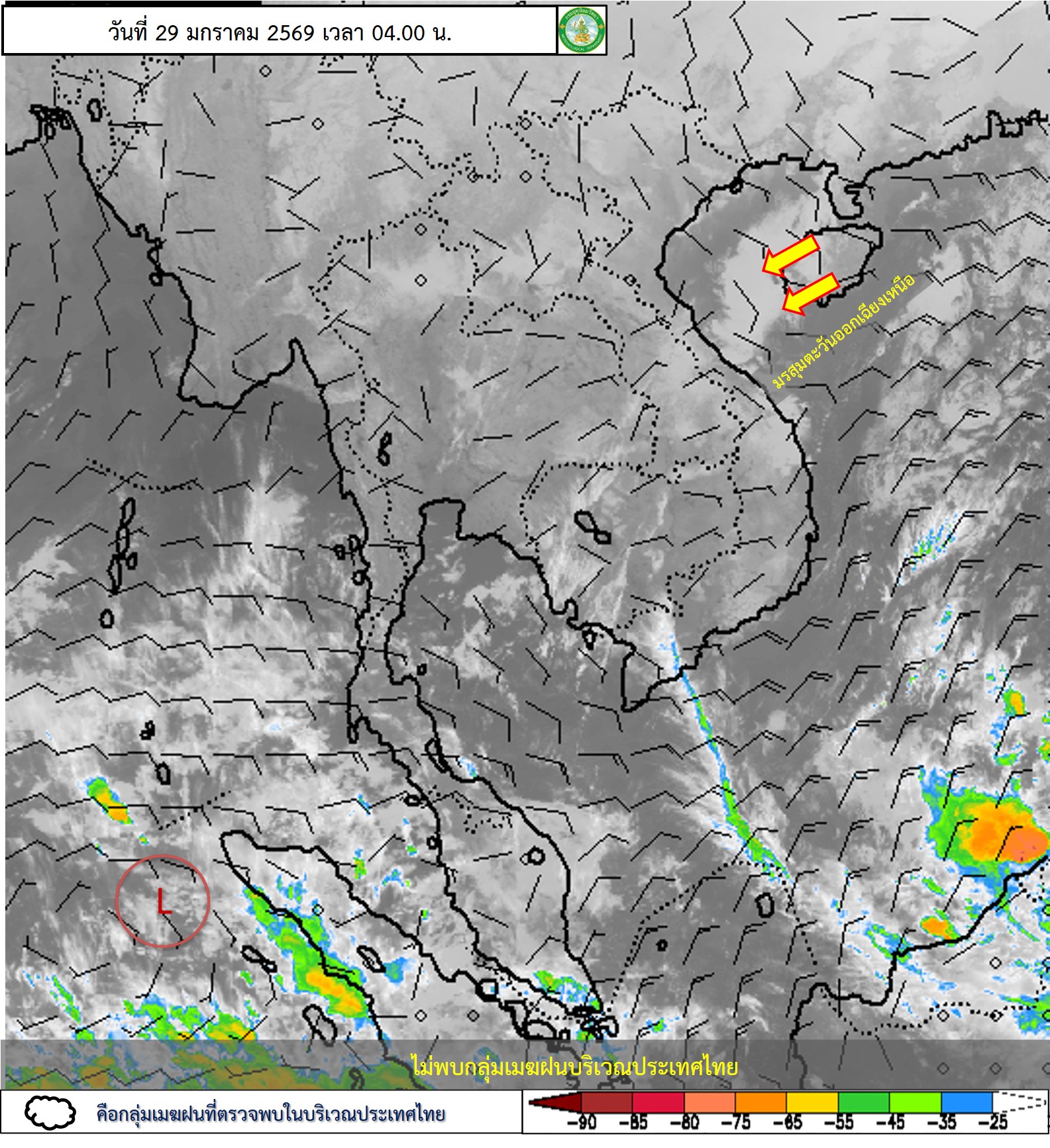 ลักษณะอากาศทั่วไป : พยากรณ์อากาศ 24 ชั่วโมงข้างหน้า ประเทศไทยมีอากาศเย็นกับมีหมอกบางในตอนเช้า โดยภาคเหนือและภาคตะวันออกเฉียงเหนือยังคงมีอากาศเย็นถึงหนาว เนื่องจากบริเวณความกดอากาศสูงหรือมวลอากาศเย็นกำลังปานกลางปกคลุมที่ประเทศไทยตอนบนมีกำลังอ่อนลง ขอให้ประชาชนดูแลรักษาสุขภาพเนื่องจากสภาพอากาศที่เปลี่ยนแปลง รวมทั้งเพิ่มความระมัดระวังในการสัญจรผ่านบริเวณที่มีหมอกไว้ด้วย สำหรับภาคใต้มีฝนน้อย เนื่องจากมรสุมตะวันออกเฉียงเหนือกำลังปานกลางพัดปกคลุมอ่าวไทย ภาคใต้ และทะเลอันดามัน ส่วนคลื่นลมบริเวณอ่าวไทยมีกำลังปานกลาง โดยอ่าวไทยตอนล่างมีคลื่นสูง 1-2 เมตร อ่าวไทยตอนบนคลื่นสูงประมาณ 1 เมตร ขอให้ชาวเรือบริเวณอ่าวไทยและทะเลอันดามันเดินเรือด้วยความระมัดระวังไว้ด้วย