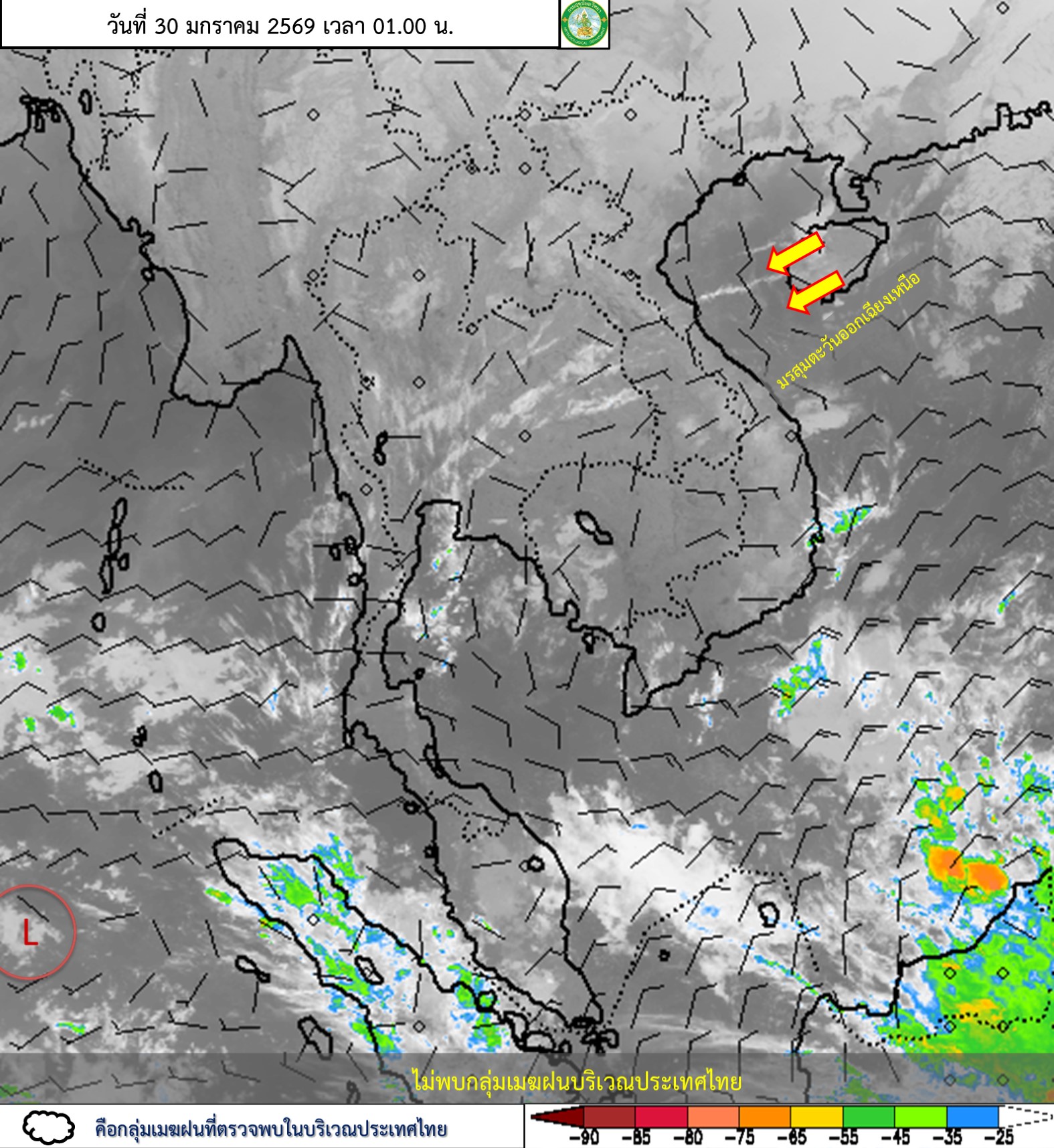 ลักษณะอากาศทั่วไป : พยากรณ์อากาศ 24 ชั่วโมงข้างหน้า ประเทศไทยตอนบนมีอุณหภูมิสูงขึ้น กับมีหมอกบางในตอนเช้า แต่ยังคงมีอากาศเย็นถึงหนาวในภาคเหนือและภาคตะวันออกเฉียงเหนือ ส่วนภาคกลาง รวมทั้งกรุงเทพมหานครและปริมณฑล ภาคตะวันออก และภาคใต้มีอากาศเย็นในตอนเช้า โดยมีฝนเล็กน้อยบางแห่งในภาคตะวันออก เนื่องจากบริเวณความกดอากาศสูงหรือมวลอากาศเย็นกำลังปานกลางที่ปกคลุมประเทศไทยตอนบนมีกำลังอ่อนลง ในขณะที่มีลมตะวันออกพัดปกคลุมภาคตะวันออกขอให้ประชาชนดูแลรักษาสุขภาพเนื่องจากสภาพอากาศที่เปลี่ยนแปลง รวมทั้งเพิ่มความระมัดระวังในการสัญจรผ่านบริเวณที่มีหมอกไว้ด้วย