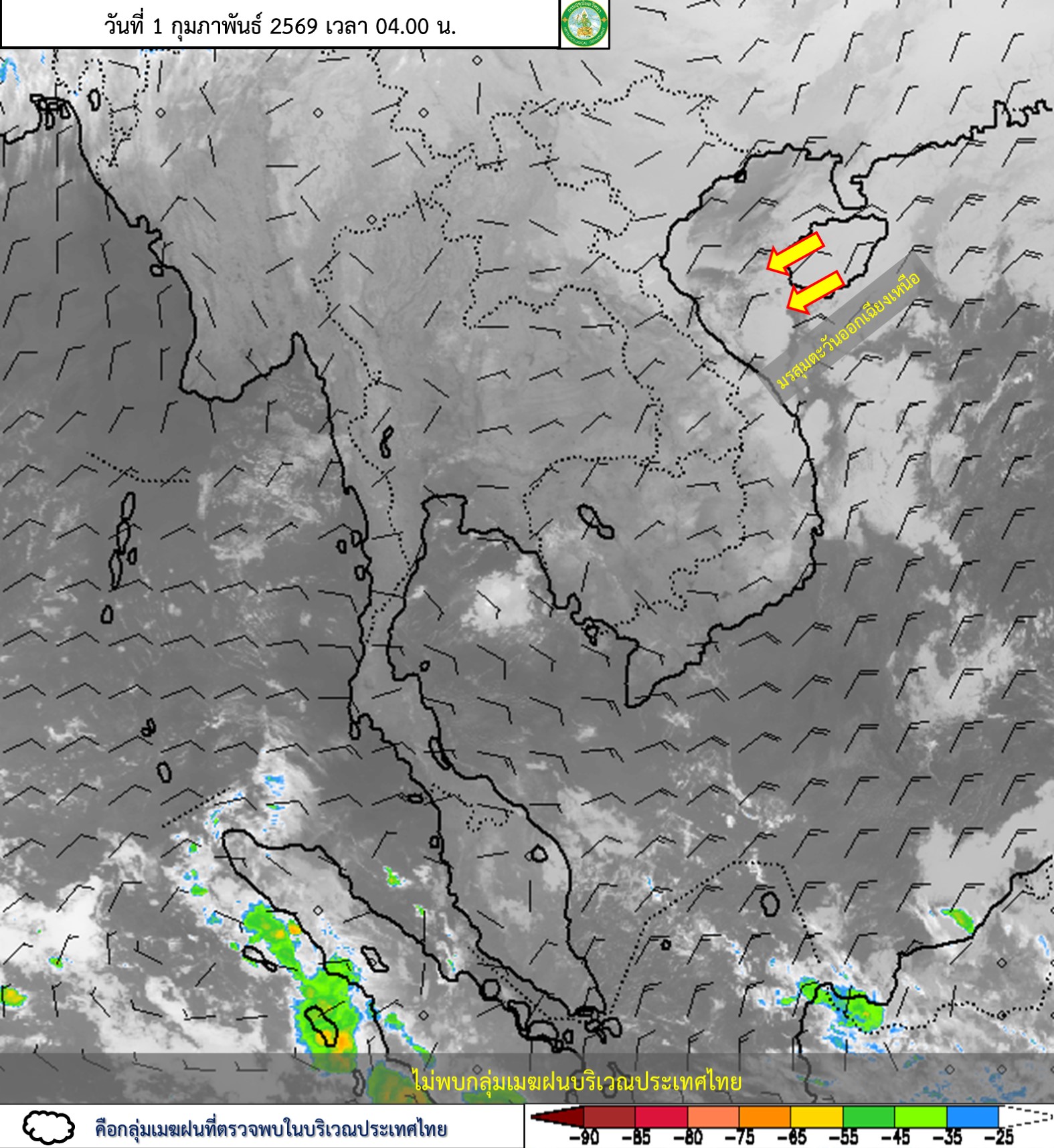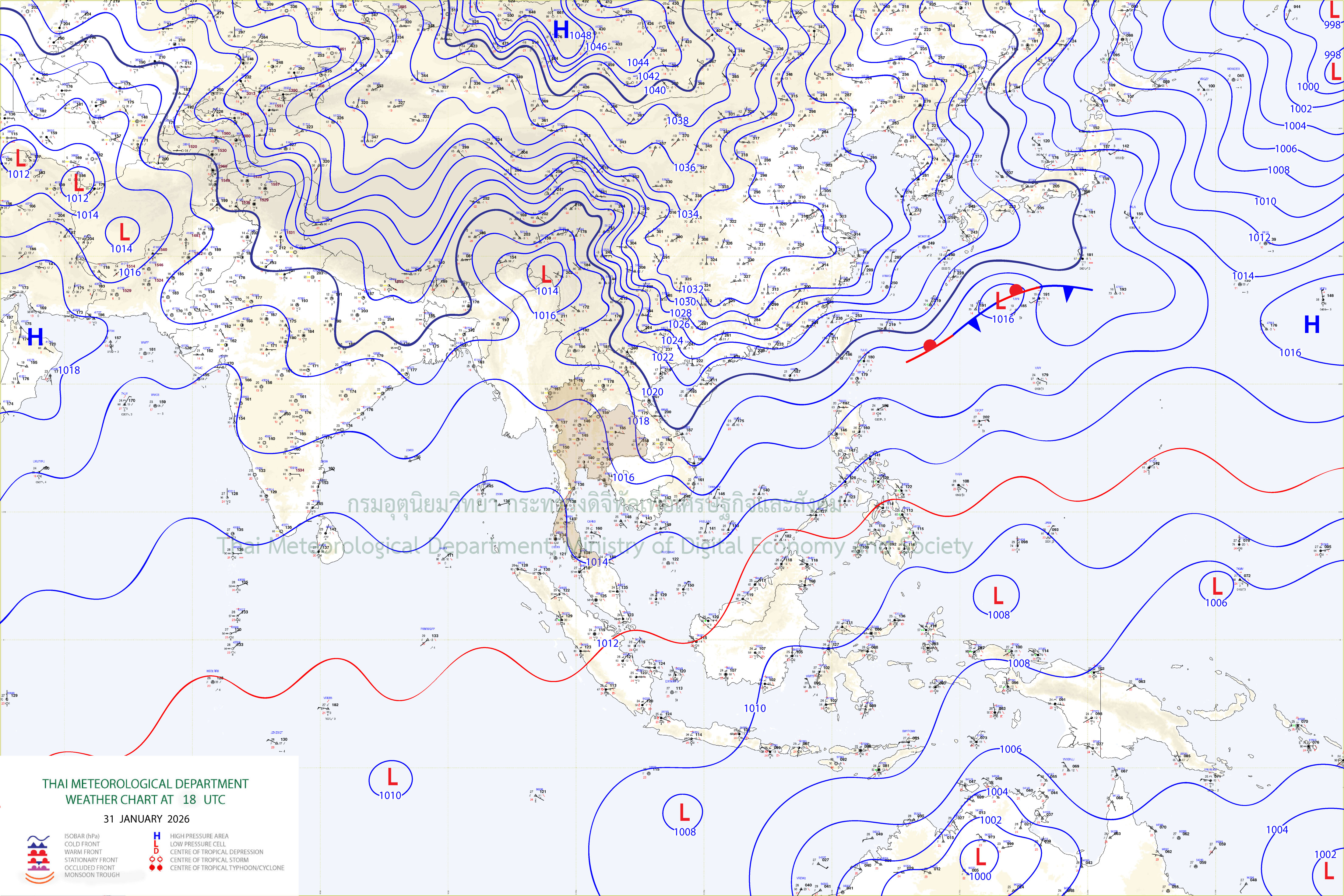 ลักษณะอากาศทั่วไป : พยากรณ์อากาศ 24 ชั่วโมงข้างหน้า บริเวณความกดอากาศสูงหรือมวลอากาศเย็นกำลังปานกลางระลอกใหม่ได้แผ่ลงมาปกคลุมถึงประเทศลาวตอนบนและภาคตะวันออกเฉียงเหนือตอนบนแล้ว คาดว่าจะแผ่ปกคลุมภาคเหนือ ภาคกลาง และภาคตะวันออกในระยะต่อไป ทำให้ภาคตะวันออกเฉียงเหนือมีอุณหภูมิลดลง1-2 องศาเซลเซียส และมีอากาศเย็นถึงหนาว ส่วนภาคอื่นๆ ยังคงมีอากาศเย็นถึงหนาวกับมีหมอกในตอนเช้า และมีหมอกหนาบางพื้นที่ โดยอุณหภูมิจะลดลงเล็กน้อย ขอให้ประชาชนดูแลรักษาสุขภาพเนื่องจากสภาพอากาศที่เปลี่ยนแปลง รวมทั้งเพิ่มความระมัดระวังในการสัญจรผ่านบริเวณที่มีหมอกไว้ด้วย สำหรับภาคใต้ยังคงมีฝนน้อย เนื่องจากมรสุมตะวันออกเฉียงเหนือกำลังอ่อนพัดปกคลุมอ่าวไทยตอนล่างและภาคใต้ตอนล่าง ส่วนคลื่นลมบริเวณอ่าวไทยตอนล่างมีกำลังปานกลาง โดยมีคลื่นสูง 1-2 เมตร อ่าวไทยตอนบนและทะเลอันดามันมีคลื่นสูงประมาณ 1 เมตร ฝุ่นละอองในระยะนี้ ภาคเหนือ ภาคกลาง รวมทั้งกรุงเทพมหานครและปริมณฑล และภาคตะวันออกมีการสะสมของฝุ่นละออง/หมอกควันอยู่ในเกณฑ์ปานกลางถึงค่อนข้างมาก เนื่องจากมีการระบายอากาศอยู่ในเกณฑ์อ่อนถึงไม่ดี ฝุ่นละอองในระยะนี้ ภาคเหนือ ภาคกลาง รวมทั้งกรุงเทพมหานครและปริมณฑล และภาคตะวันออกมีการสะสมของฝุ่นละออง/หมอกควันอยู่ในเกณฑ์ปานกลางถึงค่อนข้างมาก เนื่องจากมีการระบายอากาศอยู่ในเกณฑ์อ่อนถึงไม่ดี