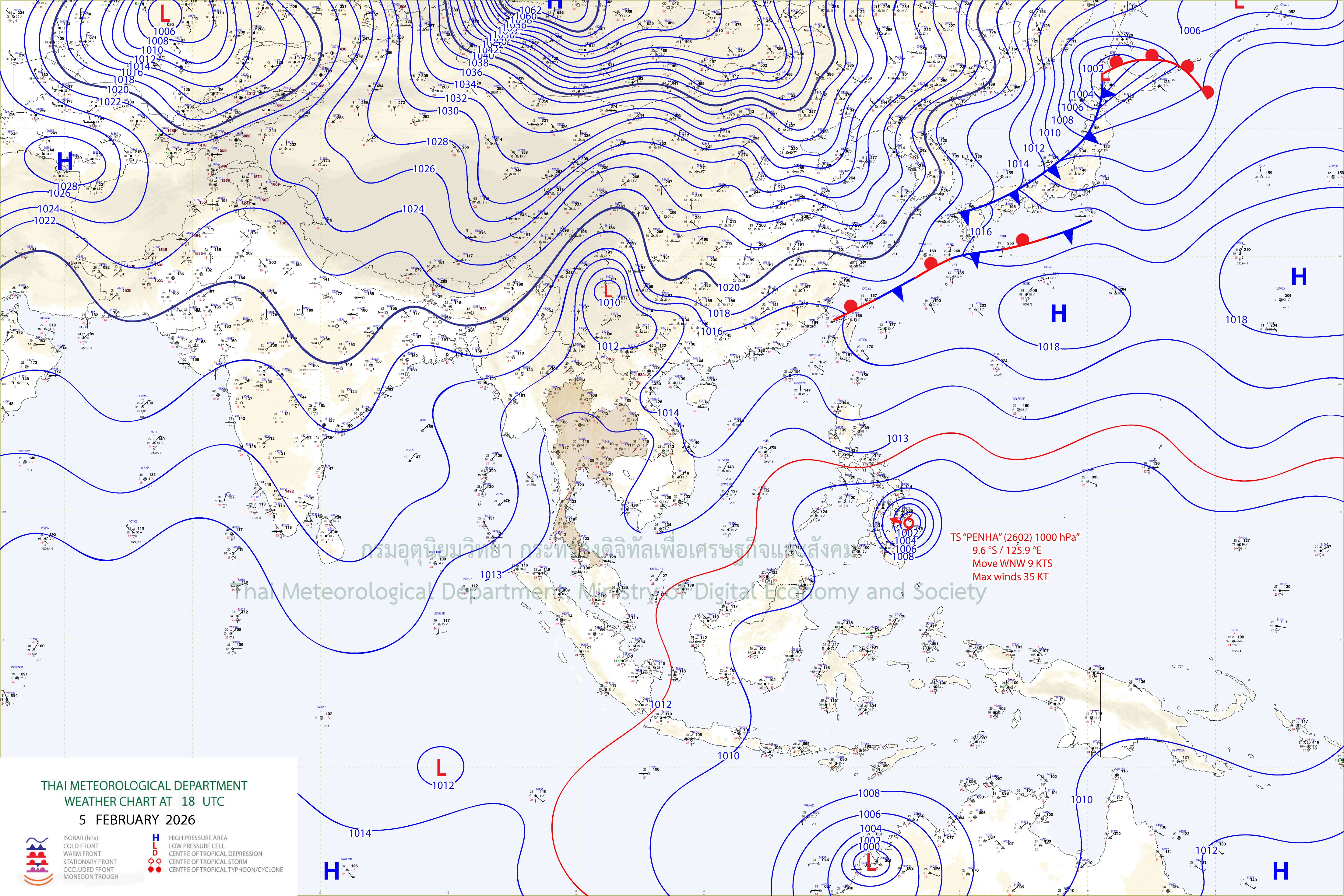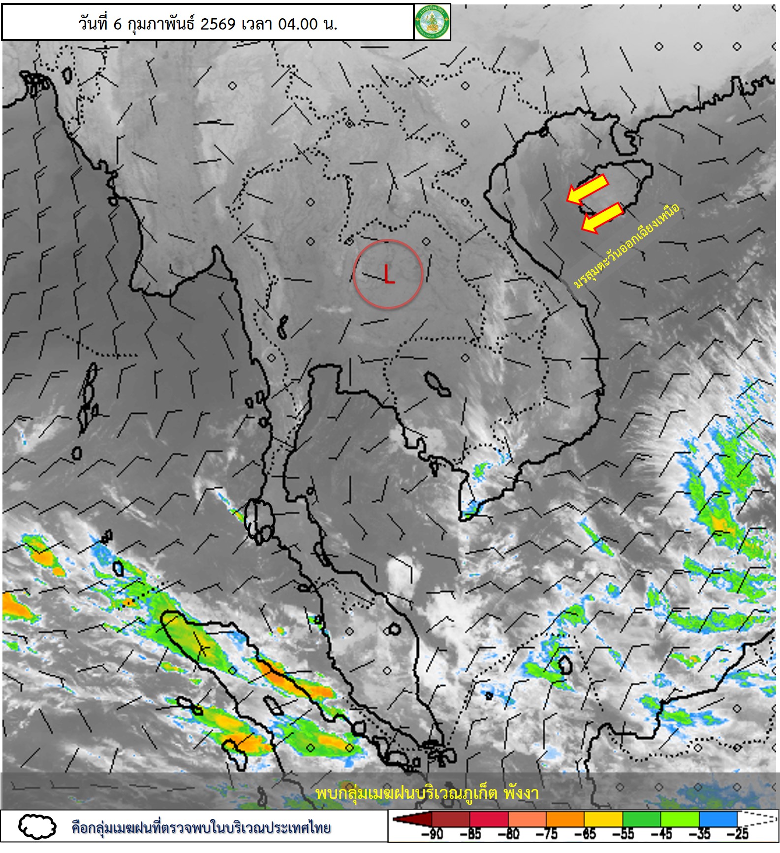 สำหรับภาคใต้ยังคงมีฝนฟ้าคะนองบางแห่ง เนื่องจากมรสุมตะวันออกเฉียงเหนือกำลังปานกลางพัดปกคลุมอ่าวไทยตอนล่าง และภาคใต้ตอนล่าง ส่วนคลื่นลมบริเวณอ่าวไทยตอนล่างมีกำลังปานกลาง โดยมีคลื่นสูง 1-2 เมตร บริเวณที่มีฝนฟ้าคะนองคลื่นสูงมากกว่า 2 เมตร ขอให้ชาวเรือบริเวณอ่าวไทยและทะเลอันดามันเดินเรือด้วยความระมัดระวังไว้ด้วย อนึ่ง ในช่วงวันที่ 8-11 ก.พ. 69 ประเทศไทยตอนบนจะมีฝนฟ้าคะนองเกิดขึ้นในระยะแรก หลังจากนั้นอุณหภูมิจะลดลงกับมีลมแรง เนื่องจากบริเวณความกดอากาศสูงหรือมวลอากาศเย็นกำลังปานกลางถึงค่อนข้างแรงจากประเทศจีนจะแผ่ลงมาปกคลุมประเทศไทยตอนบน และทะเลจีนใต้ ส่งผลทำให้มีลมตะวันออกและลมตะวันออกเฉียงใต้พัดนำความชื้นเข้ามาปกคลุมประเทศไทยตอนบน