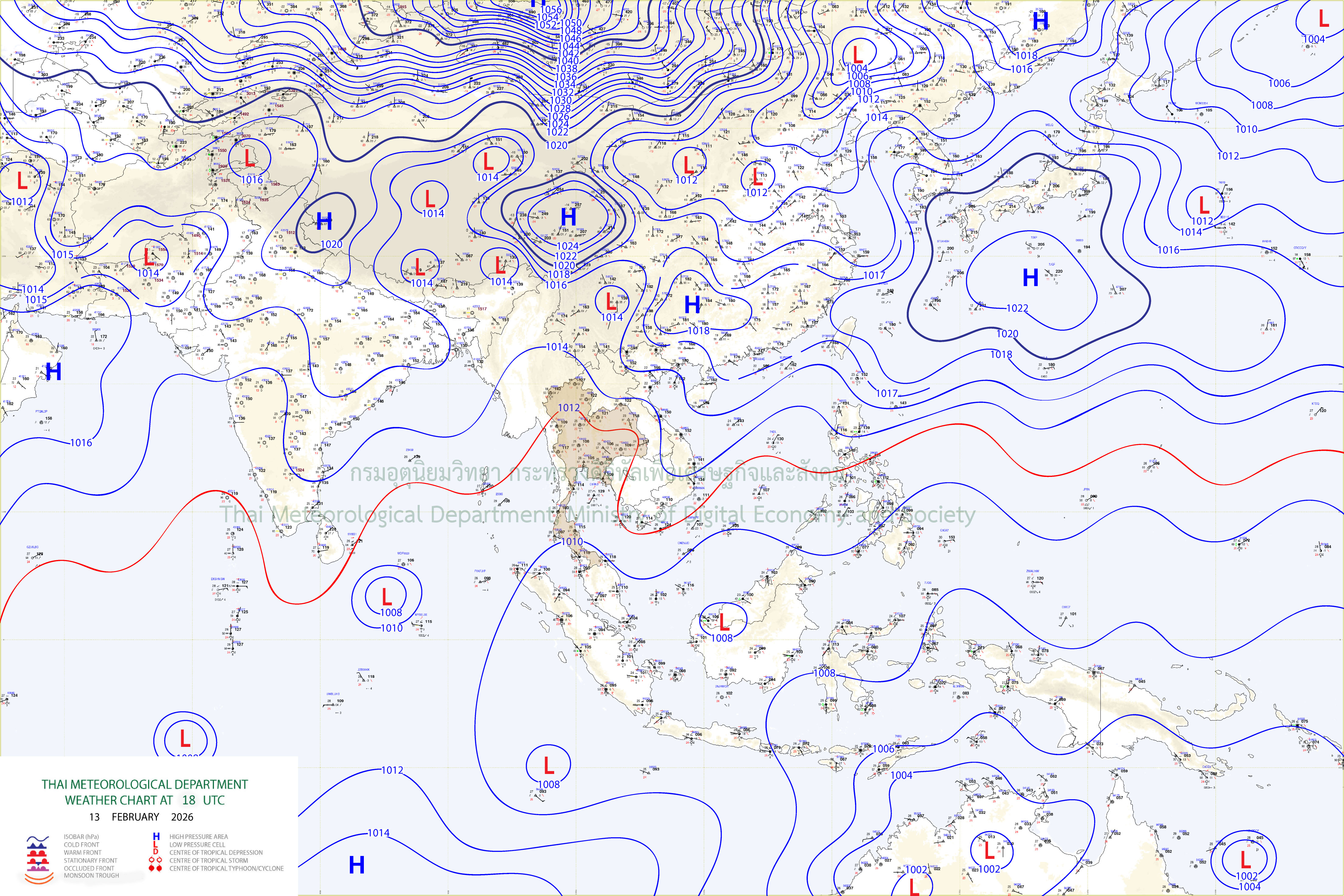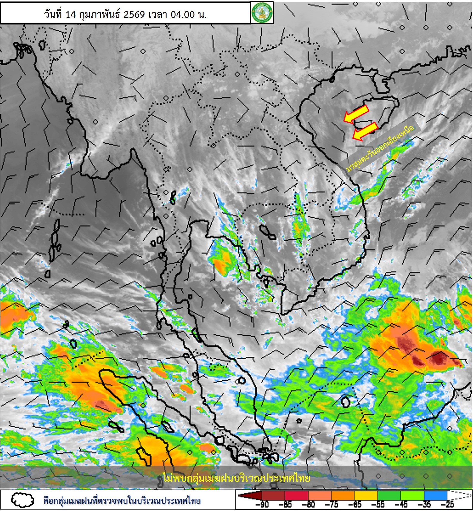 ลักษณะอากาศทั่วไป : พยากรณ์อากาศ 24 ชั่วโมงข้างหน้า ภาคเหนือและภาคตะวันออกเฉียงเหนือยังคงมีอากาศเย็นกับมีหมอกในตอนเช้า ส่วนภาคตะวันออก และภาคกลางรวมทั้งกรุงเทพมหานครและปริมณฑลมีฝนฟ้าคะนองบางแห่ง เนื่องจากบริเวณความกดอากาศสูงหรือมวลอากาศเย็นกำลังอ่อนปกคลุมประเทศไทยตอนบน และทะเลจีนใต้ ส่งผลทำให้มีลมใต้และลมตะวันออกเฉียงใต้พัดนำความชื้นจากอ่าวไทยเข้ามาปกคลุมภาคตะวันออก และภาคกลาง รวมทั้งกรุงเทพมหานครและปริมณฑล ขอให้ประชาชนบริเวณประเทศไทยตอนบนดูแลรักษาสุขภาพเนื่องจากสภาพอากาศที่เปลี่ยนแปลง รวมทั้งเพิ่มความระมัดระวังในการสัญจรผ่านบริเวณที่มีหมอกไว้ด้วย สำหรับภาคใต้มีฝนฟ้าคะนองบางแห่ง เนื่องจากมรสุมตะวันออกเฉียงเหนือพัดปกคลุมอ่าวไทย ภาคใต้ และทะเลอันดามัน ส่วนบริเวณอ่าวไทยตอนล่างมีคลื่นสูง 1–2 เมตร บริเวณที่มีฝนฟ้าคะนองคลื่นสูงมากกว่า 2 เมตร ขอให้ชาวเรือบริเวณอ่าวไทยและทะเลอันดามันเดินเรือด้วยความระมัดระวัง และหลีกเลี่ยงการเดินเรือในบริเวณที่มีฝนฟ้าคะนองไว้ด้วย
