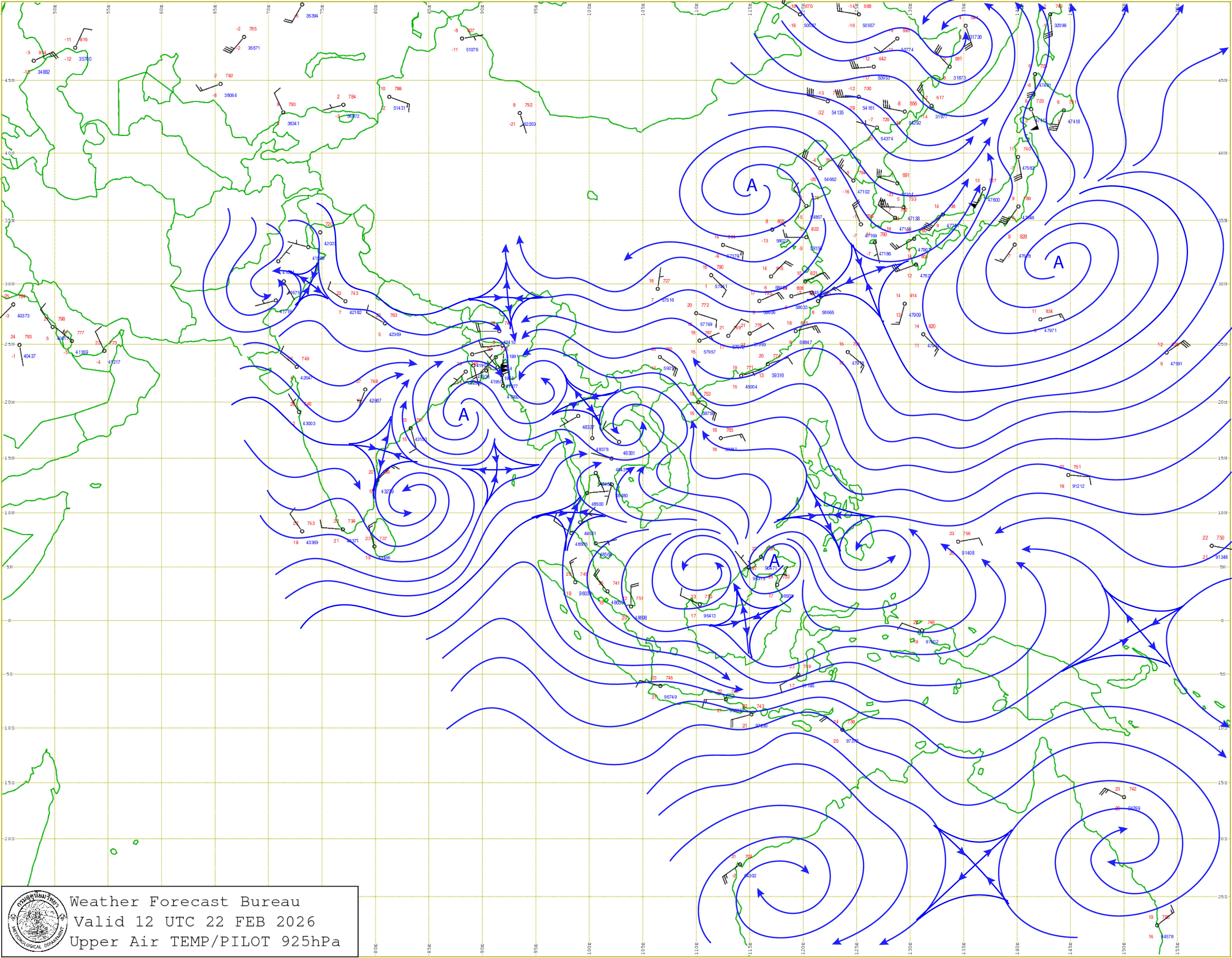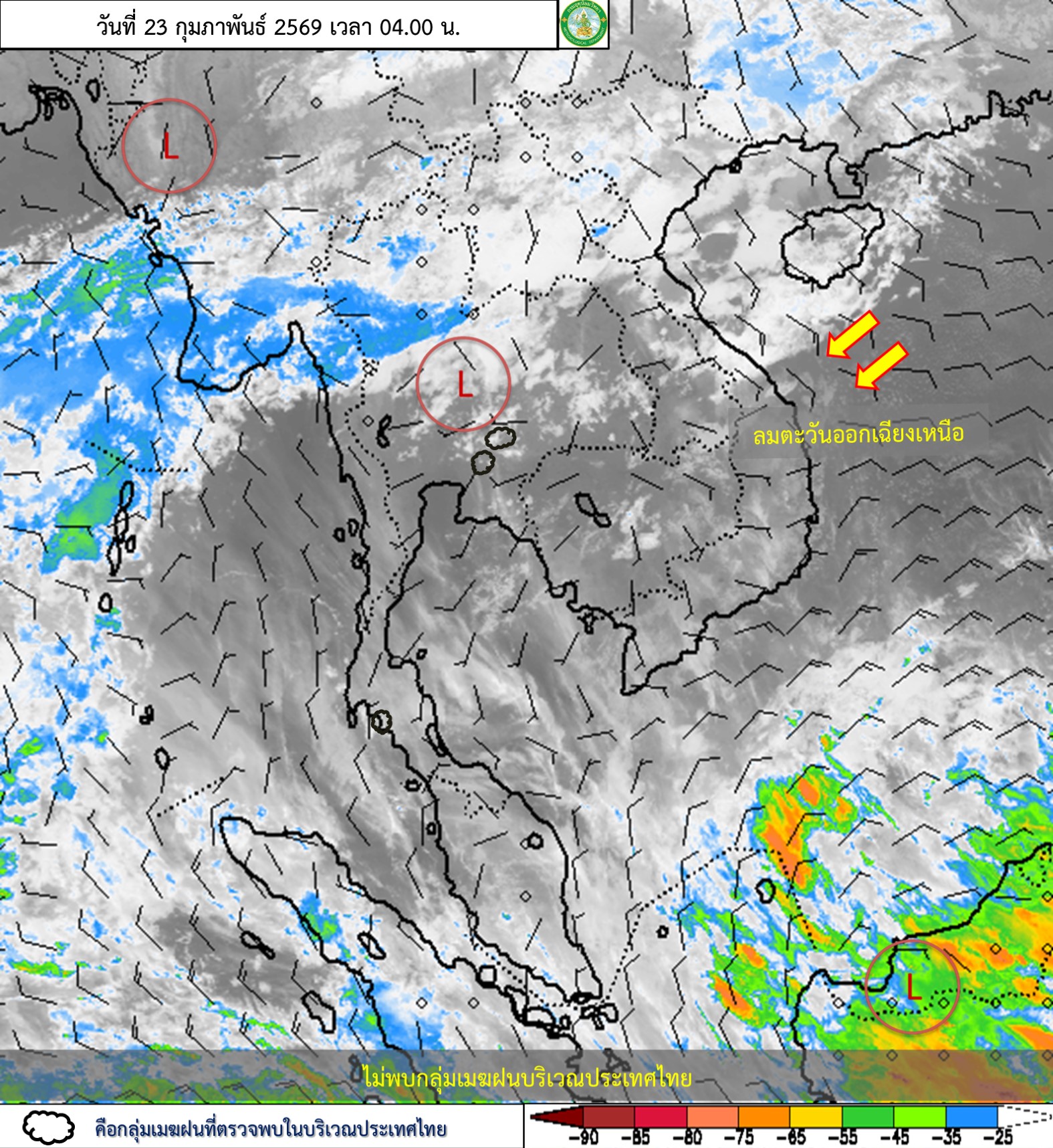 ลักษณะอากาศทั่วไป : พยากรณ์อากาศ 24 ชั่วโมงข้างหน้า ประเทศไทยตอนบนจะมีพายุฤดูร้อนเกิดขึ้น โดยมีลักษณะของพายุฝนฟ้าคะนอง ลมกระโชกแรง รวมถึงฟ้าผ่าที่อาจเกิดขึ้นได้ บางพื้นที่ เนื่องจากบริเวณความกดอากาศสูงหรือมวลอากาศเย็นได้แผ่ลงมาปกคลุมประเทศเวียดนามตอนบนและประเทศจีนตอนใต้แล้ว คาดว่าจะเคลื่อนเข้าปกคลุมภาคตะวันออกเฉียงเหนือตอนบนและทะเลจีนใต้ในวันนี้ ( 23 ก.พ. 69 ) ส่งผลทำให้มีลมใต้และลมตะวันออกเฉียงใต้พัดปกคลุมภาคตะวันออกเฉียงเหนือ ภาคกลาง ภาคตะวันออก และอ่าวไทย ในขณะที่ประเทศไทยตอนบนมีอากาศร้อน ขอให้ประชาชนบริเวณดังกล่าวระวังอันตรายจากพายุฤดูร้อน โดยหลีกเลี่ยงการอยู่ในที่โล่งแจ้ง ใต้ต้นไม้ใหญ่ สิ่งปลูกสร้าง และป้ายโฆษณาที่ไม่แข็งแรง สำหรับเกษตรกรควรเสริมความแข็งแรงให้ไม้ผล และเตรียมการป้องกันความเสียหายที่อาจเกิดขึ้นกับผลผลิตทางการเกษตรและสัตว์เลี้ยง รวมทั้งดูแลรักษาสุขภาพเนื่องจากสภาพอากาศที่ร้อนไว้ด้วย